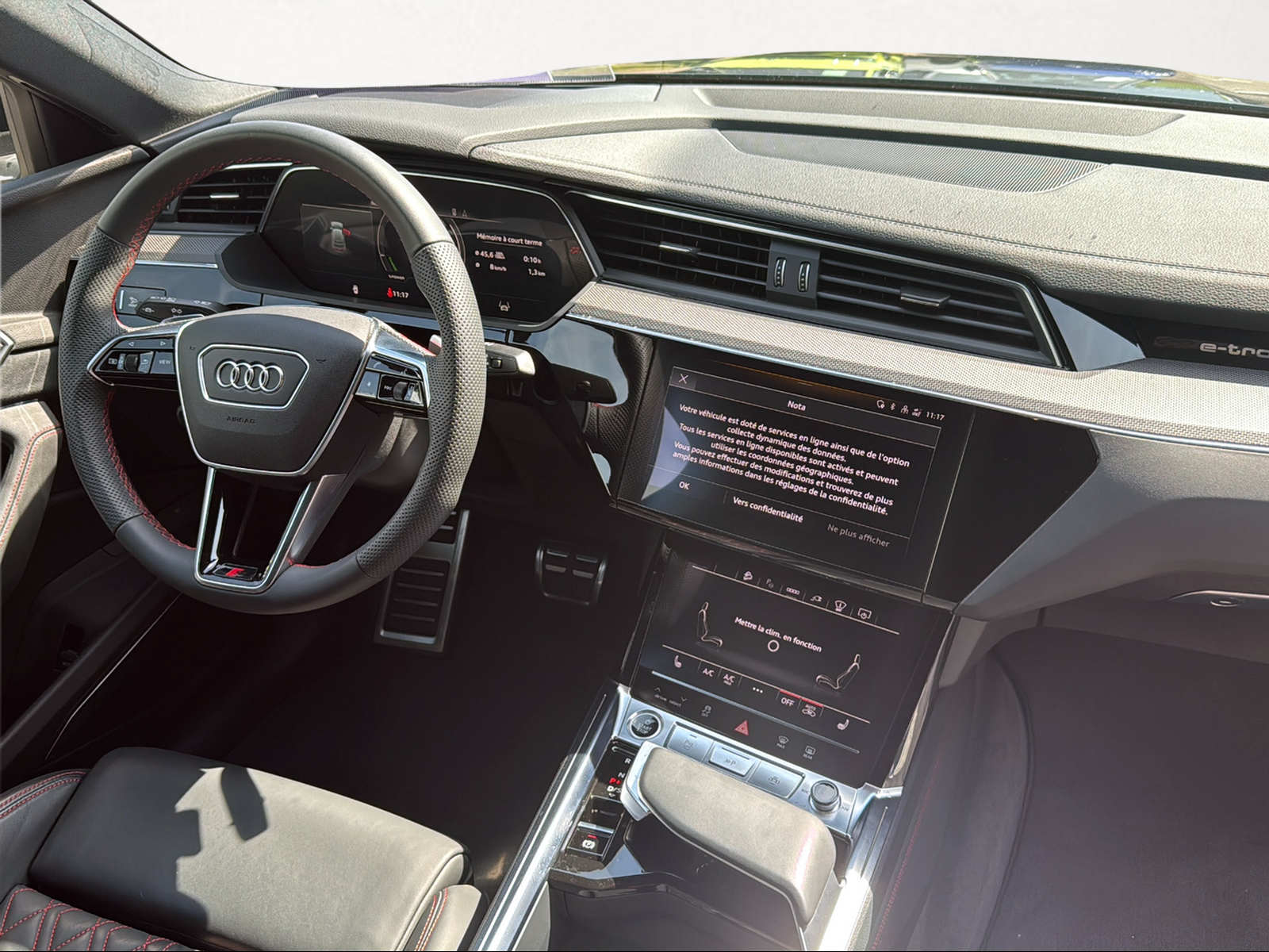 Équipement standard 3-Punkt-Sicherheitsgurte auf allen Plätzen Adaptive air suspension sport Airbag: Airbag Beifahrer deaktivierbar Airbag: Airbags latéraux à lavant et système dairbags de tête Assist: Aide au stationnement plus avec affichage de lenvironnement Assist: Audi pre sense basic Assist: Audi pre sense front Assist: Kamerabasierte Verkehrszeichenerkennung Assist: Spurverlassenswarnung inkl. Notfallassistent Assist: Système de régulateur de vitesse plus limiteur de vitesse Audi connect Notruf & Service mit Audi connect Remote & Control Aussenspiegel elektrisch einstell- und beheizbar Baguettes de seuil avec inserts en aluminium à lavant et à larrière Boîtier de rétroviseur extérieur en noir Cadre unique avec structure en nid d'abeille distinctive en gris Hekla avec masque Capot de coffre à ouverture et fermeture électriques Chargeur embarqué jusqu'à 11 kW (AC) Clima: Climatisation à larrêt Climat: climatisation automatique confort 2 zones Câble de charge mode 3 pour charge publique jusqu'à 22 kW Dachhimmel in Stoff schwarz Decór: Dessus du tableau de bord et éléments intérieurs inférieurs en similicuir Diffuseur arrière au design sportif et distinctif en noir brillant Décor: Coutures colorées en rouge Audi Sport Décor: Inserts en aluminium dans les moulures de seuil de porte avant et arrière, éclairés, Décor: Touches de commande en noir brillant avec retour haptique et aspect aluminium intérieur Décor: structure de structure carrée en carbone incrustations Elektronisches Stabilitäts-Programm (ESP) Entfall Leistungs- / Technologie-Schriftzug Frontscheibe in Wärmeschutz- und Akustikverglasung Funkschlüssel, ohne Safelock Garantie: 2 Jahre ohne Kilometerbegrenzung (ab 1. Inv.) Getriebe: Direktantrieb, kein Getriebe Heckscheiben-Wisch-/Waschanlage Innenspiegel automatisch abblendend, rahmenlos Lackierung: Uni-Lackierung Lenkrad: Doppelspeichen-Lederlenkrad mit Multifunktion und Schaltwippen Licht: Drittes Bremslicht Licht: Nebelschlussleuchte Lumière: Lumière de projection Singleframe Lumière: Phare à LED avec lentille Lumière: Phares à LED avec préparation pour des fonctions d'éclairage supplémentaires Lumière: Éclairage de seuil à LED avec projection à lavant et à larrière Media: Audi connect Navigation & Infotainment Media: Audi music interface Media: Bang & Olufsen Premium Soundsystem mit 3D Klang Media: Bluetooth-Schnittstelle Media: Digitaler Radioempfang Media: MMI Navigationssystem Plus mit MMI touch Mèdias: Smartphone Interface Pack: Pack optique noir plus Pack: Pack Éclairage dambiance plus Pedalerie und Fussstütze in Edelstahl Peinture: Ligne de fond en pleine peinture (couleur carrosserie) Prise de recharge CCS de type 2 Roues: Jantes Audi Sport, structure aérodynamique à 5 branches, noir métallisé Räder: Reifendruck-Kontrollanzeige Räder: Reifenreparatur-Set (Tire Fit) Scheiben seitlich und hinten in Wärmeschutzverglasung Sitze: Kopfstützen hinten (3 Stück) Sitze: Vordersitze heizbar Sitze: Vordersitze manuell einstellbar Sièges: Fixation ISOFIX pour siège enfant et Top Tether pour la banquette arrière Sièges: Fixation de siège enfant ISOFIX pour le siège passager avant Système davertissement acoustique du véhicule (AVAS) Tissu: Combinaison microfibres Dinamica Frequenz/cuir avec gaufrage S Verbandmaterial,Warndreieck und Warnveste Verrouillage centralisé à télécommande Volant: Volant cuir contour sport, trois branches, aplati en bas, avec multifonction et palettes de Wegfahrsperre elektronisch Étriers de frein peints en rouge, 18 pouces