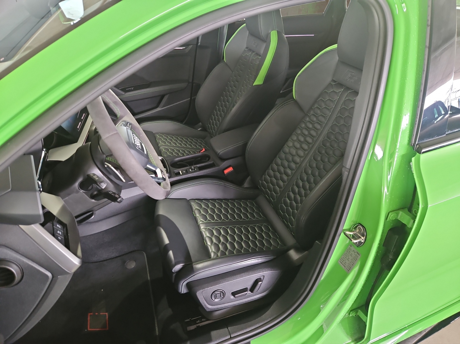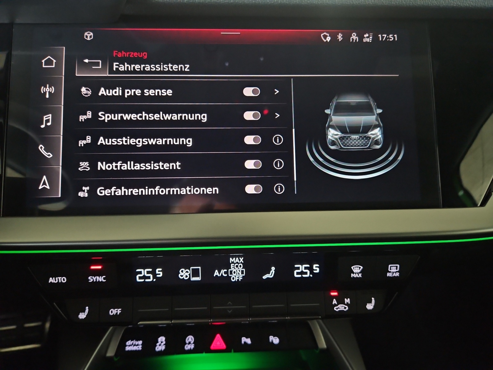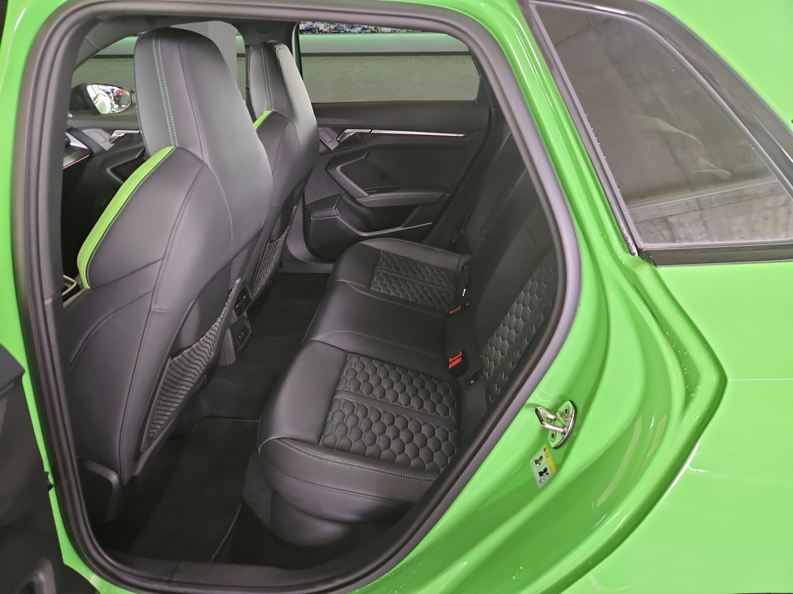 Assist: Adaptiver Geschwindigkeitsassistent Assist: Audi pre sense basic Assist: Spurwechselwarnung mit Ausstiegswarnung und Querverkehrassistent hinten Fahrwerk: Adaptives Fahrwerk mit Audi drive select Fahrwerk: RS-Bremsanlage mit Bremssätteln rot Frontscheibe in Wärmeschutzverglasung Innenspiegel automatisch abblendend, rahmenlos Komfortschlüssel ohne Safelock Lenkrad: Lederlenkrad im 3-Speichen-Design mit Multifunktion plus und Schaltwippen Licht: Abgedunkelte Matrix LED-Scheinwerfer mit dynamischem Blinklicht Media: Audi Smartphone Interface Media: Audi connect Navigation & Infotainment plus Media: USB-Anschlüsse mit Ladefunktion im Fond Paket: Assistenzpaket mit MMI Navigation plus Paket: Optikpaket schwarz plus mit Singleframe in Wagenfarbe Privacy-Verglasung (Scheiben abgedunkelt) RS-Exterieurumfänge in schwarz glänzend Räder: Räder, 5-Y-Speichen, schwarz mit Grafikdruck Sitze: 4-Wege-Lendenwirbelstütze für die Vordersitze Sitze: Fahrersitz elektrisch verstellbar Türen: Komfortöffnung Gepäckraumklappe