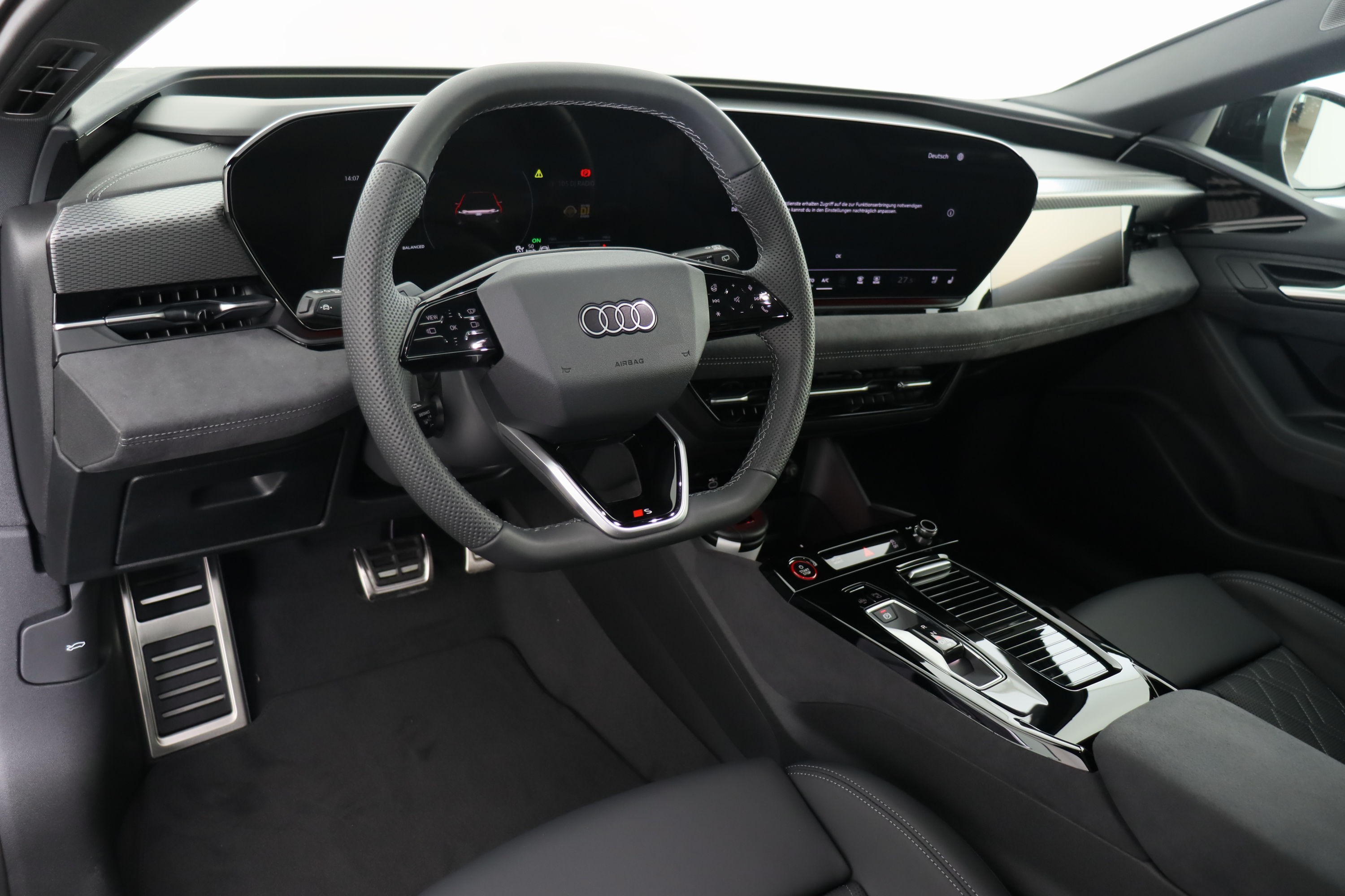 Airbag: Airbag Beifahrer deaktivierbar Airbag: Airbag Fahrer und Beifahrer Airbag: Seitenairbag vorn, mit Kopfairbag und Interaktionsairbag vorn Akustikverglasung Türscheiben vorn Assist: Adaptiver Geschwindigkeitsassistent Assist: Aufmerksamkeits- und Müdigkeitserkennung Assist: Ausweichassistent und Abbiegeassistent Assist: Einparkhilfe plus mit Distanzanzeige Assist: Kamerabasierte Verkehrszeichenerkennung Assist: Kreuzungsassistent Assist: Notbremsassistent vorn Assist: Parkassistent plus Assist: Querverkehrassistent vorn Assist: Spurverlassenswarnung inkl. Notfallassistent Assist: Traktionskontrolle Assist: Verkehrszeichenbasierter Geschwindigkeitsbegrenzer Audi connect Notruf & Service mit Audi connect Remote & Control Audi virtual cockpit plus Aussenspiegel elektrisch einstell-, beheiz- und anklappbar, beidseitig automatisch abblendend Aussenspiegelgehäuse Chromoptik matt silber Dachhimmel in Stoff schwarz Dekor: Akzentflächen und Bedientasten schwarz glänzend Dekor: Dekoreinlagen Aluminium matt gebürstet mit Linearprägung anthrazit Dekor: Instrumententafel-Oberseite schwarz mit Kontrastnaht Dekor: Interieurelemente oben und unten Kunstleder plus Einstiegsleisten mit Aluminiumeinlagen, vorne, beleuchtet, mit S-Schriftzug Elektrische Fensterheber vorne Elektronisches Stabilitäts-Programm (ESP) Fahrwerk: Adaptives S-Luftfederfahrwerk Fensterzierleisten Aluminiumoptik Fussmatten vorne und hinten Garantie: Audi Garantie 2 Jahre ohne Kilometerbegrenzung (ab 1. Inv.) Gepäckraumklappe elektrisch öffnend und schliessend Getriebe: Direktantrieb, kein Getriebe Innenspiegel automatisch abblendbar Interieur mit Sportsitzen, Leder/Kunstleder-Kombination mit S-Prägung Klima: 3-Zonen-Klimatisierungsautomatik Klima: Automatische Umluftregelung Klima: Elektrische Luftzusatzheizung Komfortschlüssel ohne Safelock Lackierung: Uni-Lackierung Ladekabel Mode 3 für öffentliches Laden bis 22 kW Lenkrad: Lenkradapplikation Chromoptik, S-Emblem, Lenkradgriffe perforiertes Leder und Kontrastnaht Lenkrad: Lenkradeinstellung manuell Lenkrad: Sportlederlenkrad, 3-Speichen, oben und unten abgeflacht mit Multifunktion und Schaltwippen Licht: LED-Scheinwerfer plus Licht: Projektionsleuchte in den Aussenspiegeln Licht: Tagesfahrlicht mit Assistenzfahrlicht u.Coming- u. Leaving-home Funktion automatisch Media: Audi Application Store und Smartphone-Interface Media: Audi connect Navigation & Infotainment Media: Digitaler Radioempfang Media: FOD Funktionen online verfügbar Media: MMI experience plus Media: USB-Schnittstellen mit erhöhter Ladeleistung Modellkennzeichnung am Heck On-board-Ladegerät bis 11 kW (AC) Paket: Ambiente Lichtpaket Paket: Assistenzpaket Fahren und Parken Pedalerie und Fussstütze in Edelstahl Räder: Reifendruck-Kontrollanzeige Räder: Reifenreparatur-Set (Tire Fit) Räder: Räder Audi Sport, 5-Speichen-Tripod, schwarz metallic, glanzgedreht Scheinwerfer-Reinigungsanlage Schlüssel für Schliesssystem mit Fernbedienung Sitze: 4-Wege-Lendenwirbelstütze für die Vordersitze Sitze: Kindersitzbefestigung i-Size auf der Beifahrerseite und i-Size und Top Tether Sitze: Rücksitzbank ungeteilt, Lehne geteilt umlegbar (dreiteilig) mit Mittelarmlehne Sitze: Vordersitze elektrisch verstellbar Sitze: Vordersitze heizbar Telefonablage mit induktiver Ladefunktion Türen: Türgriffe in Wagenfarbe Verbandmaterial,Warndreieck und Warnveste Vorbereitung für Anhängevorrichtung Vorbereitung für intelligente Ladefunktionen Wegfahrsperre elektronisch Wärmeschutz- und Akustikverglasung Frontscheibe Zentralverriegelung mit Fernbedienung
