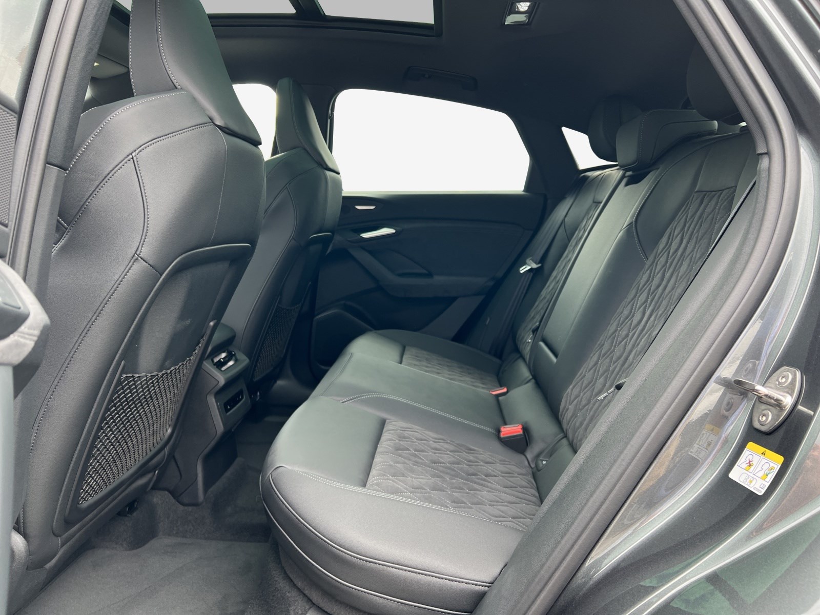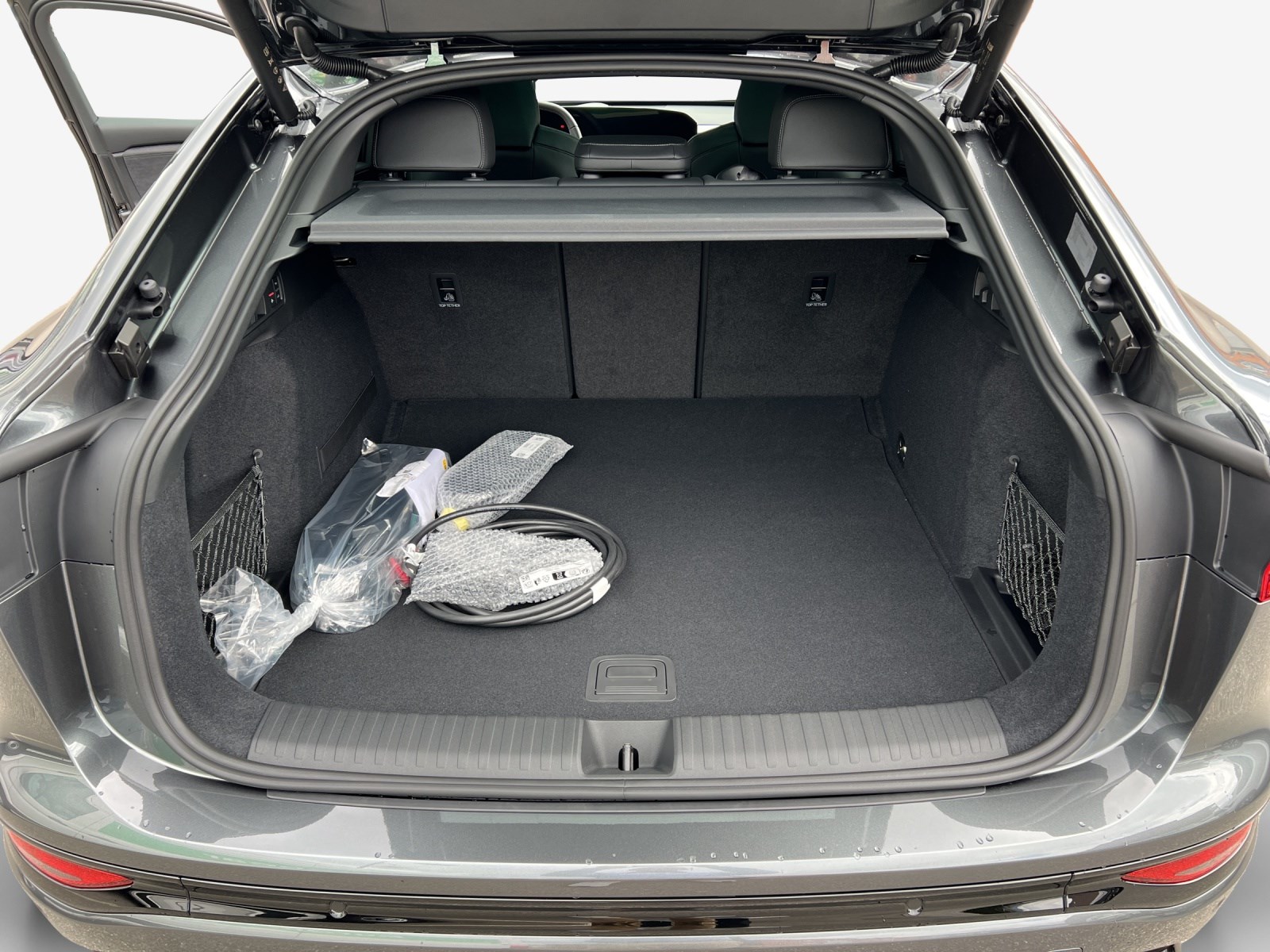 Airbag: Airbag Beifahrer deaktivierbar Airbag: Airbag Fahrer und Beifahrer Airbag: Seitenairbag vorn, mit Kopfairbag und Interaktionsairbag vorn Akustisches Fahrzeug-Warnsystem (AVAS) Assist: Adaptiver Geschwindigkeitsassistent Assist: Aufmerksamkeits- und Müdigkeitserkennung Assist: Ausweichassistent und Abbiegeassistent Assist: Einparkhilfe plus mit Distanzanzeige Assist: Kamerabasierte Verkehrszeichenerkennung Assist: Kreuzungsassistent Assist: Notbremsassistent vorn Assist: Parkassistent plus Assist: Spurverlassenswarnung Assist: Spurwechsel- und Ausstiegswarnung, Querverkehrassistent hinten und Abbiegeassistent hinten Assist: Traktionskontrolle Assist: Verkehrszeichenbasierter Geschwindigkeitsbegrenzer Audi connect Notruf & Service mit Audi connect Remote & Control Audi virtual cockpit plus Aussenspiegel elektrisch einstell-, beheiz- und anklappbar, beidseitig automatisch abblendend Aussenspiegel in Wagenfarbe Dachhimmel Stoff, Farbe felsgrau Dekor: Dekoreinlage Feinlack vulkangrau Dekor: Instrumententafel-Oberseite schwarz mit Kontrastnaht Dekor: Interieurelemente oben und unten Kunstleder Einstiegsleisten mit Aluminiumeinlegern vorn Elektrische Fensterheber vorne Elektronisches Stabilitäts-Programm (ESP) Fahrwerk: Komfortfahrwerk Fensterzierleisten schwarz Fussmatten vorne und hinten Garantie: Audi Garantie 2 Jahre ohne Kilometerbegrenzung (ab 1. Inv.) Garantie: Audi Swiss Service Package + (ASSP+) Getriebe: Direktantrieb, kein Getriebe Innenspiegel automatisch abblendbar Interieur mit Normalsitzen, Stoff schwarz Klima: 3-Zonen-Klimatisierungsautomatik Klima: Automatische Umluftregelung Klima: Elektrische Luftzusatzheizung Komfortmittelarmlehne vorne Komfortschlüssel ohne Safelock Lackierung: Kontrastlackierung Lackierung: Uni-Lackierung Magnetgrau Ladekabel Mode 3 für öffentliches Laden bis 22 kW Ladeleistung bis 270 kW (DC) Lenkrad: Doppelspeichen-Lederlenkrad mit Multifunktion und Schaltwippen Lenkrad: Lenkrad längs- und höhenverstellbar Lenkrad: Lenkrad mit Applikation in Chromoptik Lenkrad: Lenkradapplikation Chromoptik Licht: Fernlicht-Assistent Licht: LED-Heckleuchten pro Licht: LED-Scheinwerfer plus Licht: Projektionsleuchte in den Aussenspiegeln Licht: Tagesfahrlicht mit Assistenzfahrlicht u.Coming- u. Leaving-home Funktion automatisch Media: Audi Application Store und Smartphone-Interface Media: Audi connect Navigation & Infotainment Media: Digitaler Radioempfang Media: FOD Funktionen online verfügbar Media: MMI experience plus Media: Telefonablage mit induktiver Ladefunktion Media: USB-Anschlüsse mit Ladefunktion in erster und zweiter Sitzreihe Modellkennzeichnung am Heck On-board-Ladegerät bis 11 kW (AC) Paket: Ambiente Lichtpaket Paket: Klimatisierungspaket Winter Räder: Reifendruck-Kontrollanzeige Räder: Reifenreparatur-Set (Tire Fit) Räder: Räder, 10-Speichen Scheiben seitlich und hinten in Wärmeschutzverglasung Scheinwerfer-Reinigungsanlage Sitze: Kindersitzbefestigung i-Size auf der Beifahrerseite und i-Size und Top Tether Sitze: Rücksitzbank ungeteilt, Lehne geteilt umlegbar (dreiteilig) mit Mittelarmlehne Sitze: Vordersitze manuell einstellbar Türen: Gepäckraumklappe elektrisch öffnend und schliessend Türgriffe aussen in Wagenfarbe Verbandmaterial,Warndreieck und Warnveste Vorbereitung für Anhängevorrichtung Vorbereitung für intelligente Ladefunktionen Wegfahrsperre elektronisch Wärmeschutz- und Akustikverglasung Frontscheibe Zentralverriegelung mit Fernbedienung
