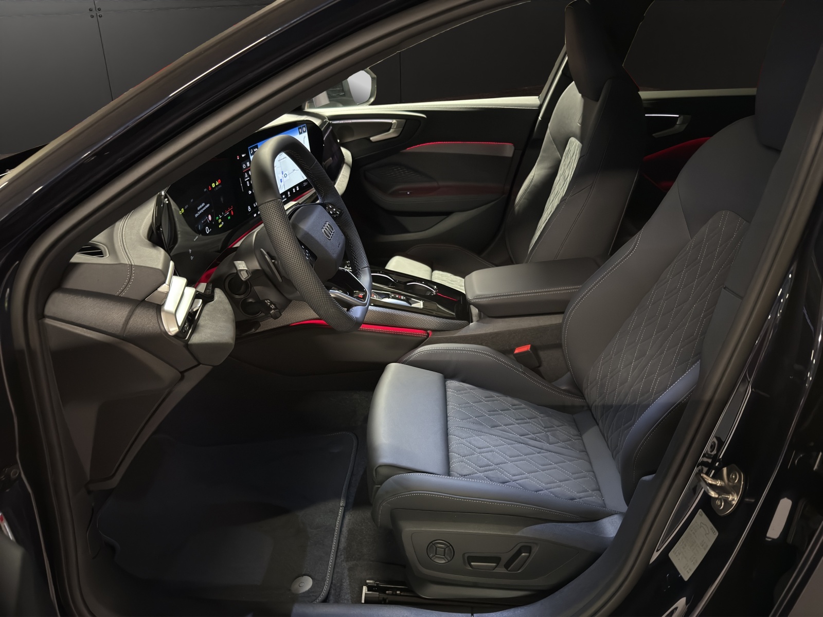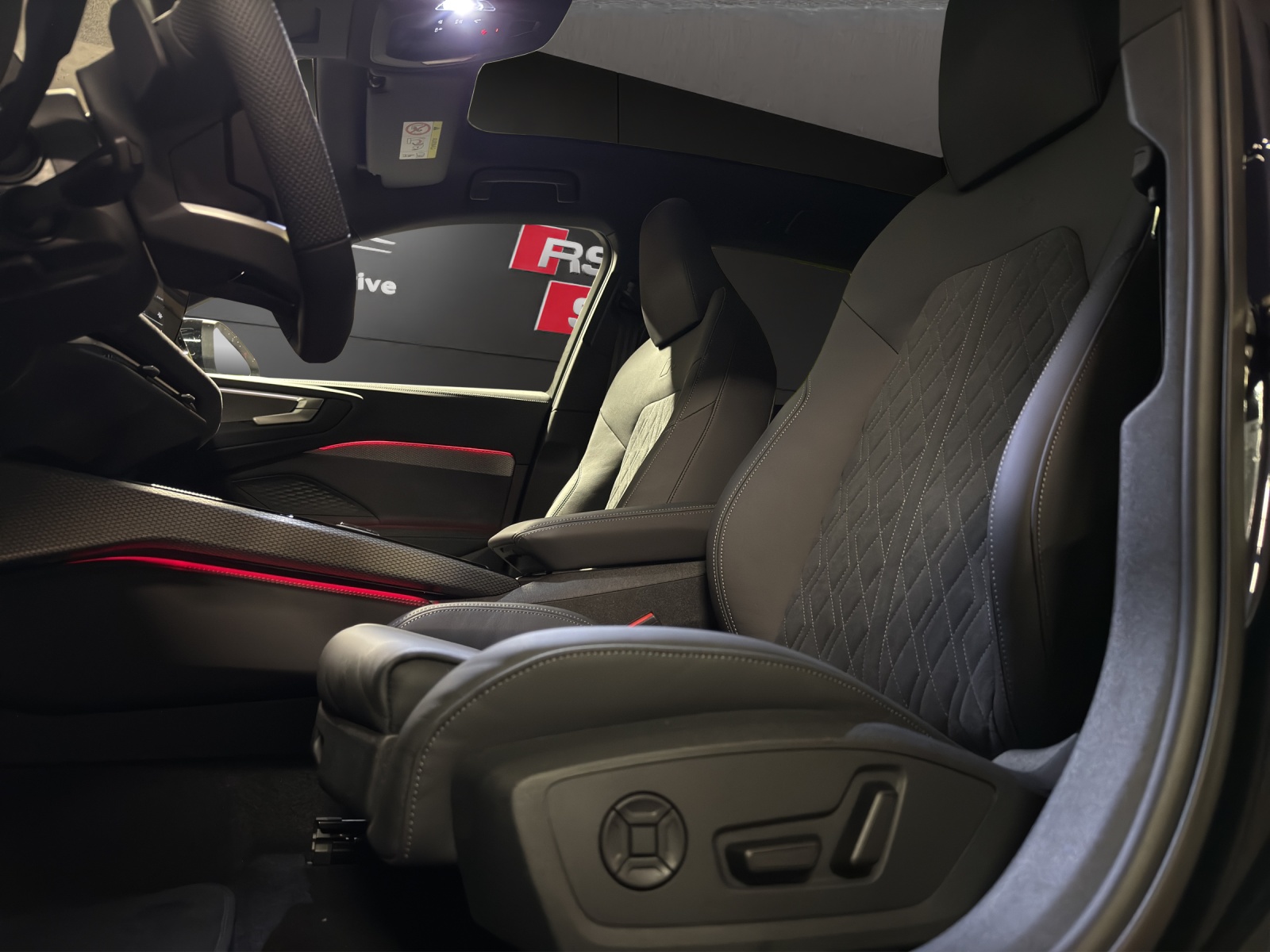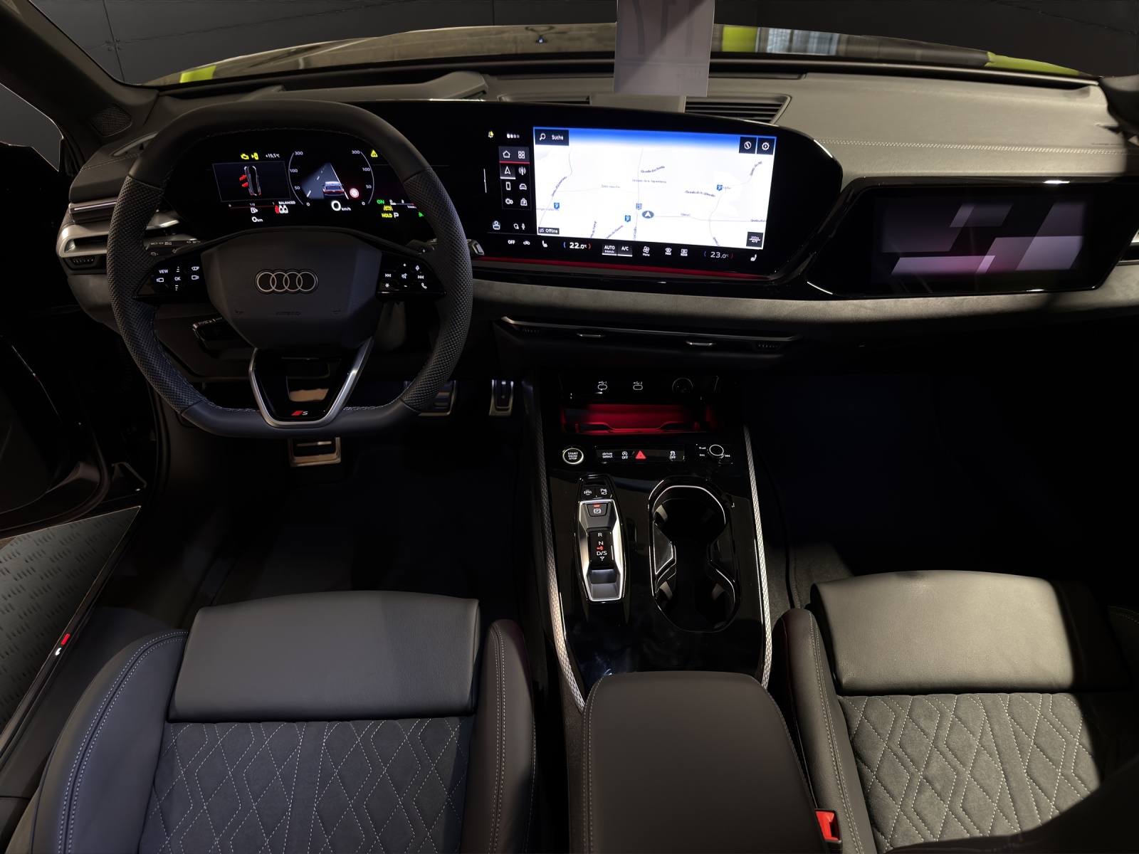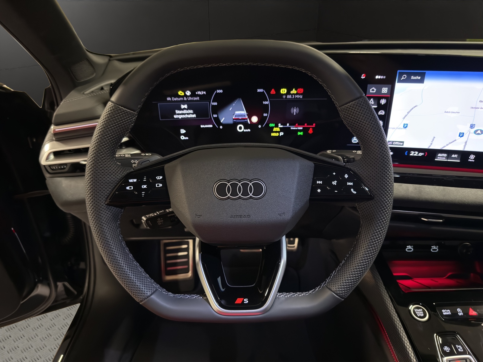 [5U] bleu firmament métal [AI1] Sièges: Siège conducteur et rétroviseur extérieur avec fonction de mémoire [79H] Assist: Avertisseur de changement de voie et de sortie, alerte de trafic transversal à l’arrière - et assistant de changement de direction à l’arrière [5P2] Détection des passagers à l’arrière [GB1] Support LTE pour Audi phone box [F19] Roues: Jantes Audi Sport, design multibranches en S, noir métallisé, finition brillante - Taille 8,5 J x 20, pneus 245/35 R20 [A41] Audi Swiss Service Package+
