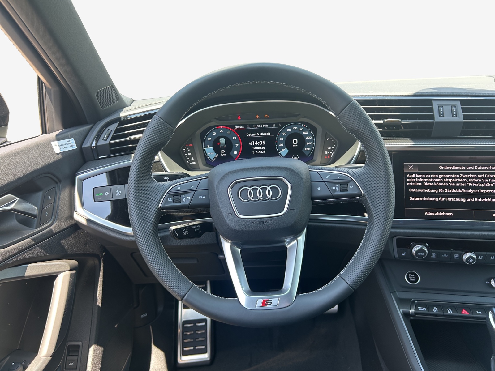 ABS, EBD répartiteur électronique de la Airbag conducteur et passager Airbag passager désactivable Airbag: Airbags rideaux pour la tête Appel d'urgence juridique Assist: Assistance de démarrage en côte Assist: Avertissement de changement de trace Assist: Avertissement de sortie de voie Assist: Contrôle de distance de parcage AR Assist: Détection de distraction et de fatigue Assist: Reconnaissance des panneaux de Audi connect Navigation & Infotainment plus Audi connect Remote & Controll Audi connect appel d'urgence Audi connect appel d'urgence & service Baguettes de seuil de porte avec inserts en aluminium, avant, éclairées, avec logo S Boîte: automatique S tronic à 7 vitesses Capot de coffre à ouverture et fermeture électriques Ceintures de sécurité à 3 points à toutes les places Combiné d'instruments numériques Décor: incrustations d'argent micrométalliques Décor: surface d'accent dans le tableau de bord, noir mat Détecteur de luminosité et de pluie Essuie-glace AR avec lave-glace Fermeture de sécurité électrique pour Fixation ISOFIX pour siège enfant Fixation de siège enfant ISOFIX pour le siège passager avant Frein de parc électronique Garantie: 2 ans / kilométrage illimité Garniture de toit en tissu noir Lumière: 3ème feu de stop Media: Bluetooth interface Media: Récepteur digitale de la radio (DAB) Protection du bord du seuil de chargement en acier inoxydable Roues: roues en aluminium coulé - 18 pouces - style 5 branches en V (design S) Route: Affichage du contrôle de la pression Rétroviseur int. avec réglable Rétroviseurs extérieurs droite et gauche Set de réparation pour les pneus Sigle posterieur (Logo & Modèle) Sièges: Banquette arrière plus Suspension: Châssis sportif Tissu: Equipement en tissu Trousse de premiers secours et triangle Verrouillage central avec télécommande Volant: volant en cuir à 3 branches avec multifonction plus