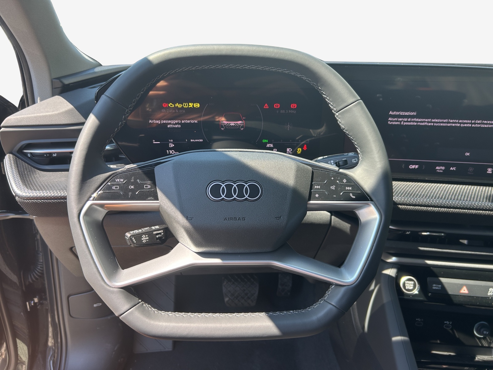 Airbag laterali anteriori, con airbag per la testa e airbag interattivo anteriore Airbag: Airbag conducente e passeggero anteriore con airbag disattivabile sul lato del passeggero Alzacristalli anteriori elettrici Assist: Assistente di frenata d’emergenza anteriore Assist: Assistente per il traffico trasversale anteriore Assist: Assistente per manovre di schivamento e assistente di svolta Assist: Elektronik Controllo della trazione Assist: Limitatore di velocità basato sulla segnaletica stradale Assist: Riconoscimento dei segnali stradali mediante telecamera Assist: Sistema di rilevamento della stanchezza e delle distrazioni Audi connect Navigation & Infotainment Audi connect chiamata d’emergenza e assistenza con mit Audi connect Remote & Control Audi virtual cockpit plus Barre portapacchi in alluminio Cambio: S tronic automatico a 7 velocità Cassetta pronto soccorso,triangolo di segnalazione e luci di emergenza Chiave telecomando, senza Safelock Chiusura centralizzata con telecomando Cielo in tessuto, colore grigio roccia Decor: Accenti e tasti di comando neri opachi Decor: Elementi interni superiori in tessuto Impressum Decor: Inserti decorativi con struttura laser neri Decor: Look in alluminio negli interni Denominazione del modello sulla parte posteriore Finestrini laterali e posteriori atermici Garanzia: 3 anni o 100'000 km Impianto di scarico standard Listelli sottoporta con inserti in alluminio anteriori Luce: Luci diurne con luce di assistenza e funzione coming home/leaving home automatiche Media: Audi phone box light Media: Audi sistema di Sound Media: Porte USB con funzione di ricarica nella prima e seconda fila di sedili Media: Ricezione radio digitale Modanature dei finestrini in look alluminio Parabrezza in vetro atermico e acustico Poggiabraccia centrale anteriore Porte: Comoda apertura del cofano del bagagliaio Programma elettronico di stabilità ESP Retrovisori esterni in colore della carrozzeria Route: Indicatore di controllo della pressione dei pneumatici Sedili: Fissaggio per seggiolino per bambini i-Size sul lato passeggero e i-Size e Top Tether Sedili: Sedili anteriori regolabili manualmente Servosterzo elettromeccanico Set riparazione pneumatici (Tire Fit) Sistema antibloccaggio delle ruote (ABS) Sistema di avvertimento acustico del veicolo Tappetini anteriori e posteriori Tappezzeria: Tessuto Passage Verniciatura: Verniciatura Uni Volante in pelle a razze doppie con multifunzione e bilancieri Volante: Applicazione sul volante in look cromato