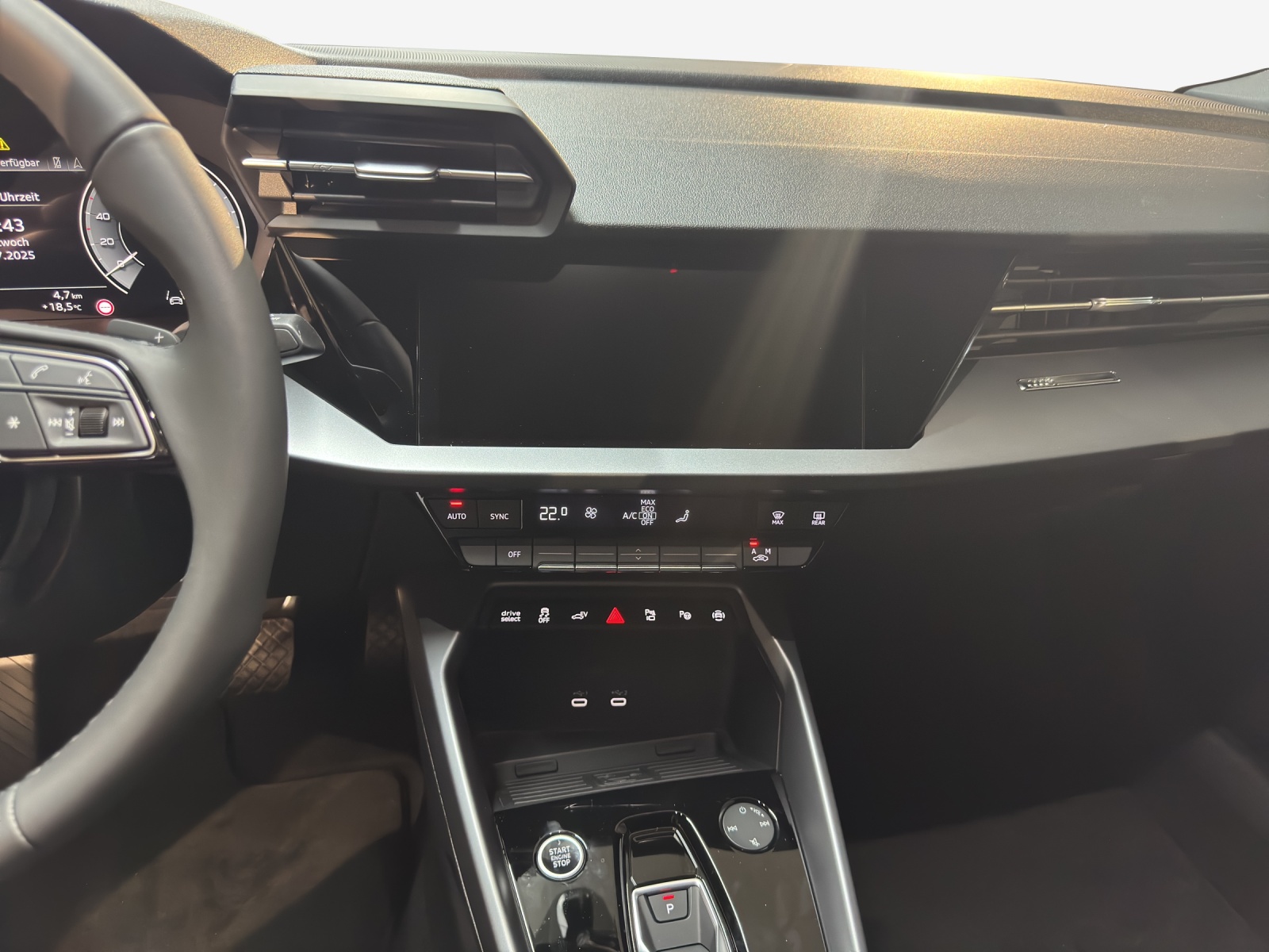 Airbag: Airbag Beifahrer deaktivierbar Assist: Audi pre sense front Assist: Ausweichassistent und Abbiegeassistent Assist: Einparkhilfe hinten Assist: Kamerabasierte Verkehrszeichenerkennung Assist: Proaktiver Insassenschutz Front, Seite und Heck Assist: Spurverlassenswarnung inkl. Notfallassistent Assist: Traktionskontrolle Audi connect Notruf & Service mit Audi connect Remote & Control Aussenspiegel elektrisch einstell- und beheizbar Aussenspiegel in Wagenfarbe Dekor: Dekoreinlage Feinlack vulkangrau Diffusor hinten schwarz matt genarbt Einleger der Lufteinlässe vorn schwarz matt genarbt Einleger im Diffusor in Selenitsilber Elektrische Fensterheber vorne Elektronisches Stabilitäts-Programm (ESP) Fahrwerk: Anpassung Bremsanlage Fensterschachtleisten in Schwarz Frontscheibe in Wärmeschutzverglasung Funkschlüssel, ohne Safelock Garantie: 2 Jahre ohne Kilometerbegrenzung (ab 1. Inv.) Getriebe: 7-Gang- Automat S tronic Haushaltsstecker Typ J (Schweiz) für das e-tron Ladesystem Industriestecker CEE 16A, 400V, lang und gerade für das e-tron Ladesystem Interieur mit Normalsitzen in Stoff schwarz Kindersicherung, elektrisch Klima: 1-Zonen-Klimaautomatik mit Vorbereitung für weitere Klimafunktionen Klima: Standklimatisierung Kühlerschutzgitter schwarz matt genarbt Lackierung: Uni-Lackierung Ladekabel Mode 3 für öffentliches Laden 11 kW Lenkrad: Lederlenkrad im 3-Speichen-Design mit Multifunktion plus und Schaltwippen Media: Audi phone box light Media: USB-Anschlüsse mit Ladefunktion im Fond Paket: Ambiente Lichtpaket Räder: Reifendruck-Kontrollanzeige Räder: Reifenreparatur-Set (Tire Fit) Räder: Räder, 5-V-Speichen Sitze: Rücksitzlehne umklappbar Sitze: i-Size und Top Tether für die äusseren Fondsitze Wegfahrsperre elektronisch Zentralverriegelung mit Fernbedienung e-tron Ladesystem kompakt