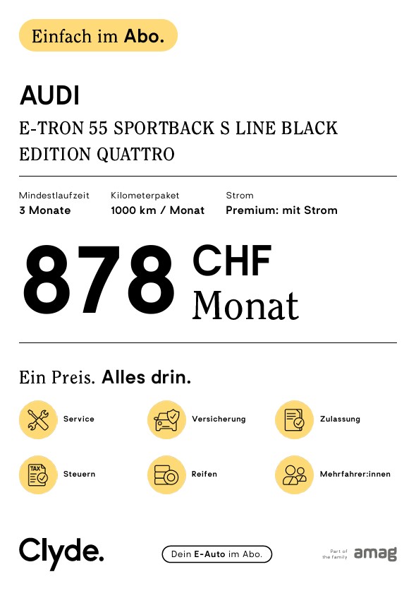 Teste ein E-Auto 3 Monate und erhalte 50 % der Abokosten beim Kauf oder Leasing zurück. Du denkst ernsthaft über Kauf oder Leasing eines Autos nach, möchtest das Fahrzeug aber vorher nochmal im Alltag Probefahren? Abonniere jetzt ein E-Auto mit einer Laufzeit von drei Monaten. Nach Ablauf deiner Probefahrt erhältst du 50 % der investierten Abokosten als Rabatt auf deinen Autokauf oder dein Leasing in der AMAG Garage deiner Wahl. Egal ob Benziner, Diesel, Hybrid oder Elektroauto. Gerne erfahren Sie jederzeit mehr bei uns! Minimum 12 Monate Occasionsgarantie / / Inkl. Ablieferpauschale ab CHF 420.- Abweichungen und Irrtümer zur Ausstattung des Fahrzeuges vorbehalten.