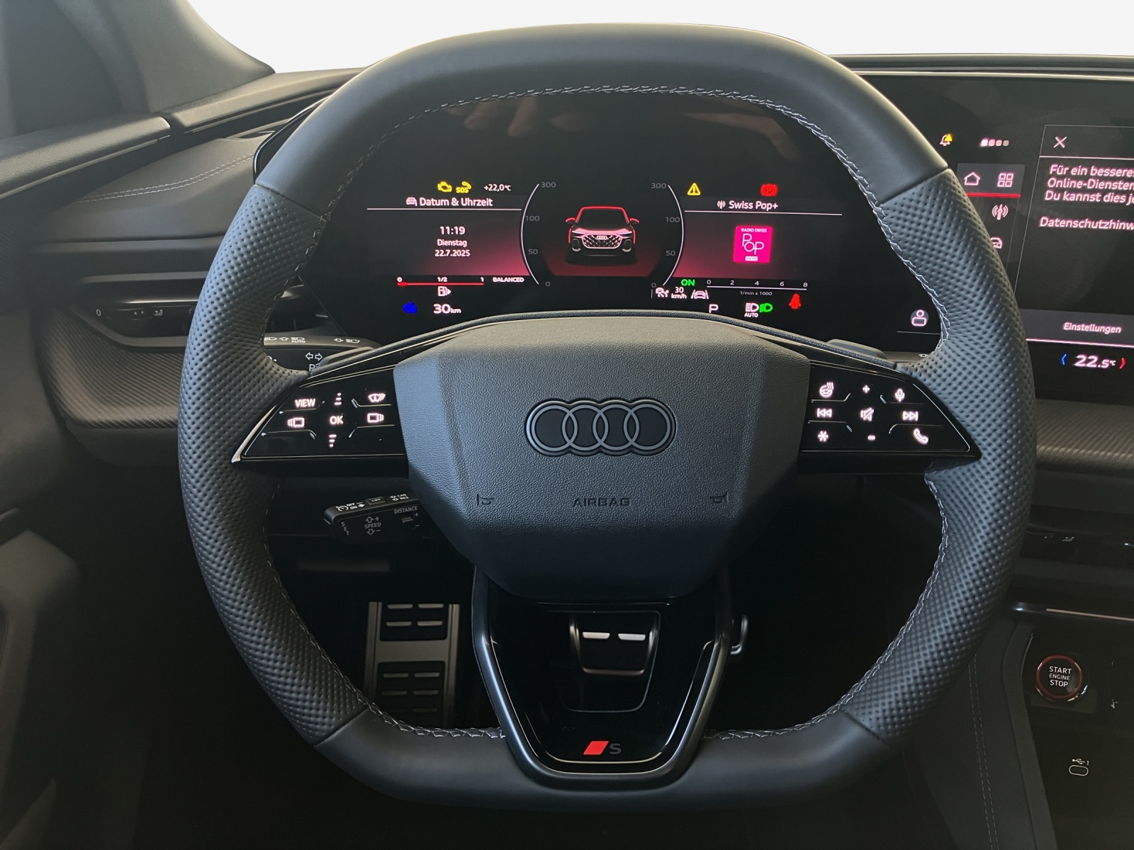 Airbag: Airbag für Fahrer und Beifahrer mit Beifahrer-Airbag-Deaktivierung Airbag: Seitenairbags vorn, mit Kopfairbag und Interaktionsairbag vorn Akustikverglasung für Türscheiben vorn Akustisches Fahrzeug-Warnsystem Assist: Ablenkungs- und Müdigkeitserkennung Assist: Adaptiver Geschwindigkeitsassistent Assist: Ausweichassistent und Abbiegeassistent Assist: Einparkhilfe plus mit Distanzanzeige Assist: Kamerabasierte Verkehrszeichenerkennung Assist: Notbremsassistent vorn Assist: Parkassistent plus Assist: Querverkehrassistent vorn Assist: Spurverlassenswarnung Assist: Traktionskontrolle Assist: Verkehrszeichenbasierter Geschwindigkeitsbegrenzer Audi connect Notruf & Service mit Audi connect Remote & Control Audi virtual cockpit plus Aussenspiegel elektrisch einstell-, beheiz- und anklappbar, beidseitig automatisch abblendend Aussenspiegelgehäuse Chromoptik matt silber Dachhimmel in Stoff schwarz Dekor: Akzentflächen und Bedientasten schwarz glänzend Dekor: Aluminiumoptik im Interieur Dekor: Instrumententafel-Oberseite schwarz mit Kontrastnaht Dekor: Interieurelemente oben und unten Mikrofaser Dinamica Einstiegsleisten mit Aluminiumeinlagen, vorne, beleuchtet, mit S-Schriftzug Elektrische Fensterheber vorne Elektronisches Stabilitäts-Programm (ESP) Fahrwerk: S-Sportfahrwerk Fensterzierleisten Aluminiumoptik Frontscheibe in Wärmeschutz- und Akustikverglasung Funkschlüssel, ohne Safelock Fussmatten vorne und hinten Garantie: 3 Jahre oder 100'000 km Getriebe: 7-Gang- Automat S tronic Innenspiegel automatisch abblendbar Klima: 3-Zonen-Klimatisierungsautomatik Komfortmittelarmlehne vorne Lackierung: Kontrastlackierung in Tamboragrau Metallic Lackierung: Uni-Lackierung Lenkrad: Lenkradapplikation Chromoptik, S-Emblem, Lenkradgriffe perforiertes Leder und Kontrastnaht Lenkrad: Lenkradeinstellung manuell Lenkrad: Sportlederlenkrad, 3-Speichen, oben und unten abgeflacht mit Multifunktion und Schaltwippen Licht: Fernlicht-Assistent Licht: LED-Heckleuchten pro Licht: LED-Scheinwerfer plus Licht: Tagesfahrlicht mit Assistenzfahrlicht u.Coming- u. Leaving-home Funktion automatisch Media: Audi Application Store und Smartphone-Interface Media: Audi connect Navigation & Infotainment Media: Audi phone box light Media: Digitaler Radioempfang Media: USB-Anschlüsse mit Ladefunktion in erster und zweiter Sitzreihe Modellbezeichnung am Heck Paket: Ablage- und Gepäckraumpaket Paket: Ambiente Lichtpaket plus Paket: Klimatisierungspaket Pedalerie und Fussstütze in Edelstahl Polster: Mikrofaser Dinamica/Leder-Kombination mit Rautensteppung und S-Prägung Räder: Reifendruck-Kontrollanzeige Räder: Reifenreparatur-Set (Tire Fit) Räder: Räder, 5-Doppel-Y-Speichen, graphitgrau, glanzgedreht Scheinwerfer-Reinigungsanlage Servolenkung Elektromechanisch Sitze: 4-Wege-Lendenwirbelstütze für die Vordersitze Sitze: Kindersitzbefestigung i-Size auf der Beifahrerseite und i-Size und Top Tether Sitze: Vordersitze elektrisch verstellbar Sitze: Vordersitze heizbar Türen: Komfortöffnung Gepäckraumklappe Verbandmaterial,Warndreieck und Warnveste Wegfahrsperre elektronisch Zentralverriegelung mit Fernbedienung