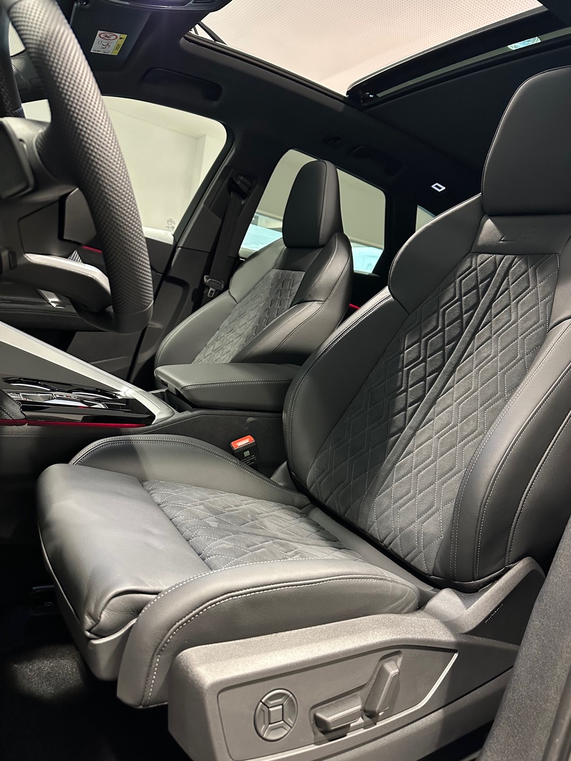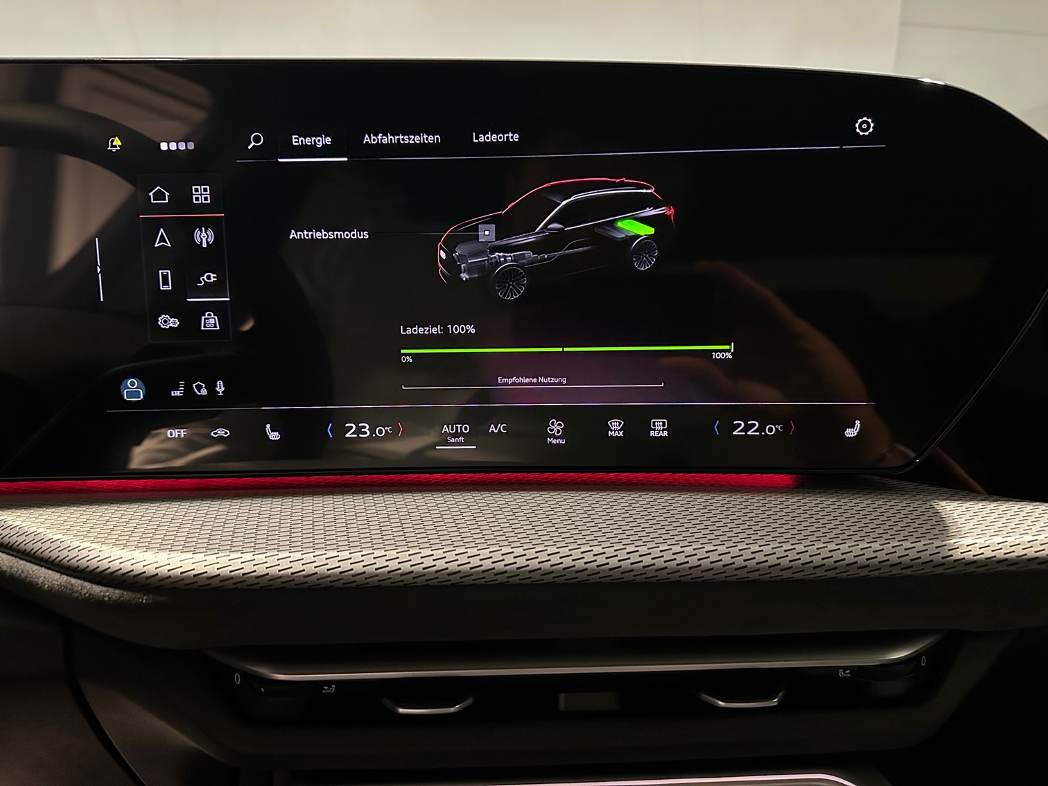 Airbag: Airbag für Fahrer und Beifahrer mit Beifahrer-Airbag-Deaktivierung Airbag: Seitenairbags vorn, mit Kopfairbag und Interaktionsairbag vorn Akustisches Fahrzeug-Warnsystem Assetto: Pinze dei freni colorate Assist: Ablenkungs- und Müdigkeitserkennung Assist: Adaptiver Geschwindigkeitsassistent Assist: Ausweichassistent und Abbiegeassistent Assist: Einparkhilfe plus mit Distanzanzeige Assist: Kamerabasierte Verkehrszeichenerkennung Assist: Notbremsassistent vorn Assist: Parkassistent plus Assist: Querverkehrassistent vorn Assist: Spurverlassenswarnung Assist: Traktionskontrolle Assist: Verkehrszeichenbasierter Geschwindigkeitsbegrenzer Audi connect Notruf & Service mit Audi connect Remote & Control Audi virtual cockpit plus Aussenspiegel elektrisch einstell-, beheiz- und anklappbar, beidseitig automatisch abblendend Cavo di ricarica HH tipo J (CH) Cavo di ricarica con spina industriale CEE 16 A/400 V/6 h lunga + dritta Cavo di ricarica modalità 3 per ricarica pubblica fino a 22 kW Chiusura delle porte centralizzata con comando a distanza Dekor: Aluminiumoptik im Interieur Dekor: Dekoreinlagen Aluminium matt gebürstet mit Linearprägung anthrazit Elektrische Fensterheber vorne Elektronisches Stabilitäts-Programm (ESP) Fahrwerk: S-Sportfahrwerk Fensterzierleisten Aluminiumoptik Frontscheibe in Wärmeschutz- und Akustikverglasung Funkschlüssel, mit Safelock Funkschlüssel, ohne Safelock Fussmatten vorne und hinten Garantie: Audi Garantie 2 Jahre ohne Kilometerbegrenzung (ab 1. Inv.) Garanzia: Audi Swiss Service Package+ (ASSP+) Getriebe: 7-Gang- Automat S tronic Klima: 3-Zonen-Klimatisierungsautomatik Klima: Standklimatisierung Lackierung: Uni-Lackierung Lenkrad: Lenkradeinstellung manuell Licht: Fernlicht-Assistent Licht: LED-Heckleuchten pro Licht: LED-Scheinwerfer plus Licht: Tagesfahrlicht mit Assistenzfahrlicht u.Coming- u. Leaving-home Funktion automatisch Media: Audi Application Store und Smartphone-Interface Media: Audi connect Navigation & Infotainment Media: Audi phone box light Media: Digitaler Radioempfang Media: USB-Anschlüsse mit Ladefunktion in erster und zweiter Sitzreihe Modellbezeichnung am Heck Pacchetto: Esterni S line Pacchetto: Interni S con sedili sportivi, combinazione pelle/similpelle in nero Paket: Ablagen- und Gepäckraumpaket Paket: Ambiente Lichtpaket plus Paket: Klimatisierungspaket Route: Cerchi Aero a 10 razze, grigio grafite, torniti a specchio Ruote: Cerchi a 5 razze doppie, grigio grafite, torniti a specchio Ruote: Pneumatici 255/45 R20 105W XL ottimizzati per la resistenza al rotolamento Räder: Reifendruck-Kontrollanzeige Räder: Reifenreparatur-Set (Tire Fit) Scheiben seitlich und hinten in Wärmeschutzverglasung Scheinwerfer-Reinigungsanlage Sedili: Fissaggio per seggiolino per bambini i-Size sul lato passeggero e i-Size e Top Tether Servolenkung Elektromechanisch Sitze: Vordersitze elektrisch verstellbar Sitze: Vordersitze heizbar Specchietti esterni colore carrozzeria Specchietto interno fotocromato Türen: Komfortöffnung Gepäckraumklappe Verbandmaterial,Warndreieck und Warnveste Verniciatura:Verniciatura a contrasto in Grigio Tambora metallizzato Wegfahrsperre elektronisch