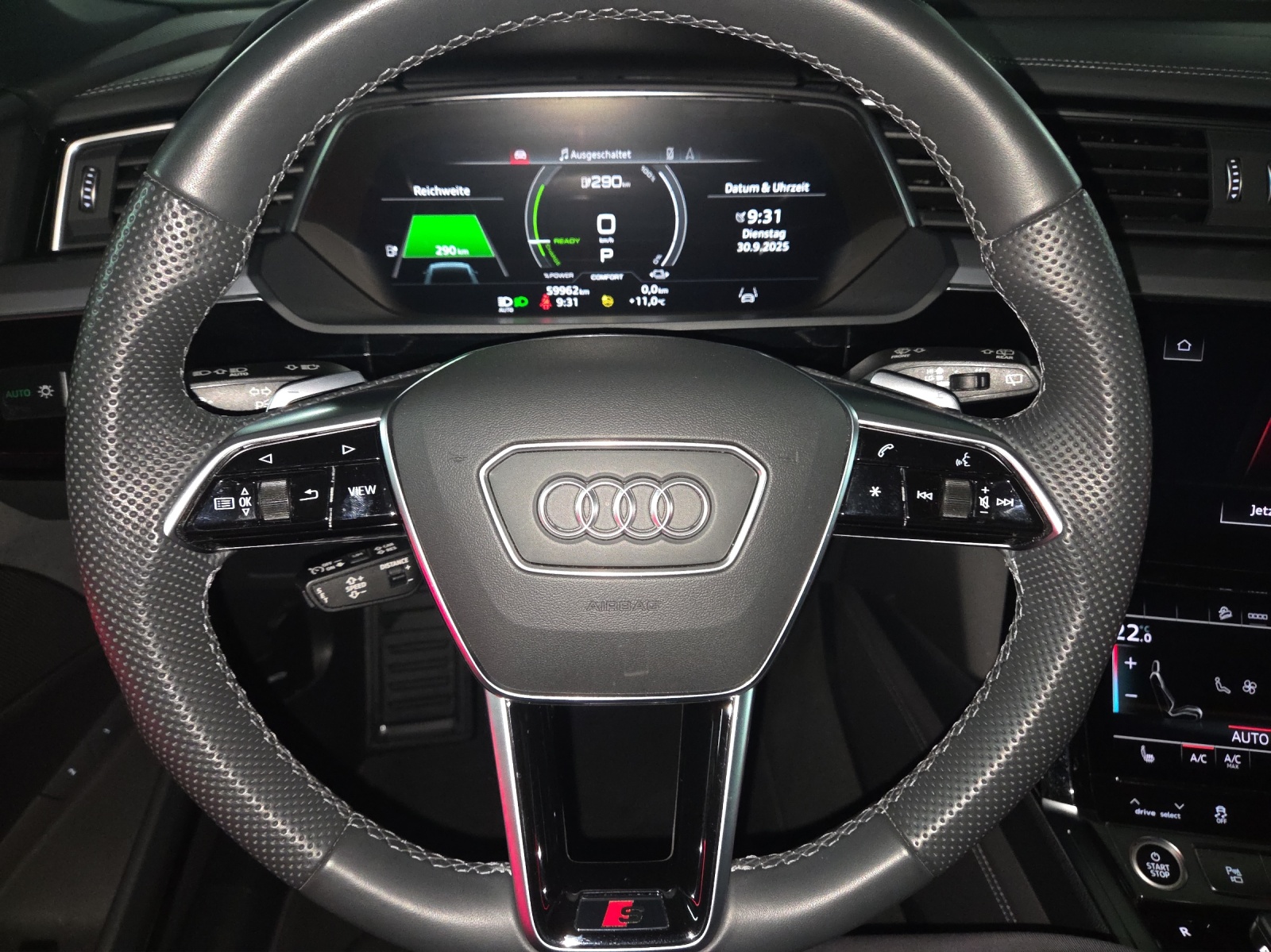 Serienausstattung 2. AC-Ladezugang (Beifahrerseite) Airbag: Airbag Beifahrer deaktivierbar Airbag: Seitenairbags vorne Airbag: Window-Kopfairbags Akustisches Fahrzeug-Warnsystem (AVAS) Assist: Audi pre sense front Assist: Geschwindigkeitsregelanlage inklusive Geschwindigkeitsbegrenzer Assist: Spurverlassenswarnung Audi connect Notruf & Service mit Audi connect Remote & Control Aussenspiegel elektrisch einstell-, beheiz- und anklappbar, beidseitig automatisch abblendend Bedientasten schwarz matt Dachhimmel in Stoff mondsilber Dekor: Dekoreinlagen Feinlack graphitgrau Einparkhilfe plus mit Umgebungsanzeige Einstiegsleisten mit Aluminiumeinlegern vorne und hinten, beleuchtet, vorne mit S-Schriftzug Fahrwerk: Adaptive air suspension sport Frontscheibe in Wärmeschutz- und Akustikverglasung Fussmatten vorne und hinten Garantie: 2 Jahre ohne Kilometerbegrenzung (ab 1. Inv.) Gepäckraumabdeckung (manuell) Gepäckraumklappe elektrisch öffnend und schliessend Haushaltsstecker Typ J (CH) Industriestecker CEE 16A, 400V, lang und gerade für das e-tron Ladesystem Innenspiegel automatisch abblendbar Kindersitzbefestigung ISOFIX und Top Tether für die Rücksitzbank Kindersitzvorrichtung ISOFIX Beifahrerseite Klima: 2-Zonen-Komfortklimaautomatik Klima: Standklimatisierung Komfortmittelarmlehne vorne Lackierung: Bottom line in Volllackierung (Wagenfarbe) Lenkrad: Doppelspeichen-Lederlenkrad mit Multifunktion und Schaltwippen Licht: LED-Scheinwerfer mit Vorbereitung für weitere Lichtfunktionen und LED-Heckleuchten Licht: Scheinwerfer-Reinigungsanlage Media: Audi connect Navigation & Infotainment Media: Audi music interface Media: Bluetooth-Schnittstelle Media: Digitaler Radioempfang (DAB) Media: MMI Navigationssystem Plus Modellbezeichnung und Leistungs- / Technologie-Schriftzug On-Board-Ladegerät bis 11 kW (AC) Paket: Optikpaket schwarz Privacy-Verglasung (Scheiben abgedunkelt) Räder: Leichtmetallräder 21", 15-Speichen, graphitgrau, glanzgedreht, geschmiedet Räder: Reifendruck-Kontrollanzeige Räder: Reifenreparatur-Set (Tire Fit) S line-Emblem im Kühlerschutzgitter Sitze: Vordersitze heizbar Sitze: Vordersitze höhenverstellbar Sonnenblende Fahrer und Beifahrerseite mit beleuchtetem Spiegel Stossfänger S line in Volllackierung Unterfahrschutz vorne und Diffusor hinten in sportlich markantem Design in Selenitsilber matt Verbandmaterial und Warndreieck e-tron Ladesystem kompakt