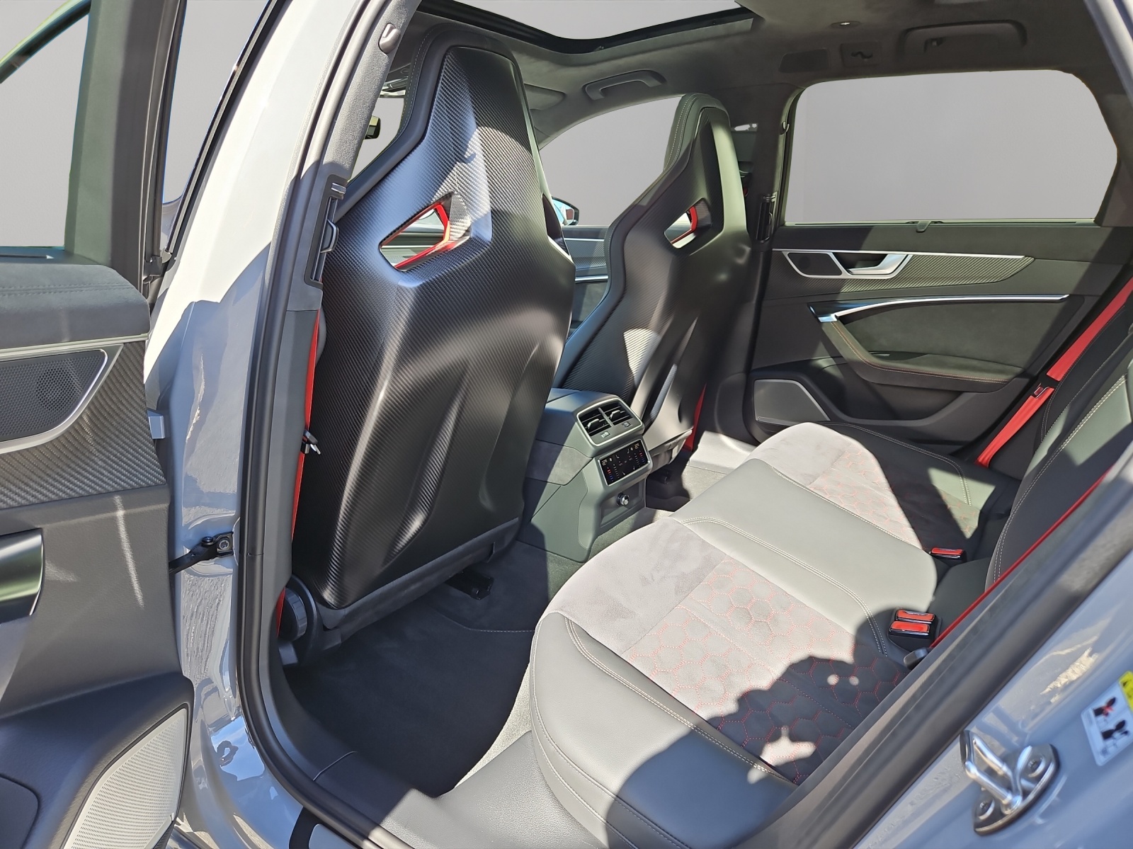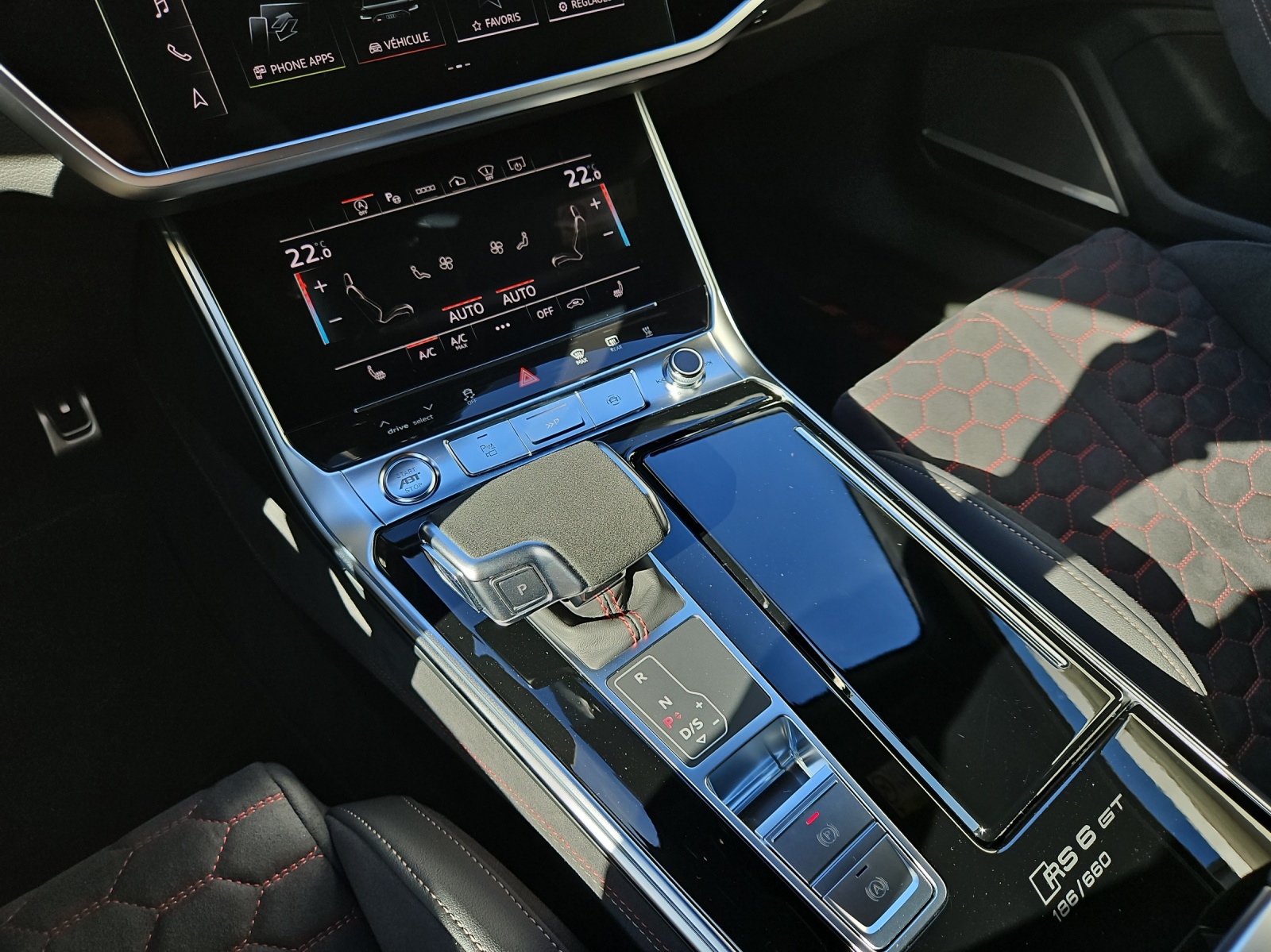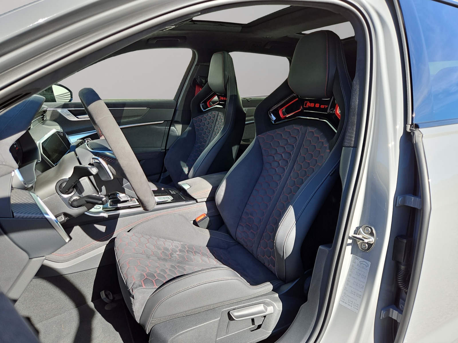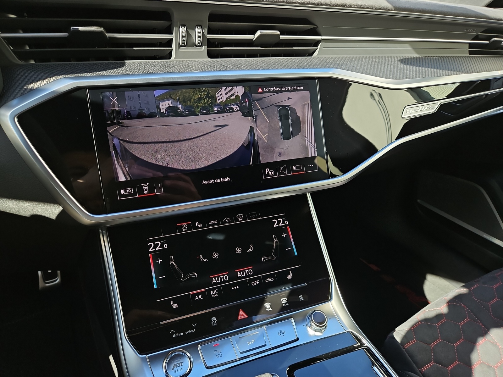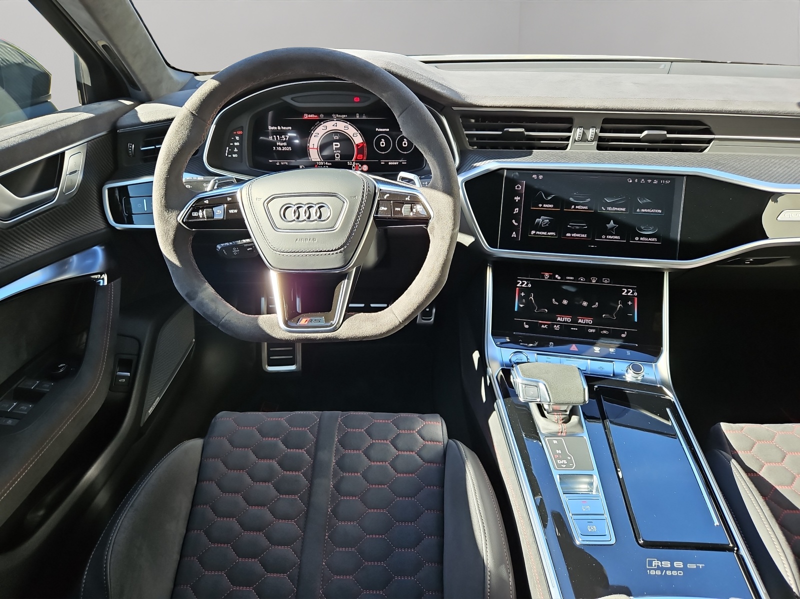 Toit panoramique en verre Vitrage Privacy (vitres teintées) Sièges AV et AR chauffants Sound-Système Advanced Bang & Olufsen Portes: Fermeture assistée des portières Siège baquets RS en combinaison microfibre dinamica / cuir avec surpiqûres en nid d'abeille Rouleaux pare-soleil pour vitres Pack Dynamique RS plus / Freins composites céramiques Limitateur de la vitesse 305 km/h Suspension: Direction intégrale Suspension: quattro avec différentiel sport Head-Up Display Pack Air Quality (comprend l’ioniseur et l’aromatisation) Commande d'ouverture de porte de garage Garantie: 5 ans ou 150'000 km Ciel de pavillon en alcantara noir Clima: Chauffage et ventilation auxiliaires (sans télécommande) Barres de toit en noir Casquette Airbag en cuir de couleur Applications décoratives en carbone Sergé Audi virtual cockpit plus mit zusätzlichem RS-Layout Audi exclusive : Veuillez envoyer la description à gris nardo RS6 Avant GT Roues alu 10.5J x 22, 6-bras-design, noir mât, pneus performance 285/30 R22 noir - rouge / cuivre Contrôle de la pression des pneus Audi Swiss Service Package+ Suspension filetée RS6 GT Rétroviseurs extérieurs rétractables avec réglage automatique jour & nuit Véhicule CH / ABT 720 CV / Services gratuits 10 ans ou 100'000 kms et garantie d'usine 5 ans ou 150'000 kms dès la 1ère mise en circulation / Leasing et reprise toutes marques possible