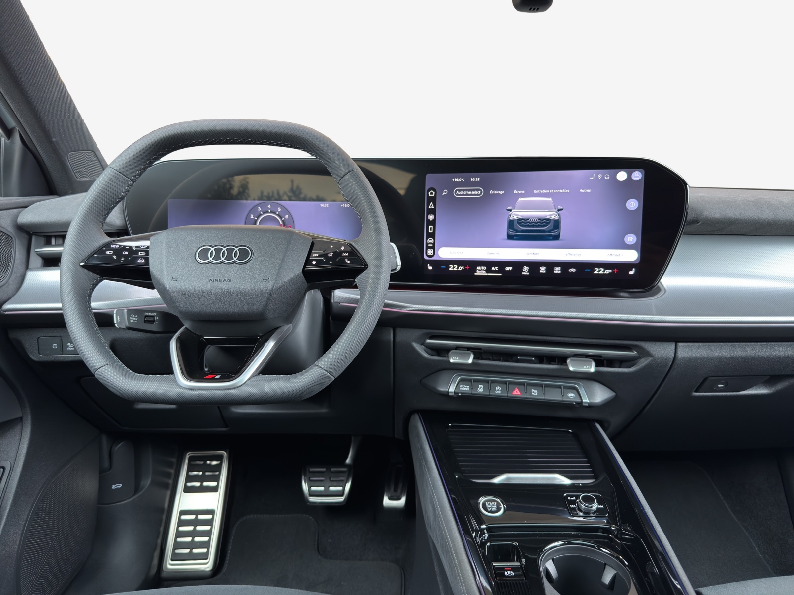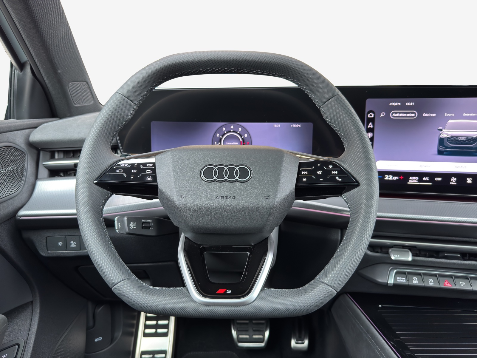 Airbag latéral à lavant et à larrière, avec airbag latéral de tête et airbag interactif à lavant Assist: Assistant de descente Assist: Assistant de stationnement plus avec aide au stationnement avec affichage de lenvironnement Clé confort avec verrouillage de sécurité Lackierung: Perleffekt-Lackierung Licht: Fernlicht-Assistent Lumière: Feux arrière numériques OLED Media: Audi connect Navigation & Infotainment Mèdias: Amplificateur de signal de téléphonie mobile de type 1 Mèdias: Emplacement pour téléphone avec fonction de recharge inductive Pack: Intérieur S line avec sièges sport en microfibre noire Pack: Pack Assistance Conduite et Stationnement pro et Pack Assistance Systèmes de Protection et d' Pack: Pack climatisation plus Pack: Pack de fonctionnalités Pack: Pack expérience premium Roues: Jantes Audi Sport, tripode à 5 branches, noir métallisé, brillant, foncé Scheinwerfer-Reinigungsanlage Sonnenschutzverglasung, abgedunkelt Volant: Volant sport à 3 branches, sans cuir, aplati en haut et en bas avec touches multifonctions Vorbereitung für Anhängevorrichtung