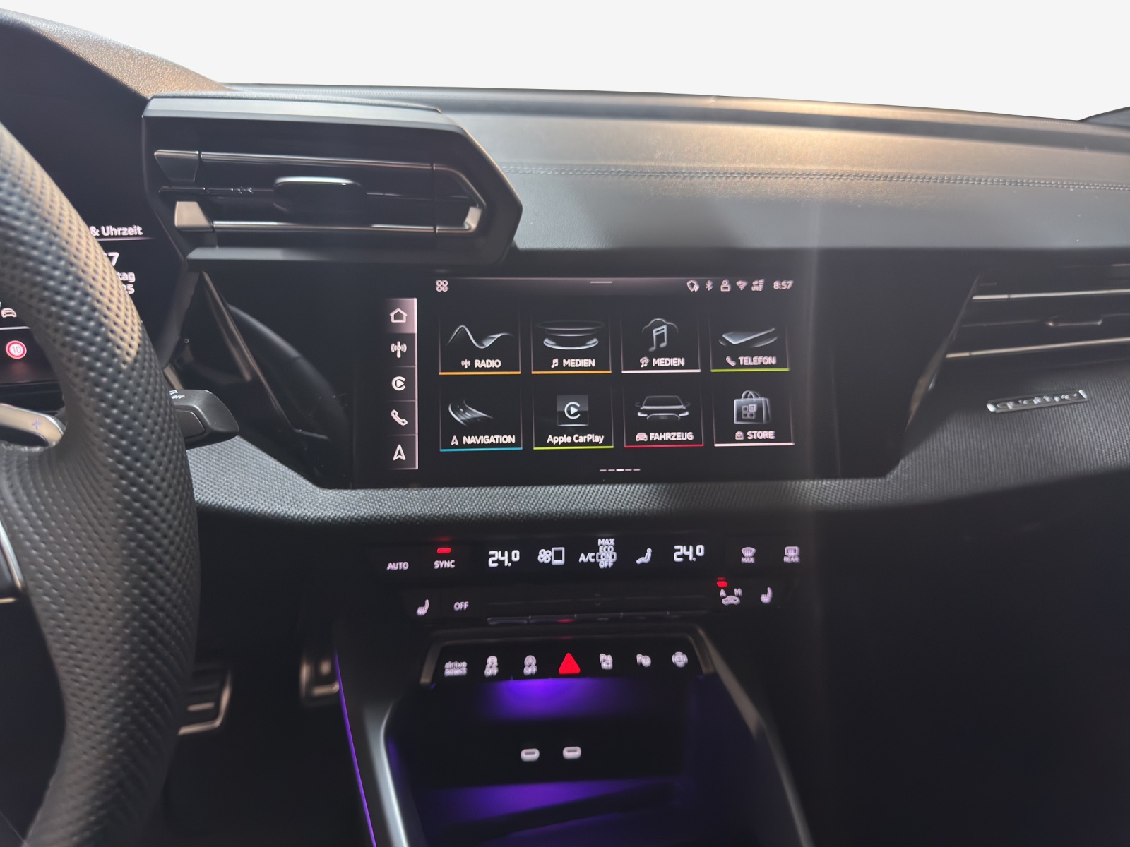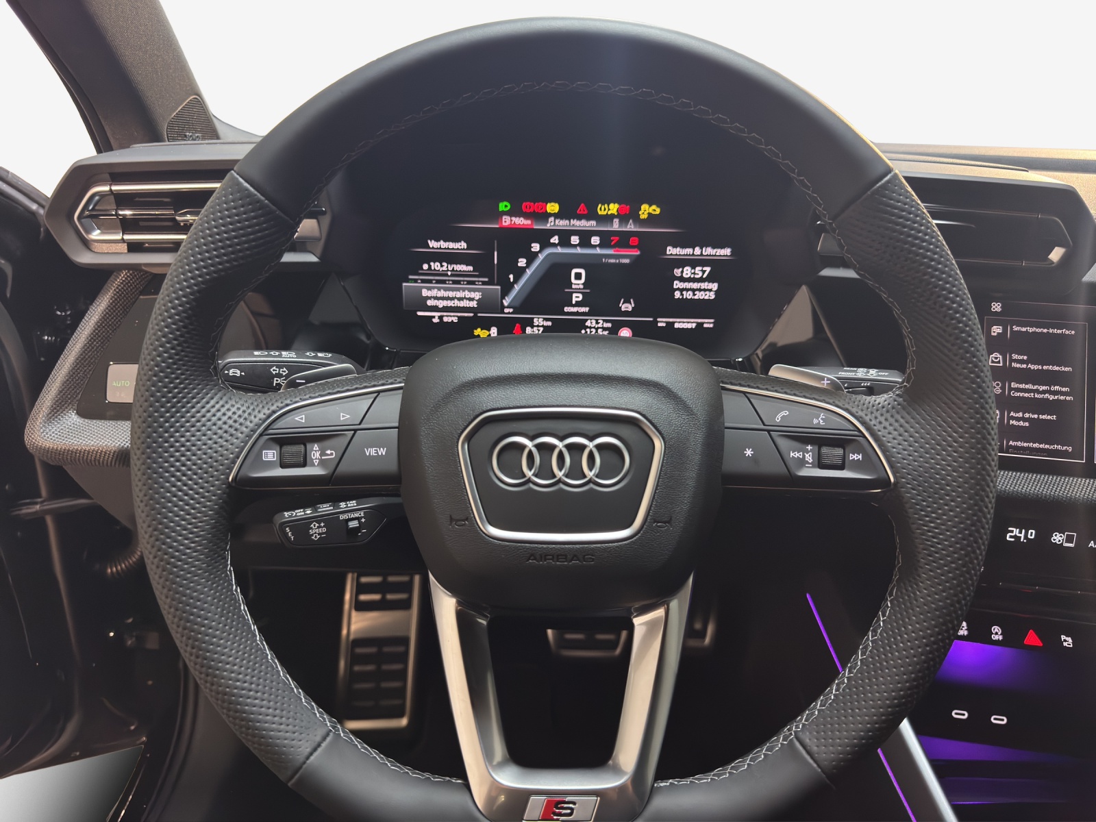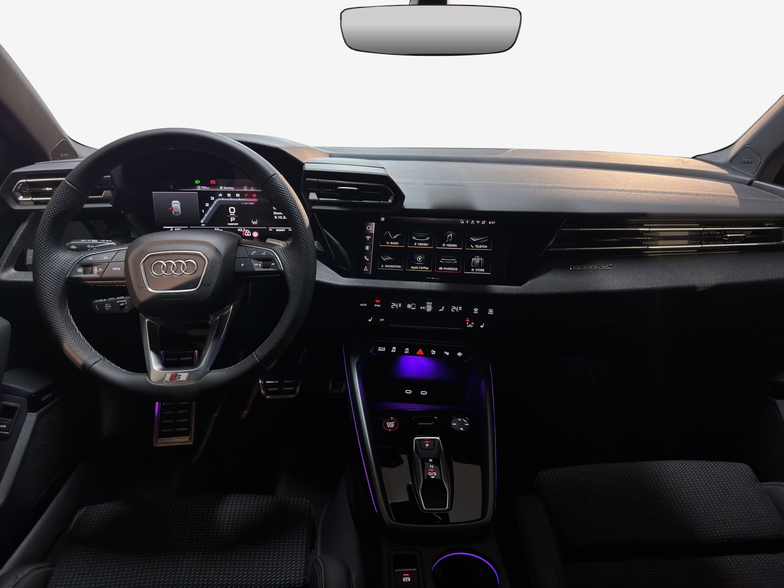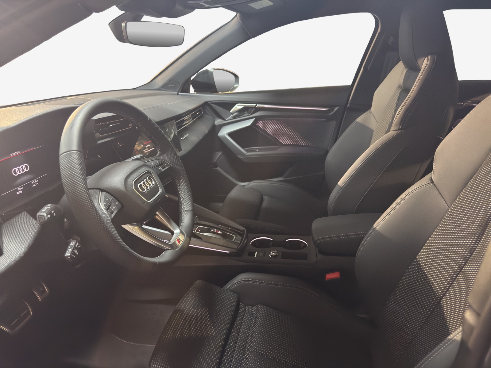Assist: Adaptiver Fahrassistent mit Notfallassistent Assist: Spurwechselwarnung mit Ausstiegswarnung und Querverkehrassistent hinten Aussenspiegel in Wagenfarbe Endrohrblenden schwarz verchromt Lackierung: Metallic-Lackierung Paket: Ambiente-Lichtpaket pro Paket: Assistenzpaket Fahren und Parken pro und Assistenzpaket Schutz- und Warnsysteme plus Paket: Assistenzpaket Schutz- und Warnsysteme plus Paket: Klimatisierungspaket plus Paket: Matrix LED-Scheinwerfer, LED-Heckleuchten und Scheinwerfer-Reinigungsanlage Paket: Optikpaket schwarz plus Paket: Paket Premium Plus S3 Sportback Räder: Leichtmetallräder Audi Sport 19 Zoll 5-Doppelspeichen-Edge, anthrazitschwarz, glanzgedreht Sitze: Vordersitze elektrisch verstellbar Sonnenschutzverglasung, abgedunkelt Türen: Komfortöffnung Gepäckraumklappe
