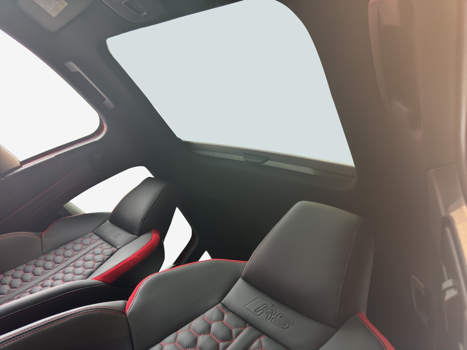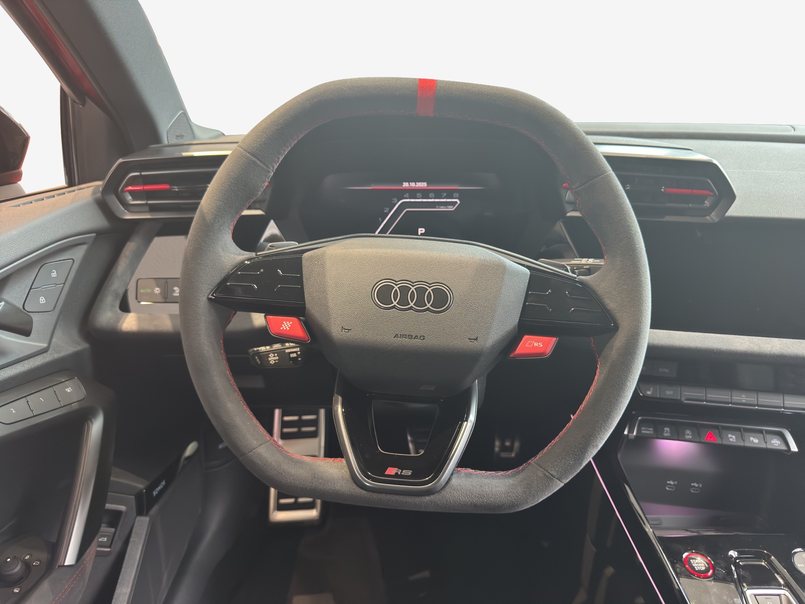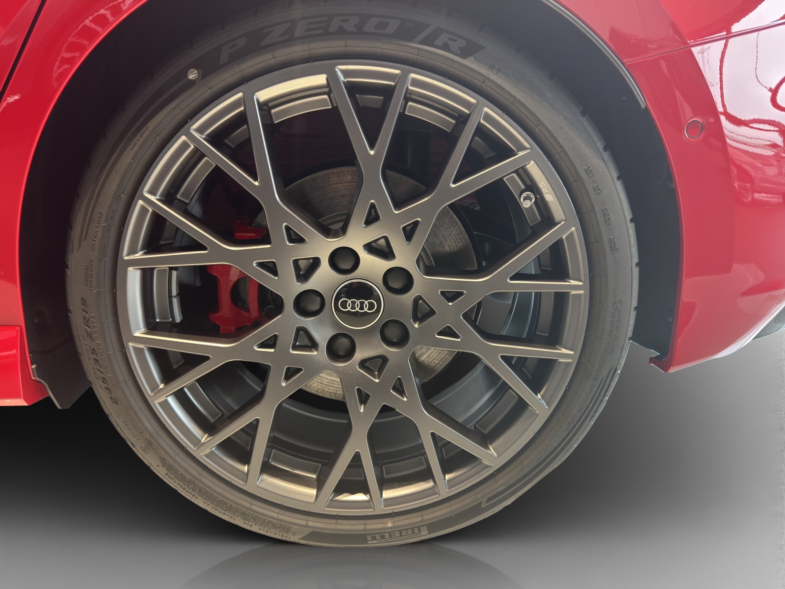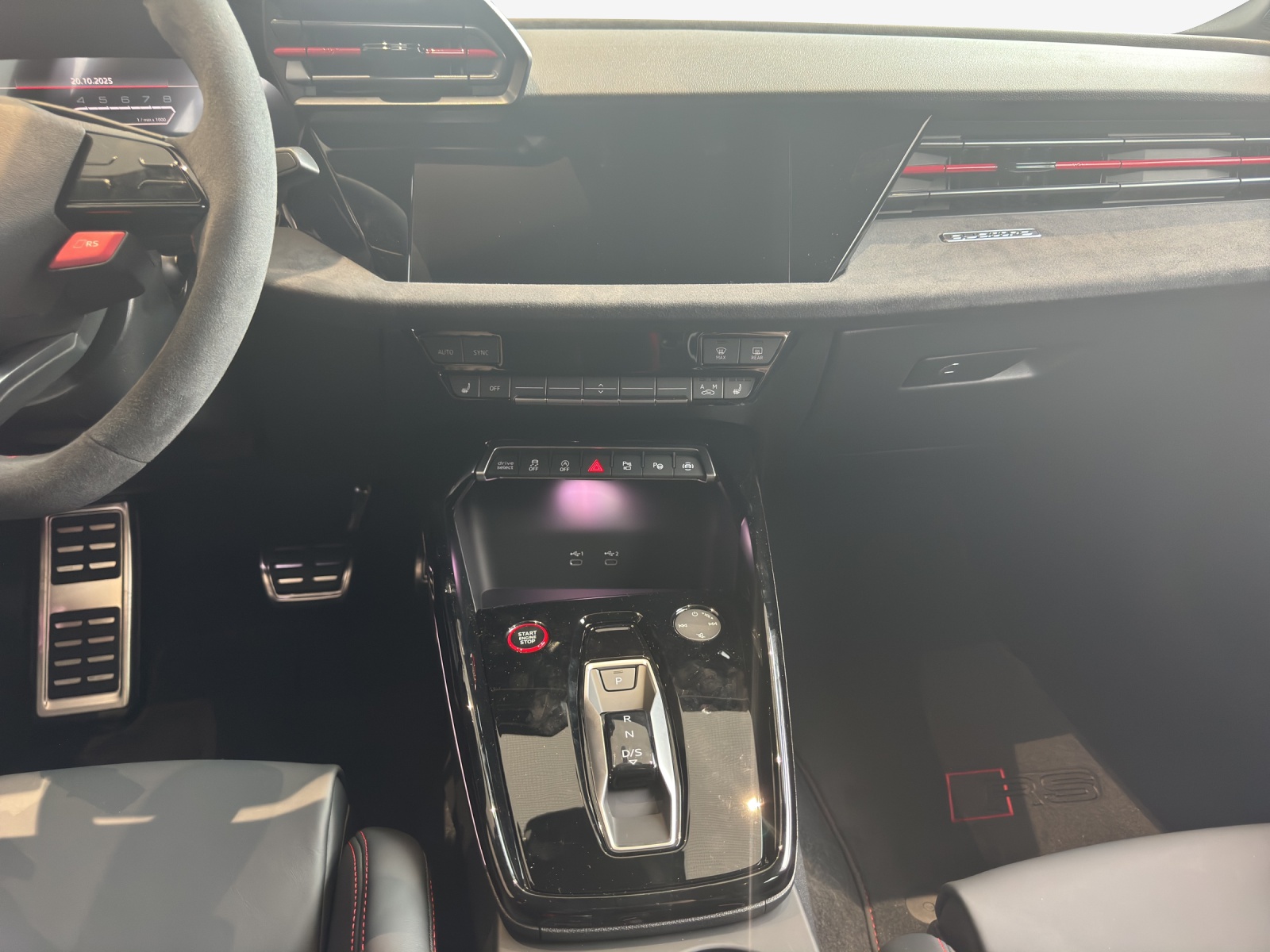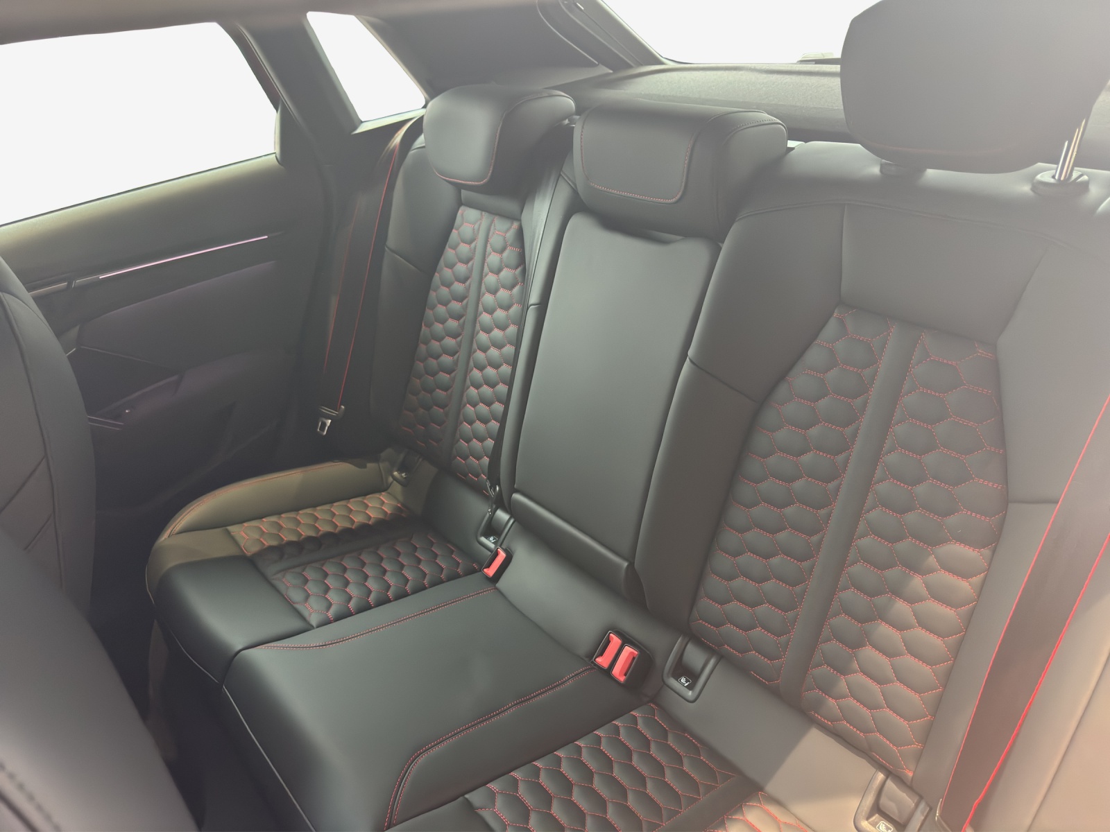 Airbag: Seitenairbag vorn und hinten, mit Kopfairbag und Interaktionsairbag vorn Assist: Adaptiver Fahrassistent mit Notfallassistent Assist: Anhebung der Höchstgeschwindigkeit auf 280 km/h Assist: Spurwechselwarnung mit Ausstiegswarnung und Querverkehrassistent hinten Dekor: Interieurelemente unten Mikrofaser Dinamica schwarz Fahrwerk: Adaptives Fahrwerk mit Audi drive select Fahrwerk: RS-Bremsanlage mit Bremssätteln rot Lackierung: Metallic-Lackierung Paket: Assistenzpaket Fahren und Parken pro und Assistenzpaket Schutz- und Warnsysteme plus Paket: RS-Designpaket rot plus Polster: Leder Feinnappa mit Wabensteppung und RS-Prägung RS-Exterieurumfänge Carbon/schwarz matt Räder: Reifendruckkontrollsystem Räder: Räder, 10-Kreuzspeichen, grau seidenmatt Sonnenschutzverglasung, abgedunkelt