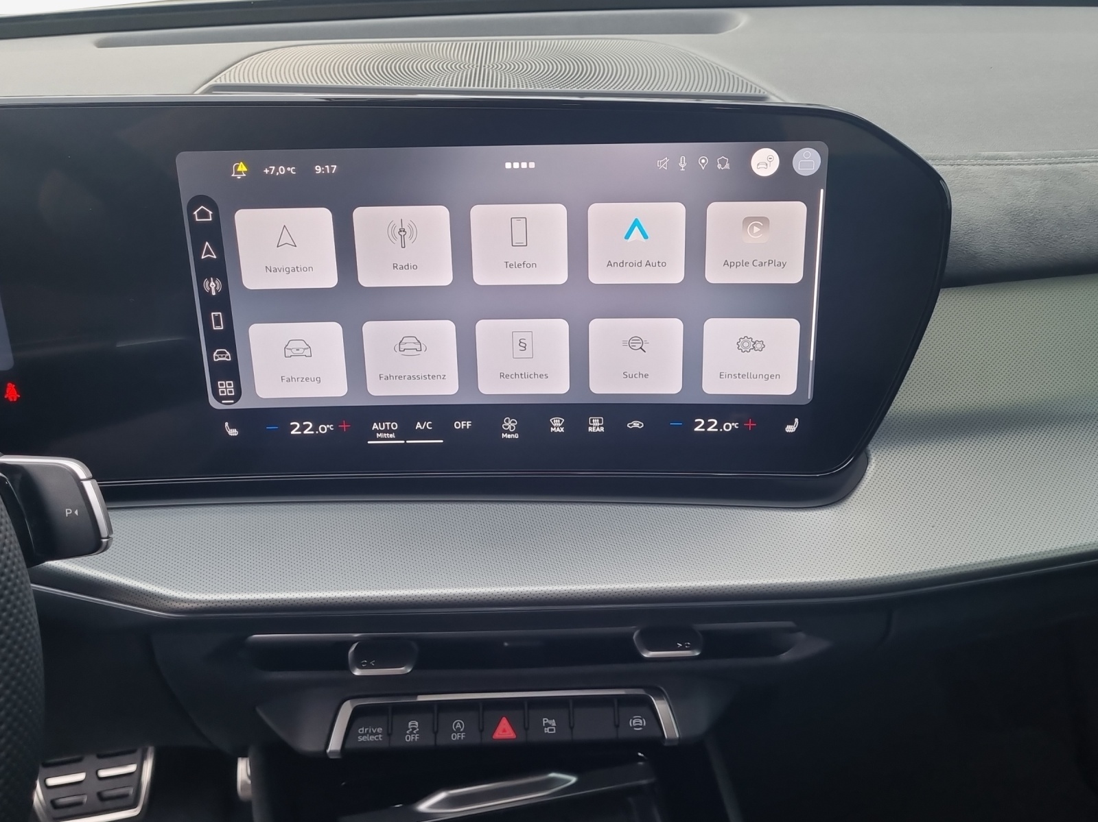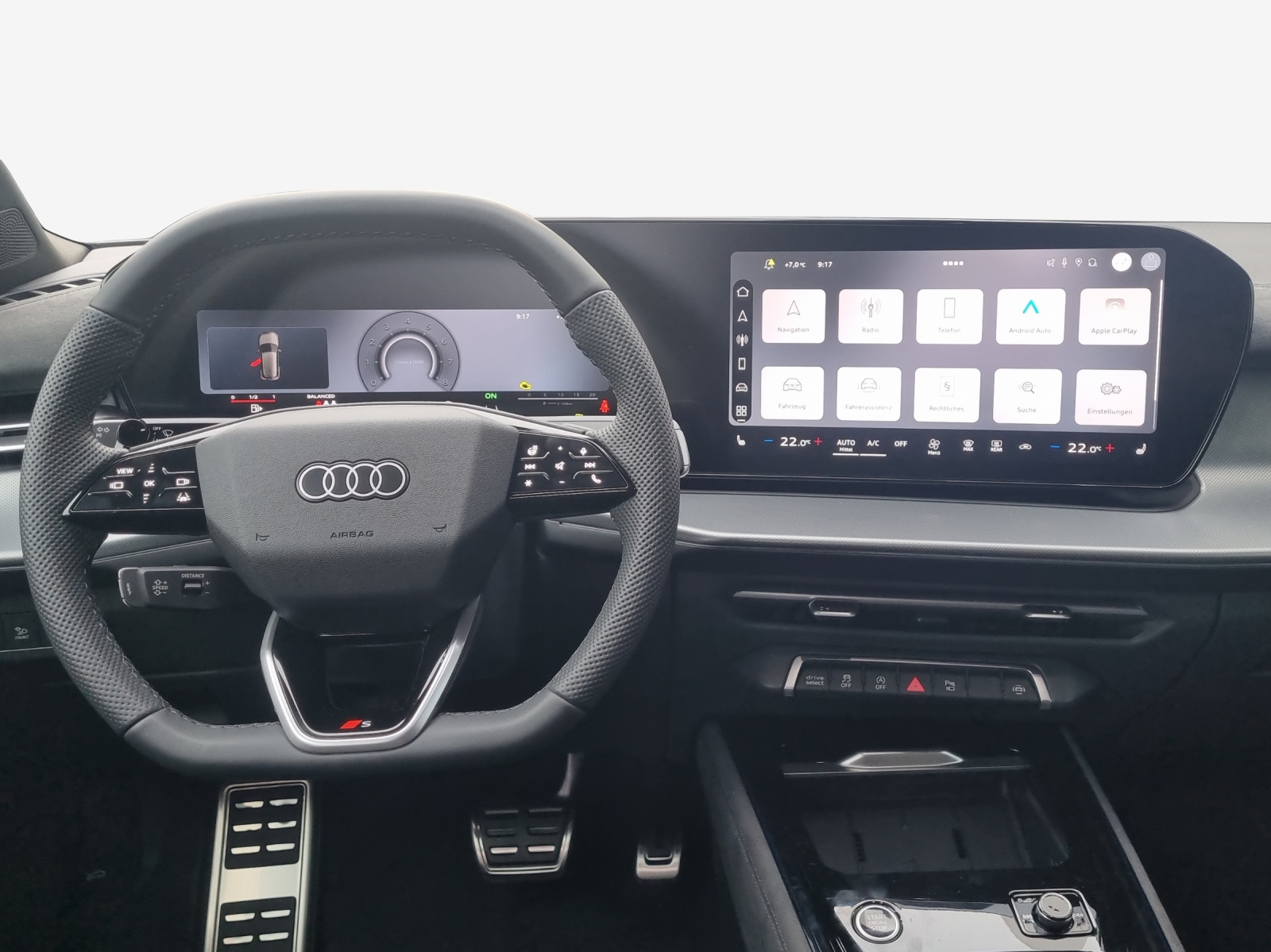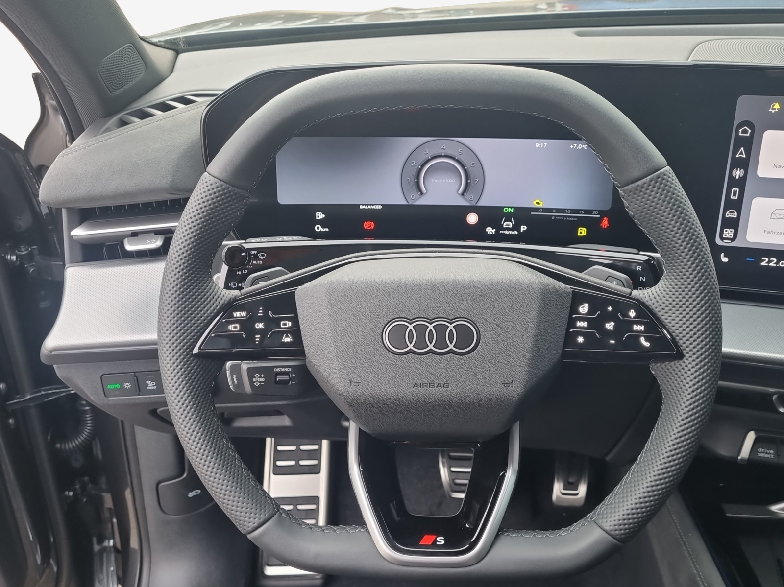 Airbag: Seitenairbag vorn und hinten, mit Kopfairbag und Interaktionsairbag vorn Assist: Bergabfahrassistent Assist: Parkassistent plus mit Einparkhilfe mit Umgebungsanzeige Komfortschlüssel ohne Safelock Lackierung: Perleffekt-Lackierung Daytonagrau Lenkrad: Sportlederlenkrad, 3-Speichen, oben und unten abgeflacht mit Multifunktion, Licht: Digitale OLED-Heckleuchten Licht: Fernlicht-Assistent Media: Audi connect Navigation & Infotainment Media: Mobilfunk-Signalverstärker Typ 1 Media: Telefonablage mit induktiver Ladefunktion und Mobilfunk-Koppelantenne Paket: Assistenzpaket Fahren und Parken pro und Assistenzpaket Schutz- und Warnsysteme plus Paket: Interieur S line mit Sportsitzen Mikrofaser schwarz Paket: Klimatisierungspaket plus Paket: MMI experience pro Paket: Optikpaket schwarz Paket: Paket Premium experience Panorama-Schiebedach (1-teilig) Räder: Räder Audi Sport, 5-Speichen-Tripod, schwarz metallic, glanzgedreht, abgedunkelt Scheinwerfer-Reinigungsanlage Sonnenschutzverglasung, abgedunkelt Vorbereitung für Anhängevorrichtung