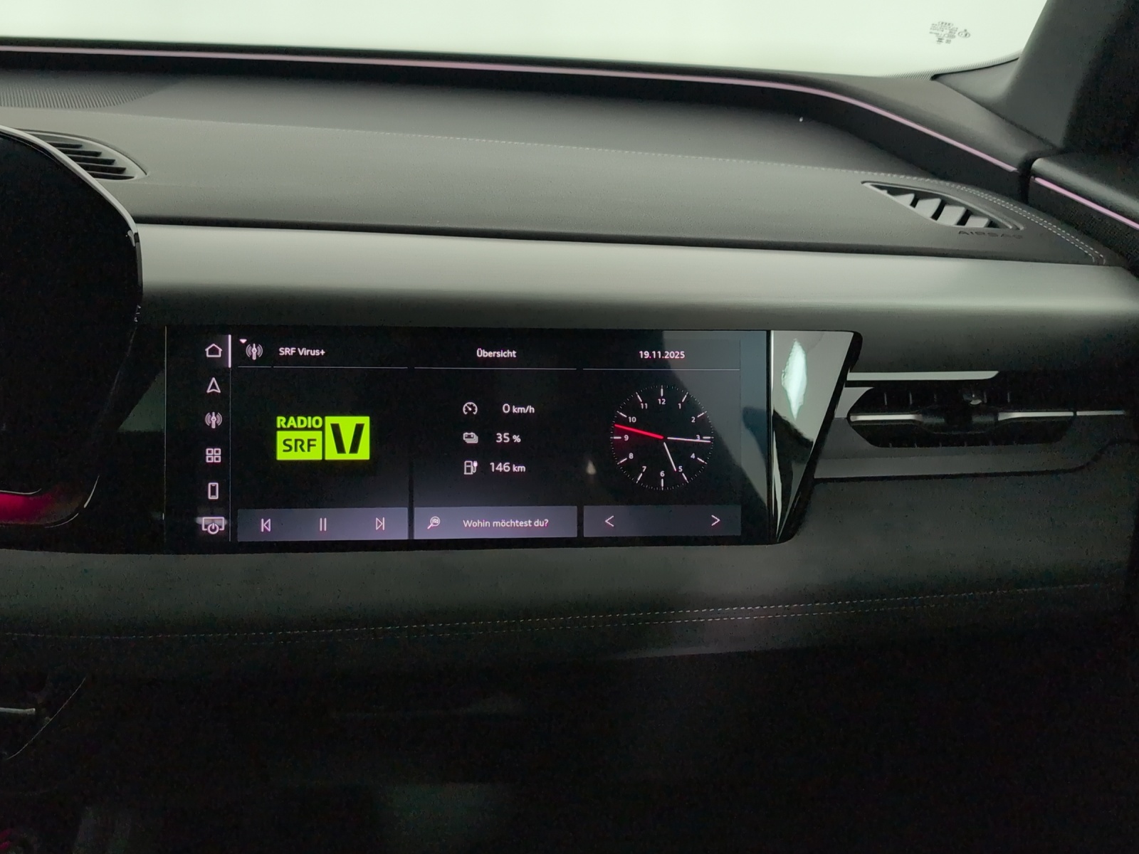 Airbag: Airbag Beifahrer deaktivierbar Airbag: Airbag Fahrer und Beifahrer Airbag: Seitenairbag vorn, mit Kopfairbag und Interaktionsairbag vorn Akustisches Fahrzeug-Warnsystem (AVAS) Assist: Adaptiver Geschwindigkeitsassistent Assist: Aufmerksamkeits- und Müdigkeitserkennung Assist: Ausweichassistent und Abbiegeassistent Assist: Einparkhilfe plus mit Distanzanzeige Assist: Kamerabasierte Verkehrszeichenerkennung Assist: Kreuzungsassistent Assist: Notbremsassistent vorn Assist: Parkassistent plus Assist: Spurverlassenswarnung Assist: Spurwechsel- und Ausstiegswarnung, Querverkehrassistent hinten und Abbiegeassistent hinten Assist: Traktionskontrolle Assist: Verkehrszeichenbasierter Geschwindigkeitsbegrenzer Audi connect Notruf & Service mit Audi connect Remote & Control Audi virtual cockpit plus Aussenspiegel elektrisch einstell-, beheiz- und anklappbar, beidseitig automatisch abblendend Aussenspiegel in Wagenfarbe Dachhimmel Stoff, Farbe felsgrau Dekor: Dekoreinlage Feinlack vulkangrau Dekor: Instrumententafel-Oberseite schwarz mit Kontrastnaht Dekor: Interieurelemente oben und unten Kunstleder Einstiegsleisten mit Aluminiumeinlegern vorn Elektrische Fensterheber vorne Elektronisches Stabilitäts-Programm (ESP) Fahrwerk: Komfortfahrwerk Fensterzierleisten schwarz Fussmatten vorne und hinten Garantie: Audi Garantie 2 Jahre ohne Kilometerbegrenzung (ab 1. Inv.) Getriebe: Direktantrieb, kein Getriebe Innenspiegel automatisch abblendbar Interieur mit Normalsitzen, Stoff schwarz Klima: 3-Zonen-Klimatisierungsautomatik Klima: Automatische Umluftregelung Klima: Elektrische Luftzusatzheizung Komfortmittelarmlehne vorne Komfortschlüssel ohne Safelock Lackierung: Kontrastlackierung Lackierung: Uni-Lackierung Magnetgrau Ladekabel Mode 3 für öffentliches Laden bis 22 kW Ladeleistung bis 270 kW (DC) Lenkrad: Doppelspeichen-Lederlenkrad mit Multifunktion und Schaltwippen Lenkrad: Lenkrad längs- und höhenverstellbar Lenkrad: Lenkrad mit Applikation in Chromoptik Lenkrad: Lenkradapplikation Chromoptik Licht: Fernlicht-Assistent Licht: LED-Heckleuchten pro Licht: LED-Scheinwerfer plus Licht: Projektionsleuchte in den Aussenspiegeln Licht: Tagesfahrlicht mit Assistenzfahrlicht u.Coming- u. Leaving-home Funktion automatisch Media: Audi Application Store und Smartphone-Interface Media: Audi connect Navigation & Infotainment Media: Digitaler Radioempfang Media: FOD Funktionen online verfügbar Media: MMI experience plus Media: Telefonablage mit induktiver Ladefunktion Media: USB-Anschlüsse mit Ladefunktion in erster und zweiter Sitzreihe Modellkennzeichnung am Heck On-board-Ladegerät bis 11 kW (AC) Paket: Ambiente Lichtpaket Paket: Klimatisierungspaket Winter Räder: Reifendruck-Kontrollanzeige Räder: Reifenreparatur-Set (Tire Fit) Räder: Räder, 10-Speichen Scheiben seitlich und hinten in Wärmeschutzverglasung Scheinwerfer-Reinigungsanlage Sitze: Kindersitzbefestigung i-Size auf der Beifahrerseite und i-Size und Top Tether Sitze: Rücksitzbank ungeteilt, Lehne geteilt umlegbar (dreiteilig) mit Mittelarmlehne Sitze: Vordersitze manuell einstellbar Türen: Gepäckraumklappe elektrisch öffnend und schliessend Türgriffe aussen in Wagenfarbe Verbandmaterial,Warndreieck und Warnveste Vorbereitung für Anhängevorrichtung Vorbereitung für intelligente Ladefunktionen Wegfahrsperre elektronisch Wärmeschutz- und Akustikverglasung Frontscheibe Zentralverriegelung mit Fernbedienung
