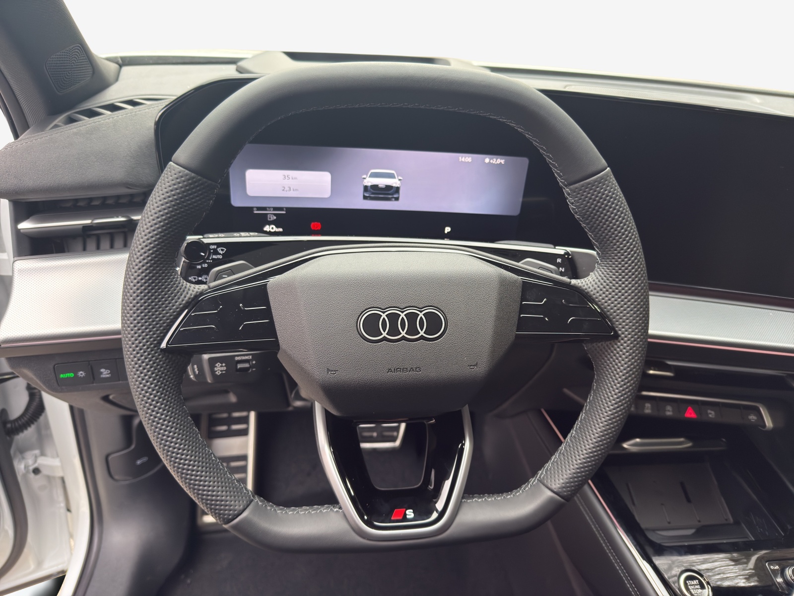 Assist: Parkassistent plus mit Einparkhilfe mit Umgebungsanzeige Komfortschlüssel ohne Safelock Lackierung: Metallic-Lackierung Lenkrad: Sportlederlenkrad, 3-Speichen, oben und unten abgeflacht mit Multifunktion, Licht: Digitale OLED-Heckleuchten Licht: Fernlicht-Assistent Media: Telefonablage mit induktiver Ladefunktion und Mobilfunk-Koppelantenne Paket: Assistenzpaket Fahren und Parken pro und Assistenzpaket Schutz- und Warnsysteme plus Paket: Interieur S line mit Sportsitzen in Leder/Kunstleder-Kombination schwarz Paket: Klimatisierungspaket plus Paket: MMI experience pro Paket: Optikpaket schwarz Paket: Paket Premium experience Panorama-Schiebedach (1-teilig) Räder: Räder Audi Sport, Vielspeichen-S, schwarz metallic, glanzgedreht, abgedunkelt Sonnenschutzverglasung, abgedunkelt