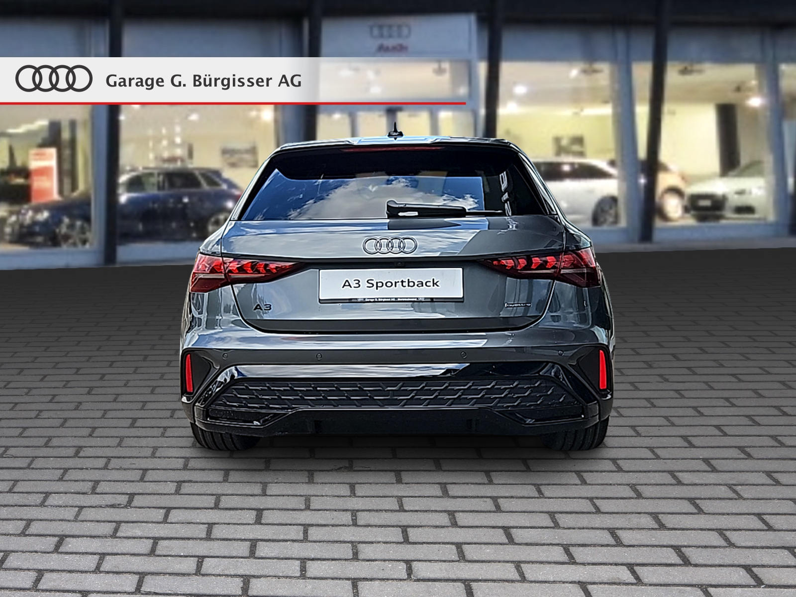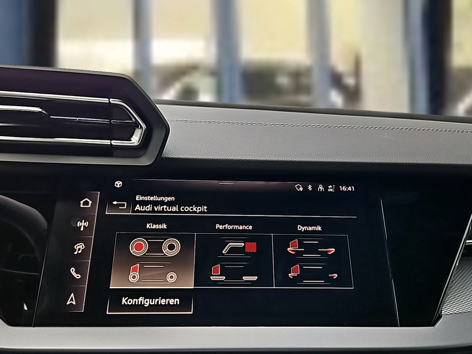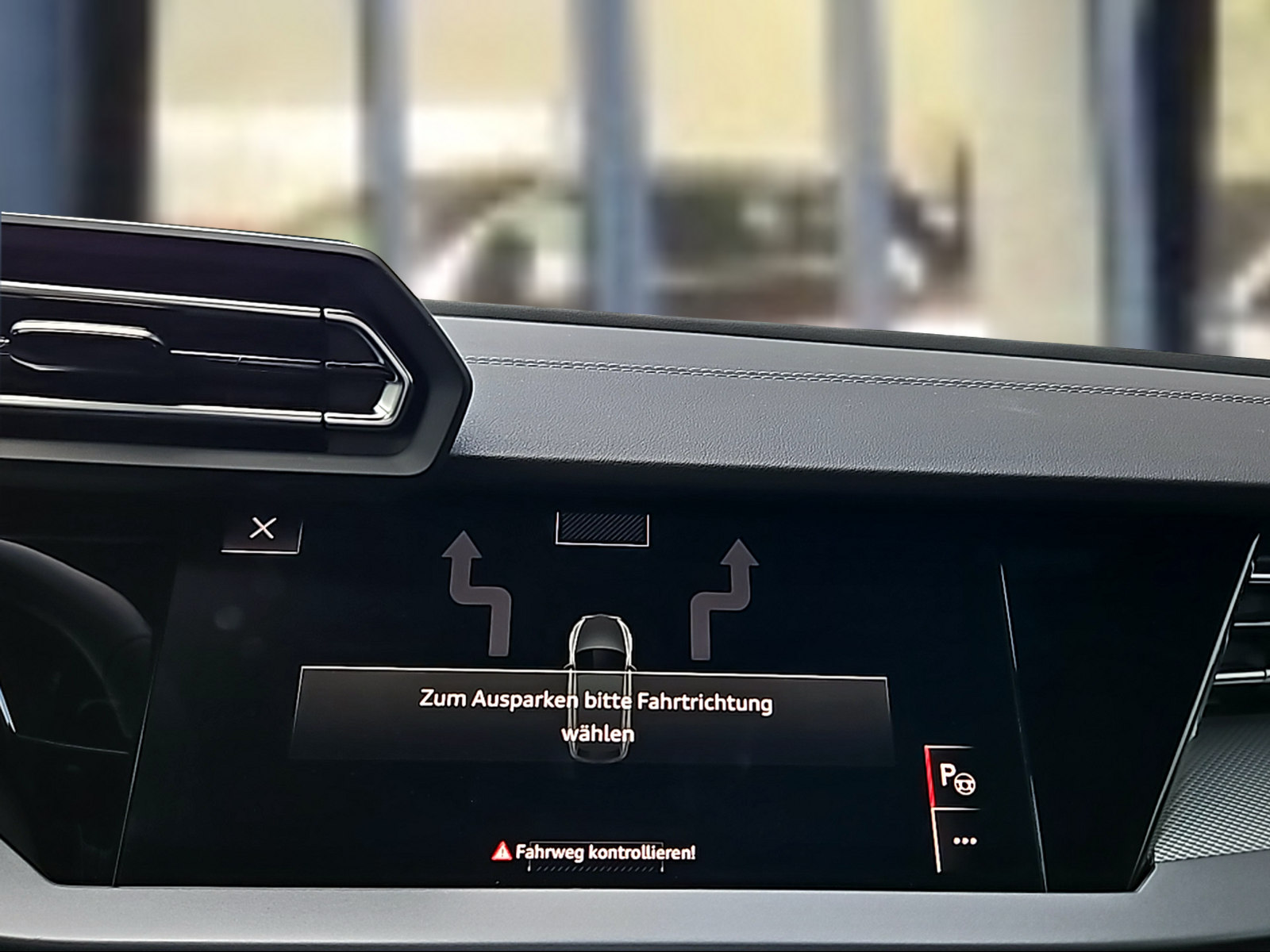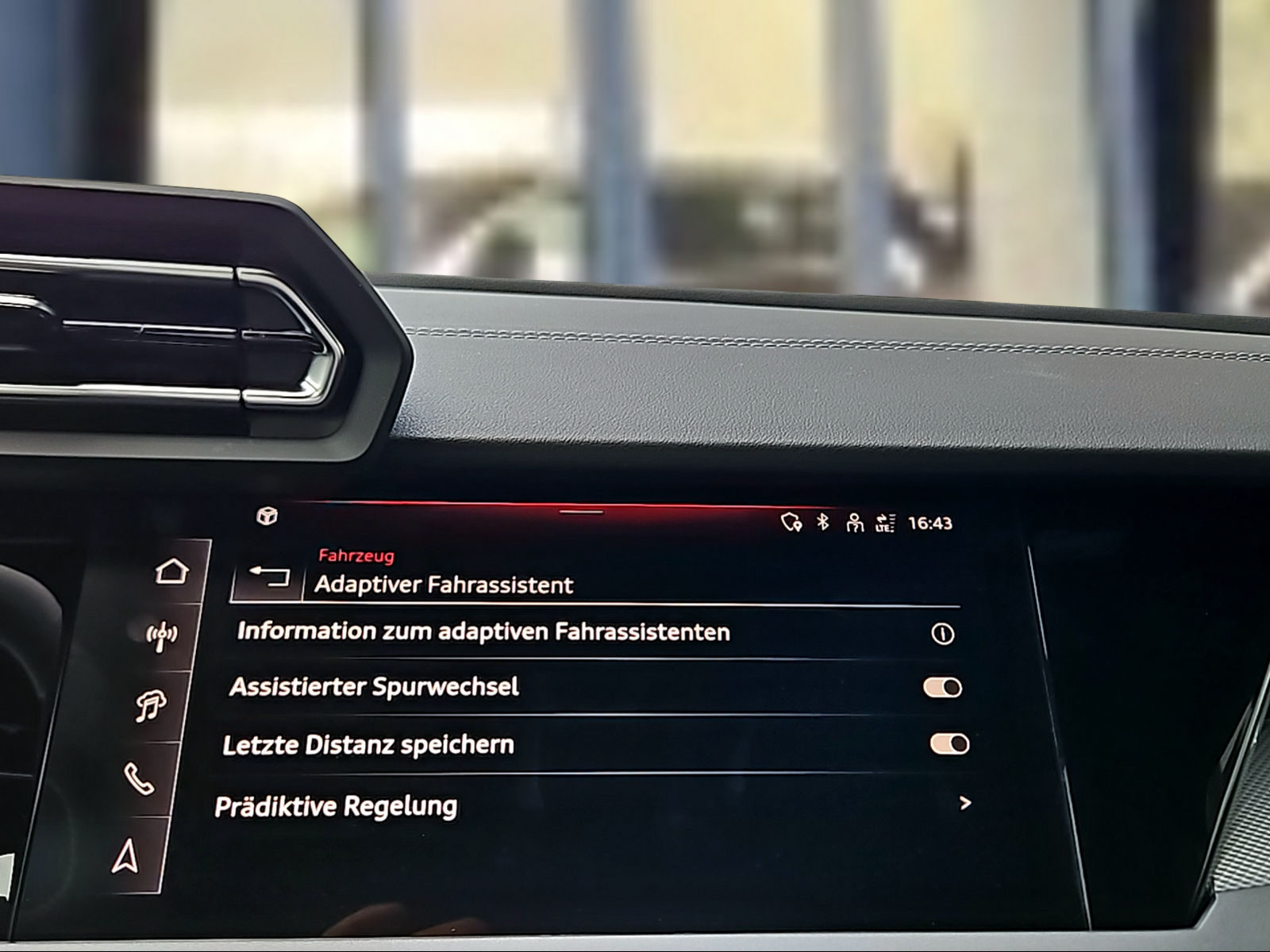 Assist: Adaptiver Fahrassistent mit Notfallassistent Aussenspiegelgehäuse in Schwarz Dekor: Dekoreinlage Aluminium Spektrum dunkel Lackierung: Perleffekt-Lackierung Paket: Ambiente-Lichtpaket pro Paket: Assistenzpaket Fahren und Parken pro und Assistenzpaket Schutz- und Warnsysteme plus Paket: Interieur S mit Sportsitzen, Mikrofaser Dinamica/Kunstleder-Kombination schwarz Paket: Klimatisierungspaket plus Paket: Matrix LED-Scheinwerfer, LED-Heckleuchten und Scheinwerfer-Reinigungsanlage Paket: Optikpaket schwarz plus Paket: Paket Premium Plus A3 Sportback / allstreet Räder: Leichtmetallräder Audi Sport 19 Zoll 5-Doppelspeichen-Edge, anthrazitschwarz, glanzgedreht Sonnenschutzverglasung, abgedunkelt Vorbereitung für Anhängevorrichtung