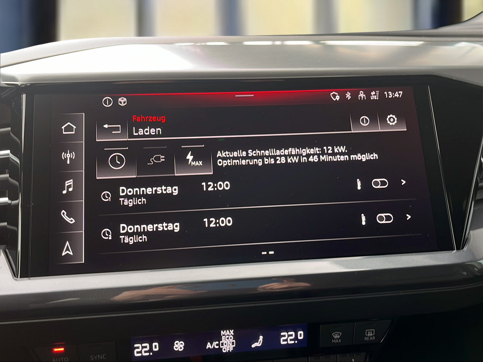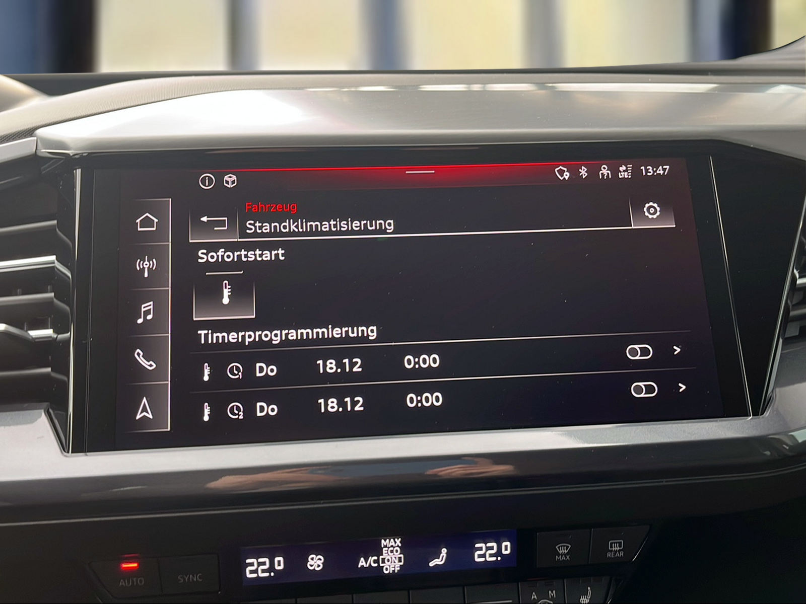 3-Punkt-Sicherheitsgurte auf allen Plätzen Airbag: Airbag für Fahrer und Beifahrer mit Beifahrer-Airbag-Deaktivierung Airbag: Seitenairbags vorn, mit Kopfairbag und Interaktionsairbag vorn Assist: Ablenkungs- und Müdigkeitserkennung Assist: Einparkhilfe hinten Assist: Geschwindigkeitsregelanlage FOD: ACC möglich Assist: Geschwindigkeitsregelanlage mit einstellbarem Geschwindigkeitsbegrenzer Assist: Kamerabasierte Verkehrszeichenerkennung Assist: Proaktiver Insassenschutz Front, Seite und Heck Assist: Speedlimiter mit Intelligent Speed Assist Assist: Spurverlassenswarnung inkl. Notfallassistent Aussenspiegel in Wagenfarbe Bottom line rundum in genarbter Optik Dekor: Dekoreinlage Haptiklack schwarz Elektronisches Stabilitäts-Programm (ESP) Entfall Leistungs- / Technologie-Schriftzug Entfall Modellbezeichnung und Leistungs- / Technologie-Schriftzug Fahrwerk: Komfortfahrwerk Funkschlüssel, ohne Safelock Garantie: 2 Jahre ohne Kilometerbegrenzung (ab 1. Inv.) Garantie: Audi Swiss Service Package + (ASSP+) Gepäckraumklappe elektrisch mit sensorgesteuerter Gepäckraumentriegelung Gepäckraumklappe ohne sensorgesteuerte Gepäckraumentriegelung Getriebe: Direktantrieb, kein Getriebe Haushaltsstecker Typ J (Schweiz) für das e-tron Ladesystem Industriestecker CEE 16A, 400V, lang und gerade für das e-tron Ladesystem Klima: Komfort Standklimatisierung Klima: Standklimatisierung Komfortmittelarmlehne vorne Lackierung: Uni-Lackierung Ladekabel Mode 3 Typ 2 32A Lenkrad: Doppelspeichen-Sportlederlenkrad, oben und unten abgeflacht mit Multifunktion Licht: Drittes Bremslicht Licht: Nebelschlussleuchte Media: Bluetooth-Schnittstelle Media: Digitaler Radioempfang (DAB) Modellbezeichnung Technologieschriftzug Performance Typenzeichen Paket: Glanzpaket mit horizontalen Fensterzierleisten in eloxiertem Aluminium Paket: Sicherheitspaket plus Räder: Leichtmetallräder Audi Sport, 5-W-Speichen-Stern, bronze matt Räder: Leichtmetallräder, 5-Arm Räder: Leichtmetallräder, 5-Y-Speichen Räder: Reifendruck-Kontrollanzeige Räder: Reifenreparatur-Set (Tire Fit) Sitze: Interieur mit Normalsitzen in Stoff Index schwarz Sitze: Kindersitzbefestigung i-Size auf der Beifahrerseite und i-Size und Top Tether Sitze: Vordersitze heizbar Sitze: Vordersitze manuell einstellbar Verbandmaterial,Warndreieck und Warnveste Wegfahrsperre elektronisch Wärmeschutzverglasung grün getönt Zentralverriegelung mit Fernbedienung ohne Dacheinsatz (Volldach) ohne Ladekabel (Industriestecker) ohne Scheinwerferreinigungsanlage