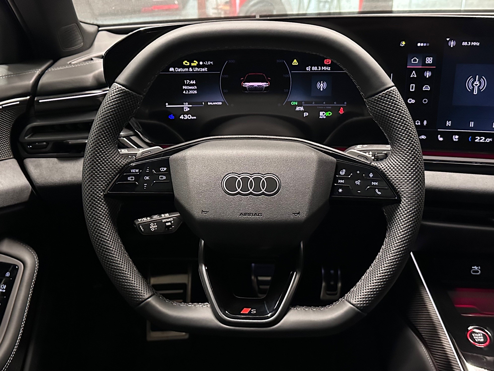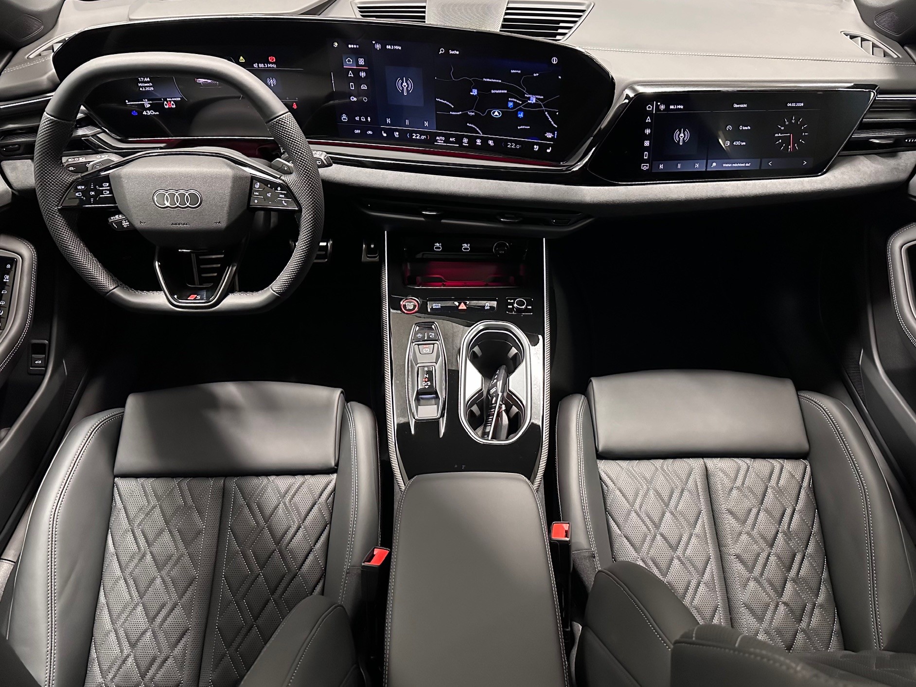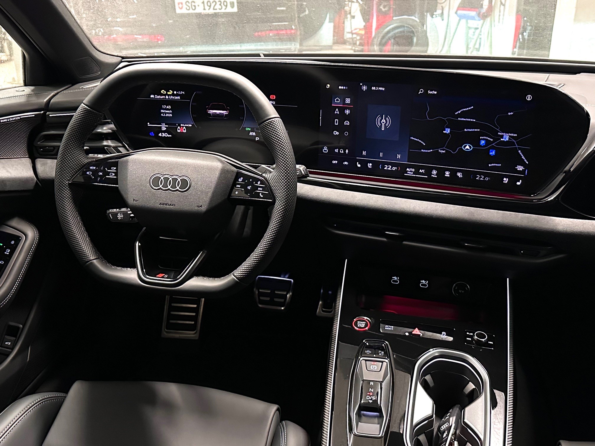 [60Q] Räder: Räder Audi Sport, Vielspeichen-S, schwarz metallic, glanzgedreht - 8,5 J x 21, Reifen 255/35 R21 [0E] mythosschwarz metallic [2V4] Paket: Luftqualität-Paket [QJ3] Dekor: Interieurapplikationen Vanadiumoptik [A41] Garantie: Audi Swiss Service Package + (ASSP+) - Reparatur 3 Jahre oder 100 000 km, Service 10 Jahre oder 100 000 km - Es gilt jeweils das zuerst Erreichte [GX] schwarz, Naht stahlgrau, Himmel schwarz (S line) [7HD] Dekor: Interieurelemente oben und unten Leder Audi Sport GmbH [8RT] Media: Bang & Olufsen Premium Soundsystem mit 3D-Klang und Kopfstützenlautsprechern [3GN] Schienensystem mit Fixierset
