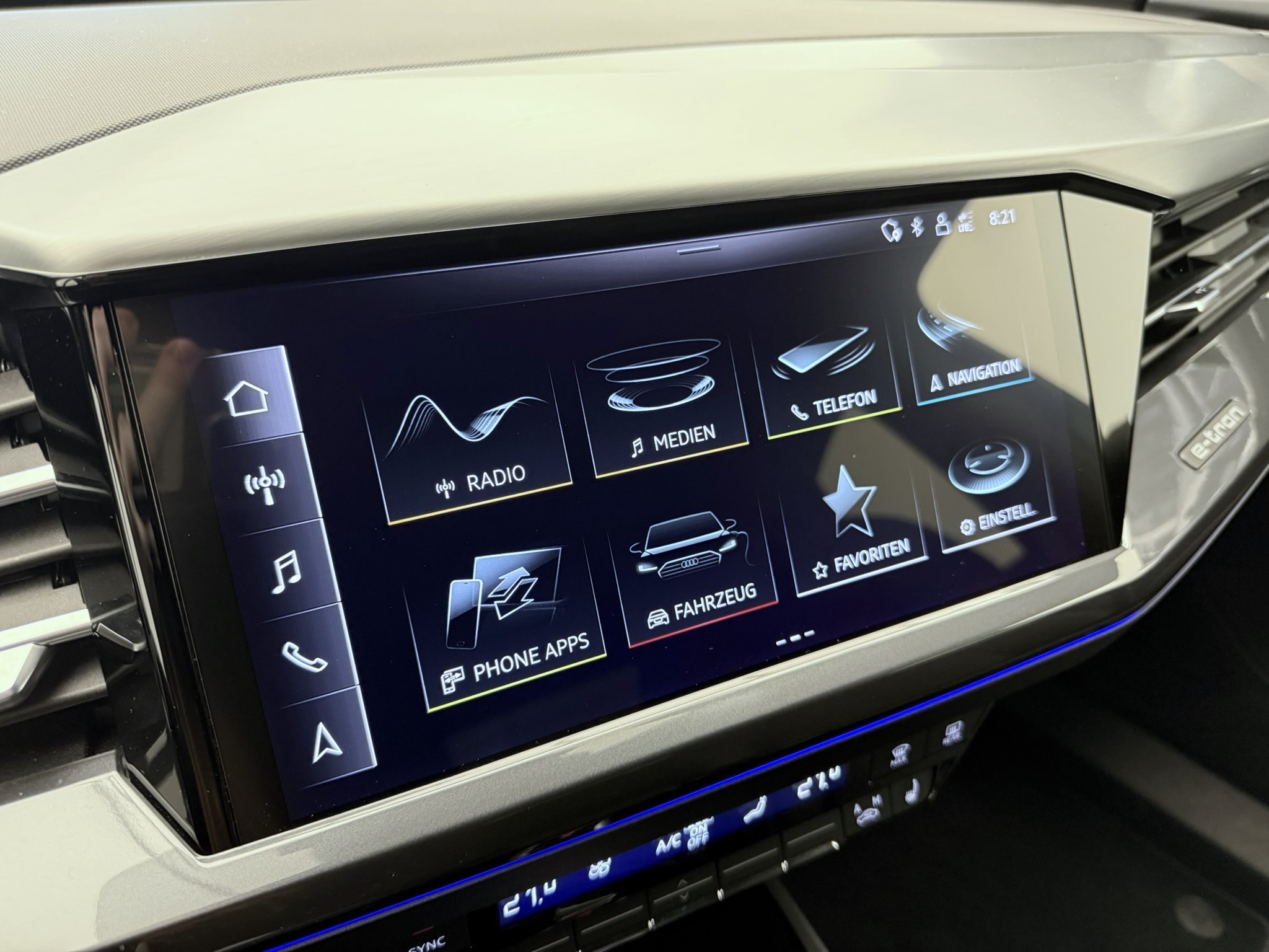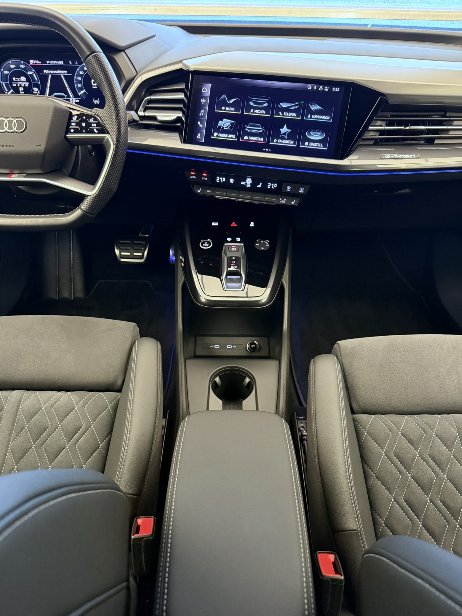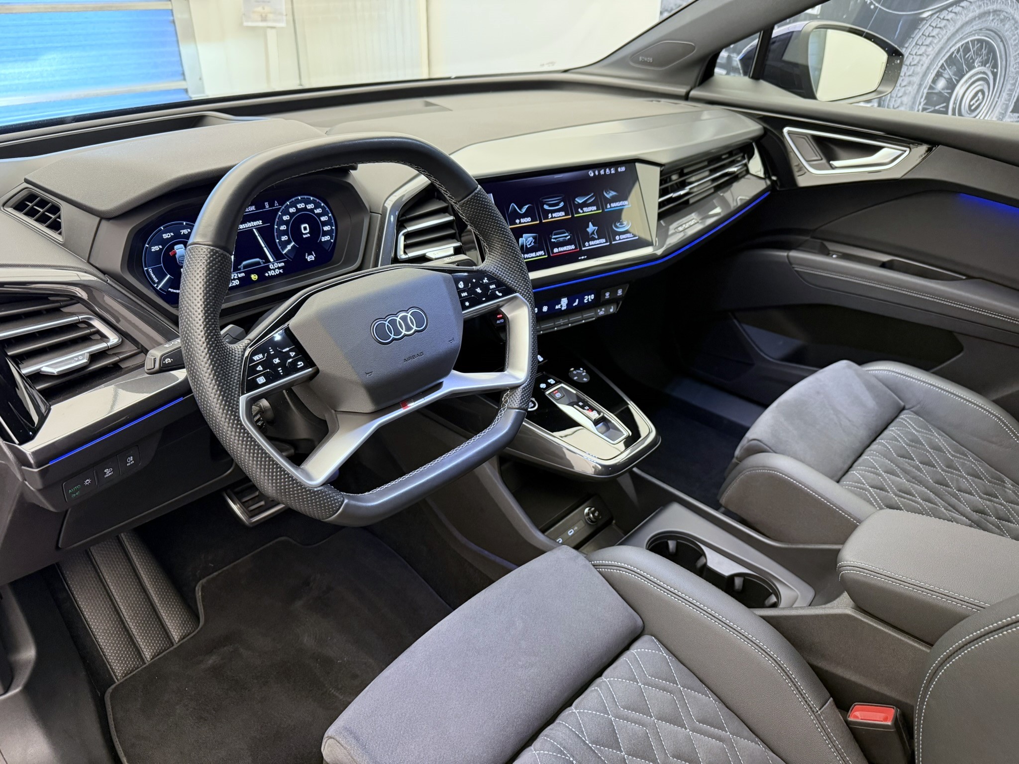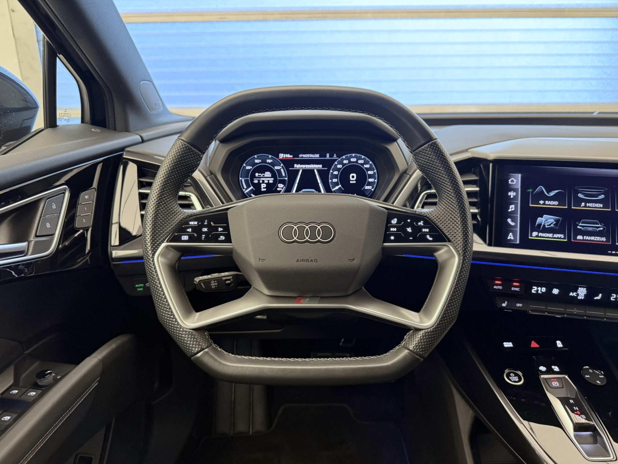 3-Punkt-Sicherheitsgurte auf allen Plätzen Airbag: Airbag für Fahrer und Beifahrer mit Beifahrer-Airbag-Deaktivierung Airbag: Seitenairbags vorn, mit Kopfairbag und Interaktionsairbag vorn Assist: Einparkhilfe hinten Assist: Geschwindigkeitsregelanlage mit einstellbarem Geschwindigkeitsbegrenzer Assist: Kamerabasierte Verkehrszeichenerkennung Assist: Proaktiver Insassenschutz Front, Seite und Heck Assist: Spurverlassenswarnung Aussenspiegel in Wagenfarbe Bottom line rundum in genarbter Optik Dekor: Dekoreinlage Haptiklack schwarz Elektronisches Stabilitäts-Programm (ESP) Fahrwerk: Komfortfahrwerk Funkschlüssel, ohne Safelock Garantie: 2 Jahre ohne Kilometerbegrenzung (ab 1. Inv.) Gepäckraumklappe (manuell) Gepäckraumklappe elektrisch öffnend und schliessend Getriebe: Direktantrieb, kein Getriebe Klima: Komfort Standklimatisierung Klima: Standklimatisierung Komfortmittelarmlehne vorne Lackierung: Uni-Lackierung Ladekabel Mode 3 Typ 2 32A Lenkrad: Doppelspeichen-Sportlederlenkrad, oben und unten abgeflacht mit Multifunktion Licht: Drittes Bremslicht Licht: Nebelschlussleuchte Media: Bluetooth-Schnittstelle Media: Digitaler Radioempfang (DAB) Modellbezeichnung Technologieschriftzug Performance Typenzeichen Paket: Glanzpaket mit horizontalen Fensterzierleisten in eloxiertem Aluminium Räder: Leichtmetallräder, 5-W-Speichen-Aero, graphitgrau, glanzgedreht Räder: Reifendruck-Kontrollanzeige Räder: Reifenreparatur-Set (Tire Fit) Sitze: Interieur mit Normalsitzen in Stoff Index schwarz Sitze: Kindersitzbefestigung i-Size auf der Beifahrerseite und i-Size und Top Tether Sitze: Vordersitze heizbar Sitze: Vordersitze manuell einstellbar Verbandmaterial,Warndreieck und Warnveste Wegfahrsperre elektronisch Wärmeschutzverglasung grün getönt Zentralverriegelung mit Fernbedienung ohne Audi connect Navigation & Infotainment ohne Dacheinsatz (Volldach) ohne Ladekabel (Industriestecker) ohne Scheinwerferreinigungsanlage
