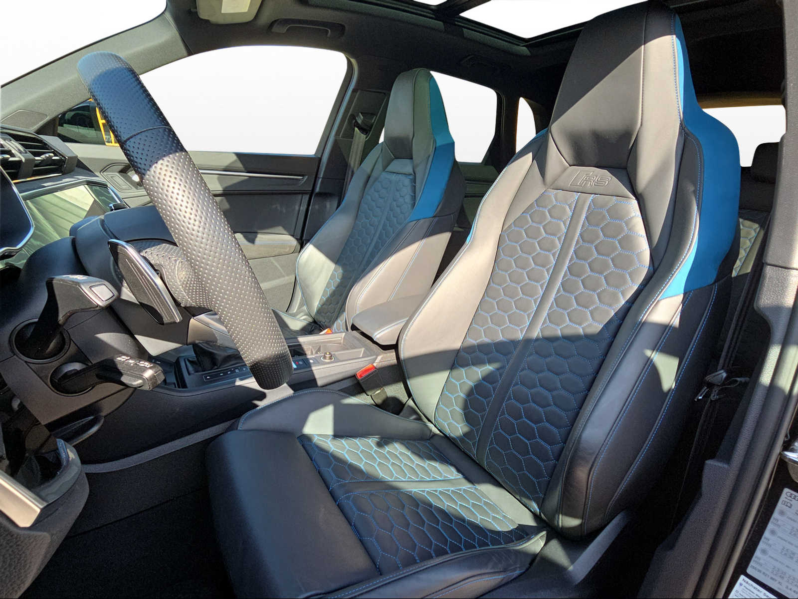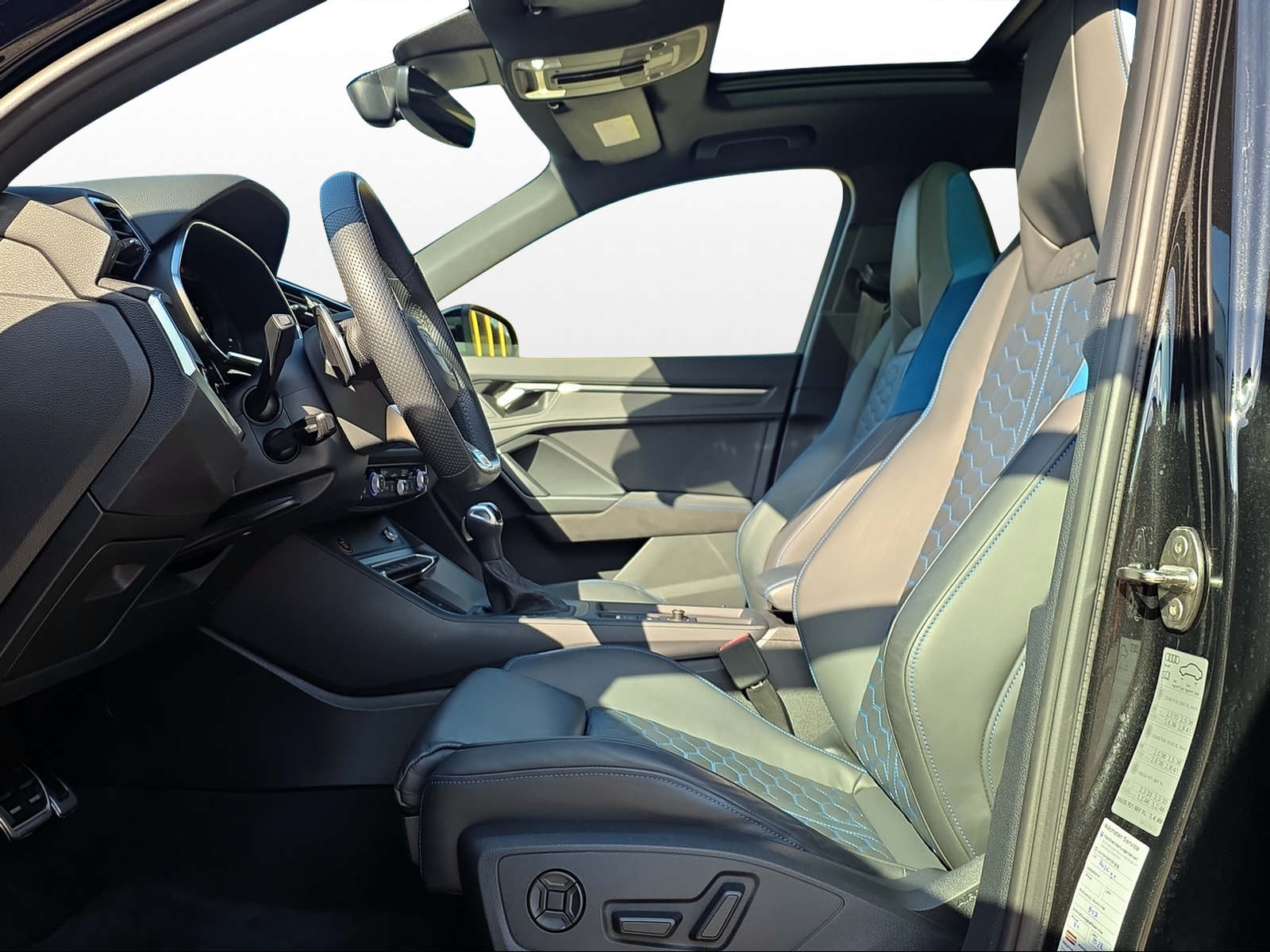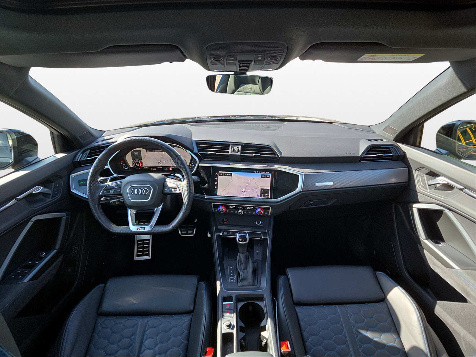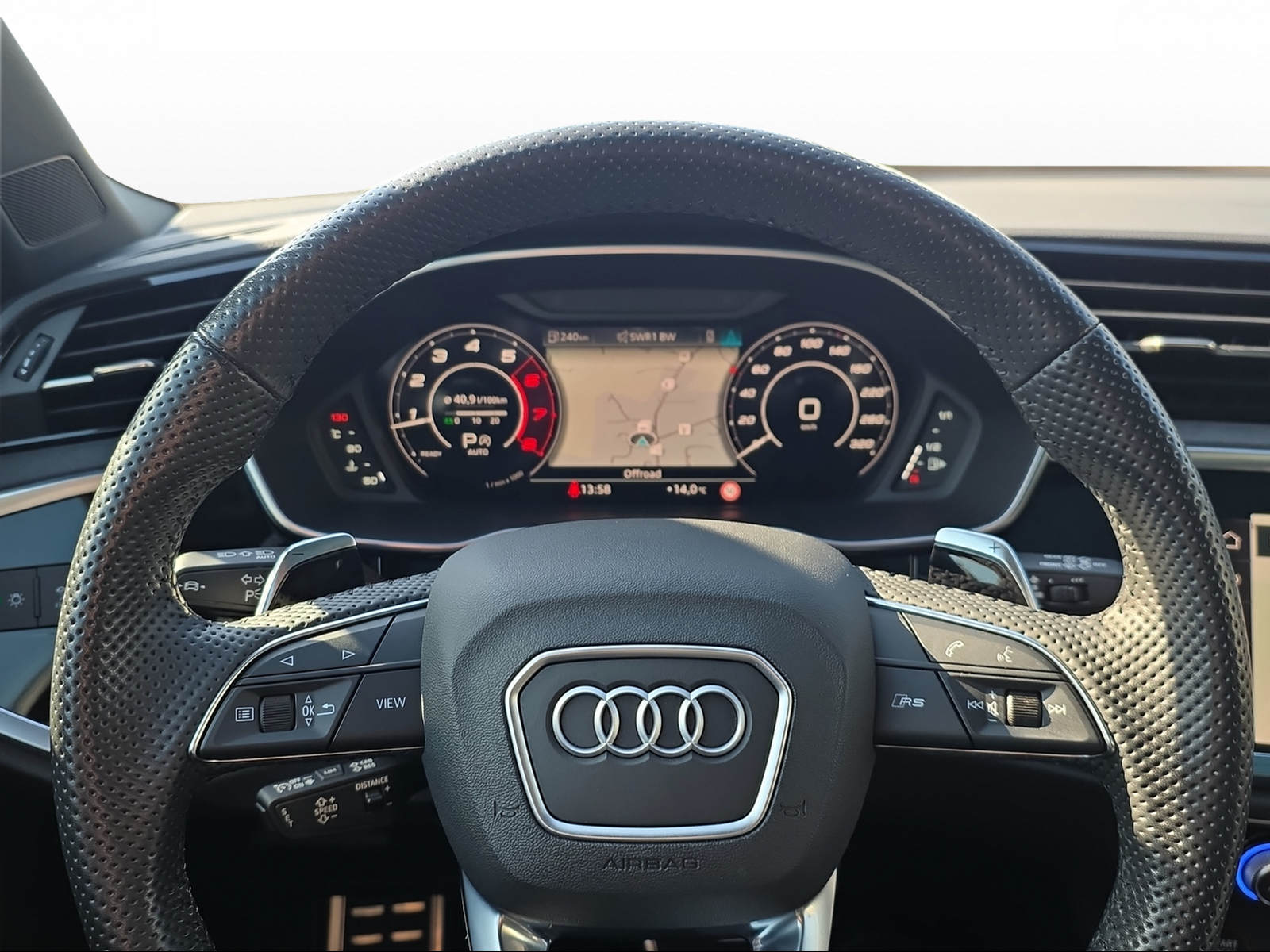 Assist: Adaptiver Geschwindigkeitsassistent Aussenspiegel in Wagenfarbe Klima: 2-Zonen-Komfortklimaautomatik Komfortschlüssel inkl. Diebstahlwarnanlage Lackierung: Metallic-Lackierung Licht: Abgedunkelte Matrix LED-Scheinwerfer mit dynamischem Blinklicht Media: Audi connect Remote & Control Media: Bang & Olufsen Premium Soundsystem mit 3D Klang Paket: Ablagen- und Gepäckraumpaket Polster: RS-Sportsitze vorn in Leder Feinnappa mit Wabensteppung Privacy-Verglasung (Scheiben abgedunkelt) Rahmenloser Innenspiegel automatisch abblendbar Räder: Leichtmetallräder 21 Zoll - 5-V-Speichen-Polygon, anthrazitschwarz, glanzgedreht Sitze: Vordersitze elektrisch verstellbar