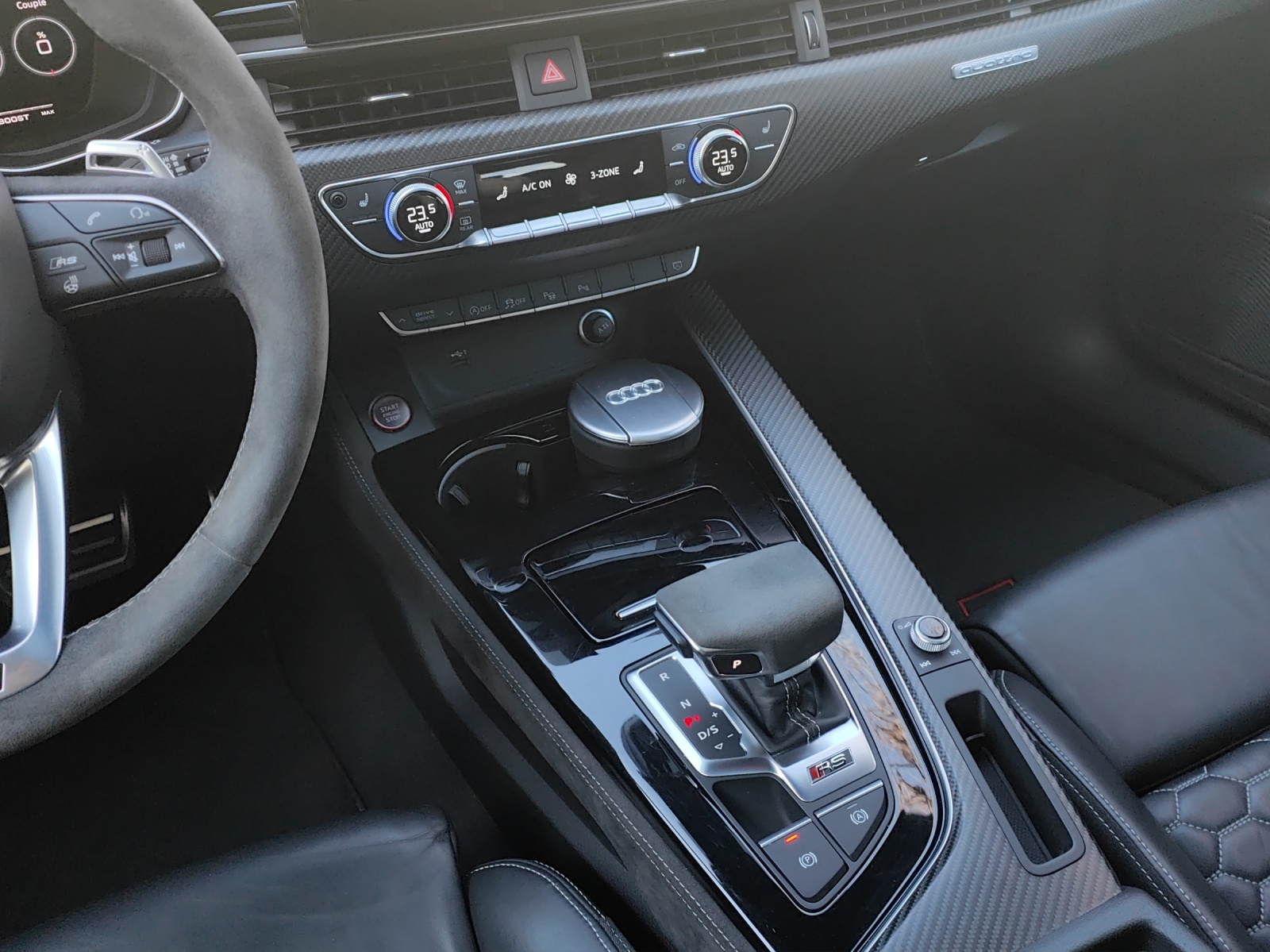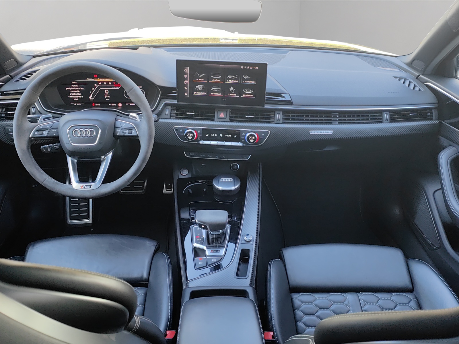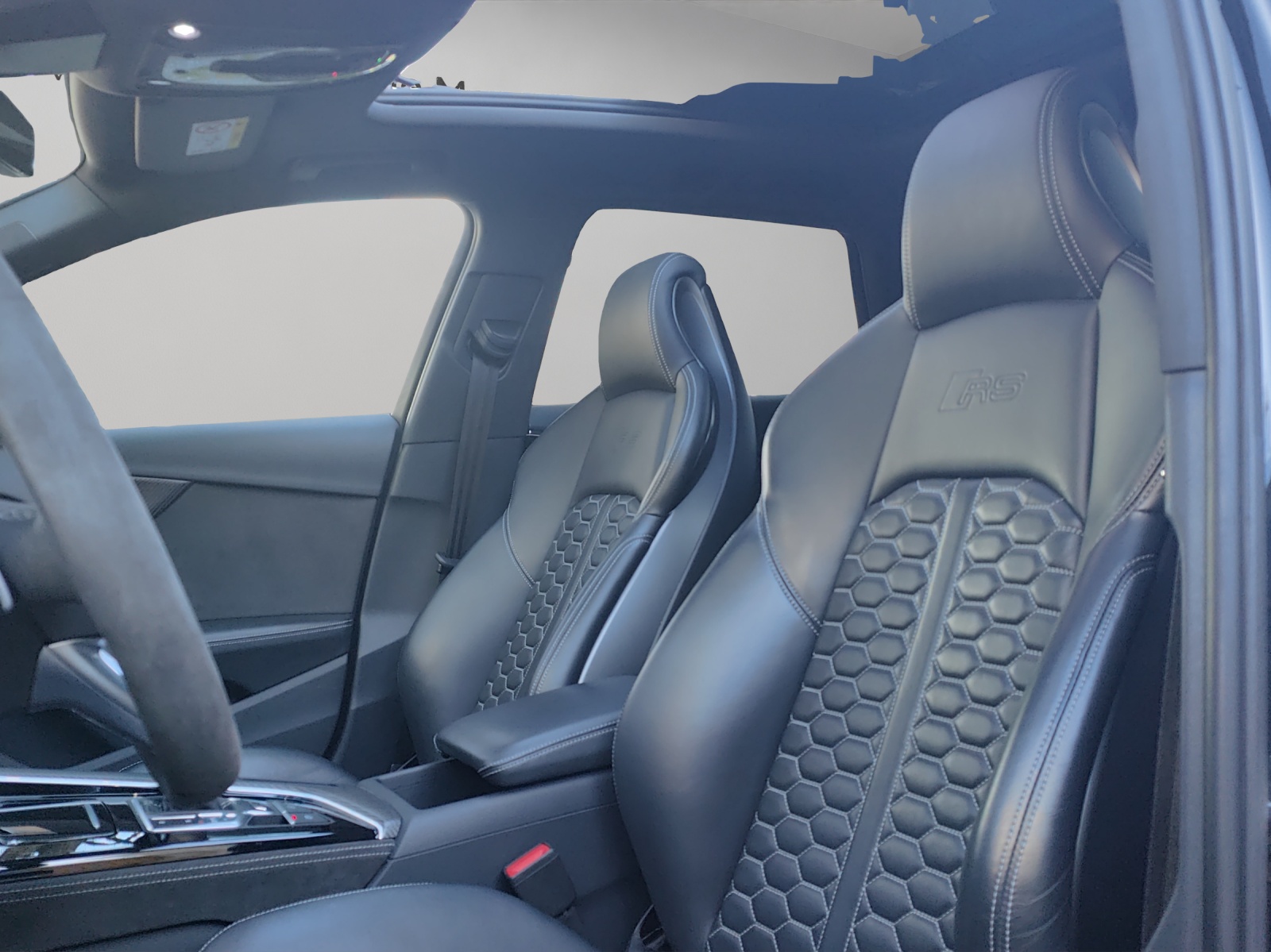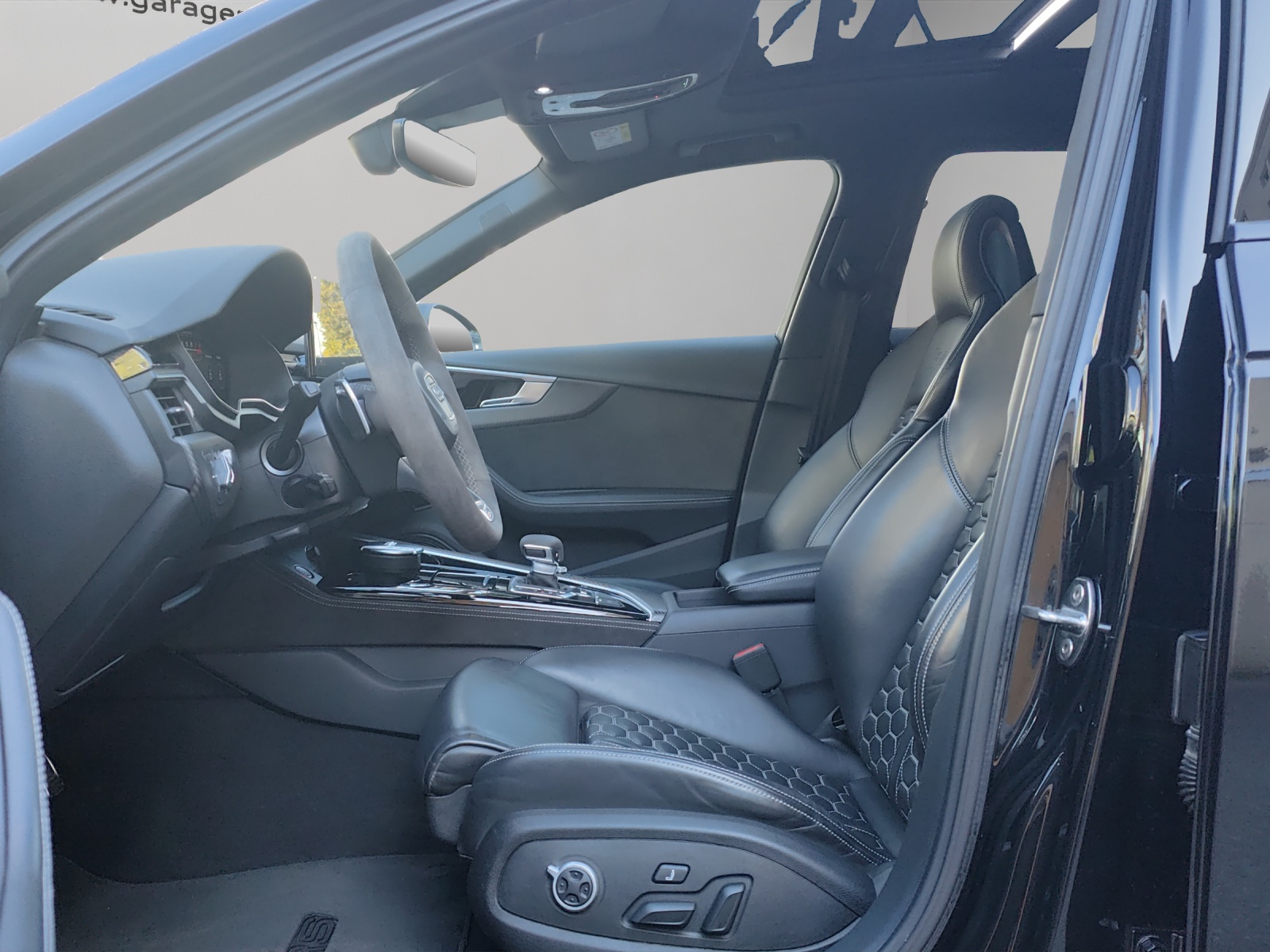[0E] noir mythe métallisé [0VB] Papiers français [GB1] Support LTE pour Audi phone box [N1H] Tissu: Housses de siège en cuir Nappa fin avec matelassage en nid d'abeille pour sièges sport RS à [PEG] Pak: pack de conception RS gris - Éléments de commande en noir Alcantara avec surpiqûres contrastées gris roche - Accoudoirs dans les portes en cuir Nappa fin, noir avec surpiqûres contrastées gris rock - Console centrale latérale en noir Alcan [U22] Roues alu 9J x 20, design 5-Y-branches noir metalisée, pneus 275/30 R20 [UB] noir - gris rocher [VC2] Commande d'ouverture de porte de garage Véhicule Suisse / Garantie d'usine 5ans ou 100'000km depuis 1ère mise en circulation / RS Compétition plus / 1ère mains / Services gratuit * 10ans ou 100'000km hors liquides