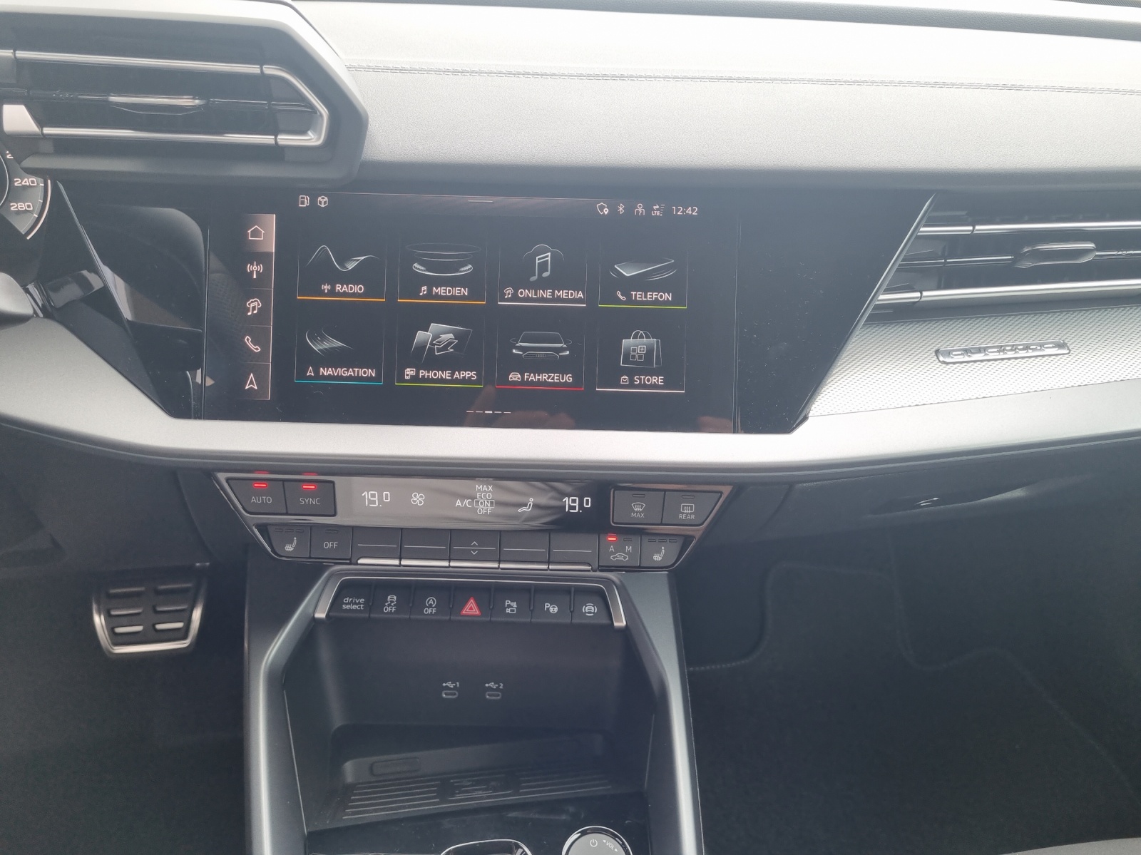 Assist: Adaptiver Fahrassistent mit Notfallassistent Assist: Spurwechselwarnung mit Ausstiegswarnung und Querverkehrassistent hinten Dekor: Dekoreinlage Aluminium Spektrum dunkel Entfall Modellbezeichnung Fahrwerk: Anpassung Bremsanlage Fahrwerk: Sportfahrwerk mit max. 19'' Felgen Lackierung: Metallic-Lackierung Paket: Ambiente-Lichtpaket pro Paket: Assistenzpaket Fahren und Parken pro und Assistenzpaket Schutz- und Warnsysteme plus Paket: Interieur S mit Sportsitzen, Mikrofaser Dinamica/Kunstleder-Kombination schwarz Paket: Klimatisierungspaket plus Paket: Matrix LED-Scheinwerfer, LED-Heckleuchten und Scheinwerfer-Reinigungsanlage Paket: Optikpaket schwarz plus Paket: Paket Premium Plus A3 Sportback / allstreet Räder: Leichtmetallräder Audi Sport 19 Zoll 5-Doppelspeichen-Edge, anthrazitschwarz, glanzgedreht Scheinwerfer-Reinigungsanlage Sitze: Rücksitzlehne, geteilt umklappbar Sonnenschutzverglasung, abgedunkelt