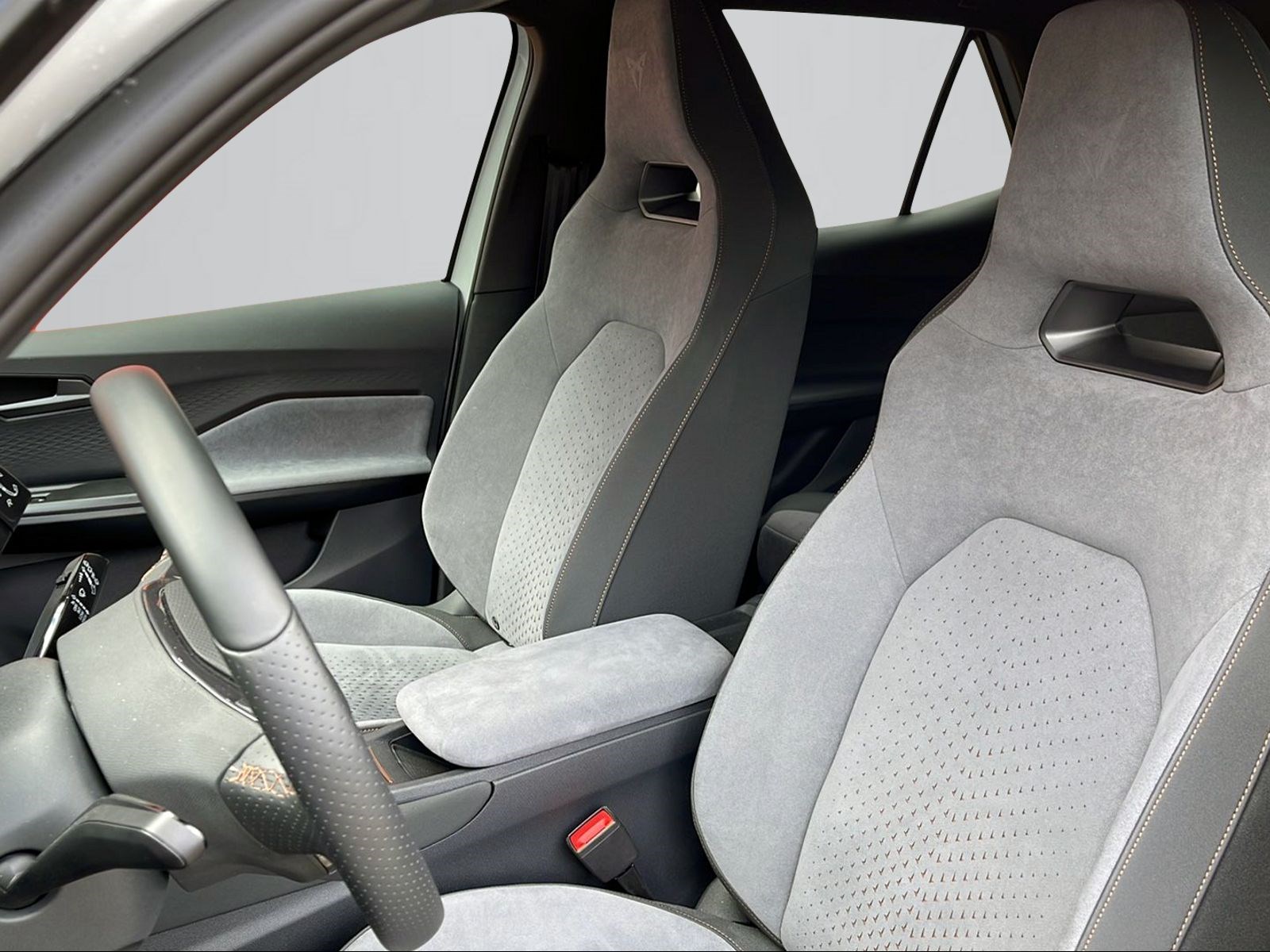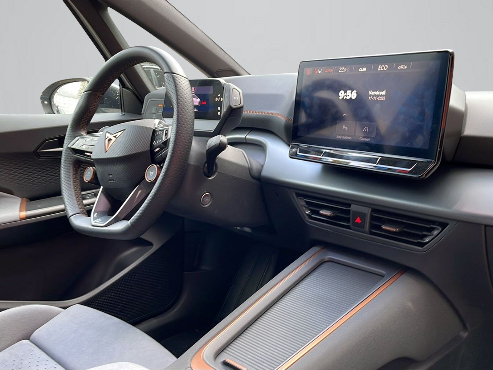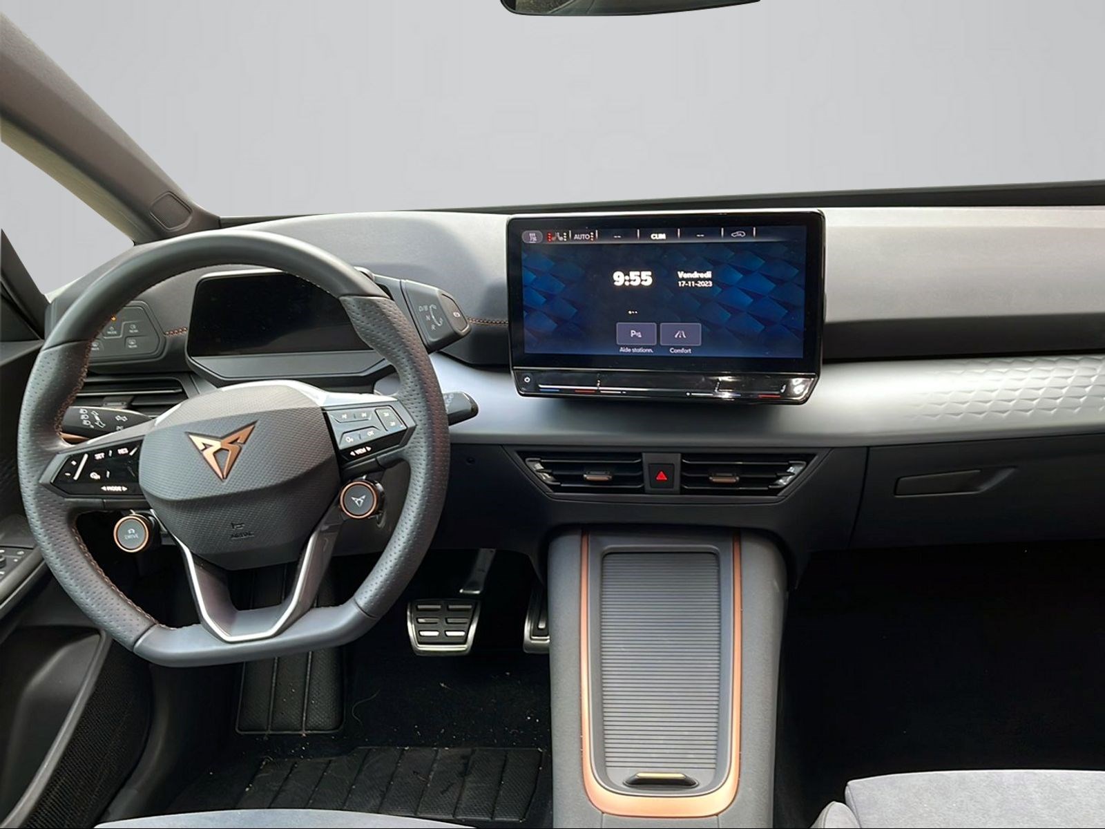 5.3" Full Digital Cockpit ABS, EBV répartiteur électronique de la force de freinage Airbag: Airbag conducteur et passager Airbag: Airbag passager désactivable Airbag: Airbags latéraux pour conducteur et passager avant Airbag: Airbags rideaux à l'avant et à l'arrière Assist: Contrôle de distance de parcage AV et AR avec contrôle optique Assist: Détecteur de pluie et de lumière Assist: Lane assist (assistant au maintien de la trajectoire) Assist: Support aux manoeuvres d’évitement / assistant de bifurcation Assist: Tiredness detection (détecteur de fatigue) CUPRA Drive Profile avec "driving experience button" Range, Comfort, Performance, CUPRA, Individual Ceintures de sécurité automatiques à trois points à toutes les places Clima: Chauffage supplémentaire électrique à air Clima: Climatronic 2 zones Cordon de charge (mode 3) Cordon de charge pour prise domestique (mode 2) Direction assistée dépendante de la vitesse Eclairage d'ambiance intérieur "Multicolore" avec 6 couleurs Essuie-glace AR intermittent avec lave-glace Feu arrière de brouillard Filtre à pollen (filtre à poussière) Garantie: Cupra 12 Jahre Gewährleistung gegen Karosserie-Durchrostung (ab 1. Inv.) Garantie: Cupra 3 Jahre Lack-Gewährleistung (ab 1. Inv.) Garantie: Cupra Garantie 2 Jahre ohne Kilometerbegrenzung (ab 1. Inv.) Garantie: Garantie Cupra Garantie de la batterie 8 ans ou 160 000 KM sur 70 % de la puissance de la batterie. Licht: Full LED-Scheinwerfer für Abblend-und Fernlicht und Coming Home Funktion inkl. Welcome Zeremonie Licht: LED-Nebelscheinwerfer Lumière: 3ème feu de stop Lumière: Combinaison complète de feux arrière à LED dans tout le pays Masquer soleil conducteur et passager avec miroir éclairé Media: 12" Infotainment (MIB3) Mèdias: 2 ports USB C arrière et front Mèdias: CUPRA Connect Online Infotainment pour navigation Mèdias: CUPRA Connect Safety & Services pour le systeme de navigation Mèdias: DAB+ (Digital Audio Broadcasting) Mèdias: Dispositif mains libres Bluetooth pour téléphone mobile Programme électronique de stabilité (ESP) avec contrôle de la pression des pneus, assistance au freinage (BAS) et différentiel à glissement limité Roues: Jantes en alu 7.5J x 19", "TYPHOON" 31/1 Machined en Sport Black (215/50 R19) Roues: Tool Kit 19'' & 20'' Rétroviseur intérieur réglable jour/nuit automatique Rétroviseurs extérieurs en gris Cosmo, poignées de portieres en couleur de la carrosserie Rétroviseurs extérieurs réglables, chauffants et rabattables électriquement avec fonction d'abaissement du siège passager avant Sièges: Accoudoir central AV Sièges: Ancrage ISOFIX pour siège enfant à l'arrière Sièges: Dossier de banquette rabattable séparément 1/3 - 2/3 Sièges: Sieges baquets sport CUPRA en textile, noir "SEAQUAL" Sièges: Siège conducteur réglable en hauteur Verrouillage centralisé "Keyless-Go" Volant: Volant Supersport avec systeme de bouton de profil de démarrage/conduite, chauffant Volant: Volant cuir multifonction, chauffant