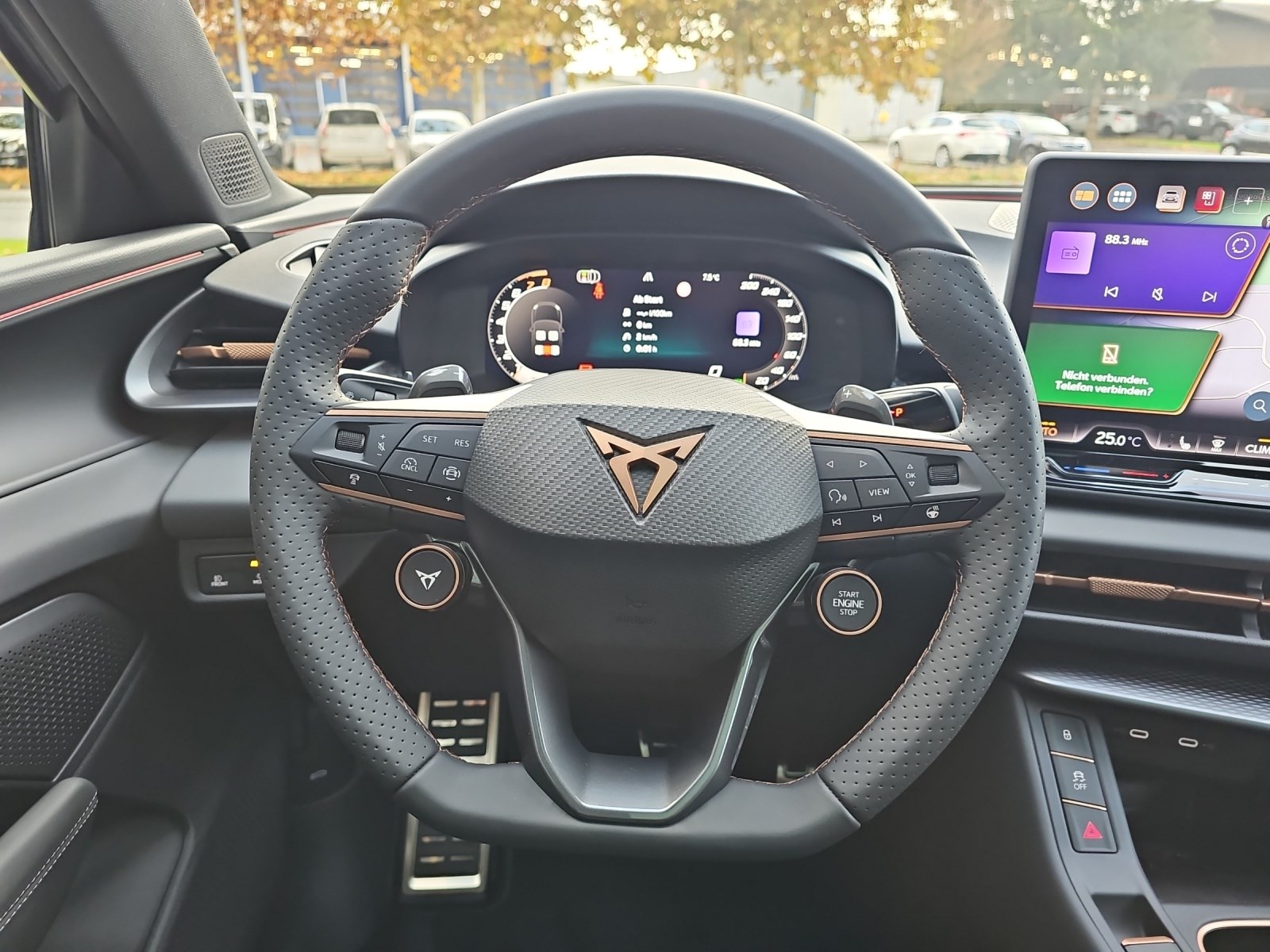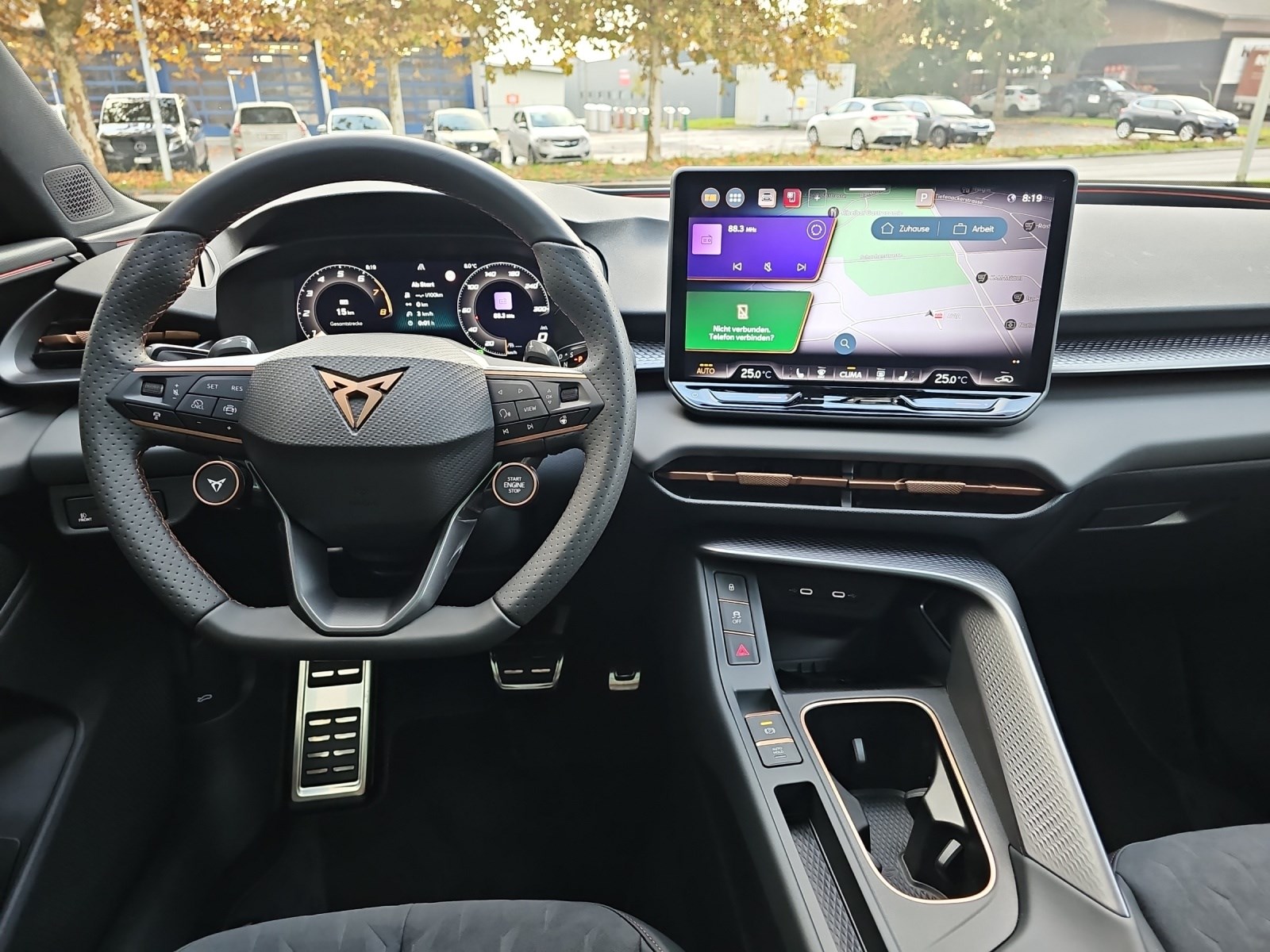 3-Punkt-Sicherheitsgurte auf allen Plätzen ABS, EBV elektronische Bremskraft-verteilung Abgedunkelte Scheiben ab B-Säule hinten Airbag: Airbag Beifahrer deaktivierbar Airbag: Airbag Fahrer und Beifahrer Airbag: Kopfairbags vorne und hinten Airbag: Seitenairbags für Fahrer und Beifahrer Alarmanlage mit Innenraumüberwachung Ambiente Innenraumbeleuchtung mit beleuchteten Türpanelen Assist: Aufmerksamkeits- und Müdigkeitserkennung (ADA) Assist: Ausweichunterstützung / Abbiegeassistent Assist: Automatische Distanzregelung ACC Assist: City Notbremsfunktion Assist: Einparkhilfe vorne und hinten mit Rückfahrkamera Assist: Elektronische Parkbremse mit Auto Hold Funktion Assist: Lane assist (Spurhalteassistent) Assist: Multifunktionskamera Assist: Multikollisionsbremse Assist: Prädiktive Speedlimiter Assist: Traffic sign recognition (Verkehrszeichenerkennung) Assist: Umfeldüberwachungssystem "Front-Assist" Aussenspiegel elektrisch einstell-, beheiz- und einklappbar Aussenspiegel mit LED-Umfeldbeleuchtung Beleuchtete Sonnenblende links mit abdeckbarem Spiegel und Lasche, rechts mit abdeckbarem Spiegel ESC mit EBA, DSR, XDS und Reifendruckkontrolle Einstiegsleisten beleuchtet Elektrische Fensterheber vorne und hinten mit Komfortschaltung und Einklemmschutz Fahrwerk: Adaptive Fahrwerksregelung DCC Fahrwerk: CUPRA Sportfahrwerk Fahrwerk: Progressivlenkung Fussmatten vorne und hinten Garantie: Cupra 12 Jahre Gewährleistung gegen Karosserie-Durchrostung Garantie: Cupra 3 Jahre Lack-Gewährleistung Garantie: Cupra Garantie 2 Jahre ohne Kilometerbegrenzung Heckklappe elektrisch öffnend und schliessend "Virtual Pedal" Heckscheiben-Wisch-/Waschanlage mit Intervall Innenspiegel automatisch abblendbar Klima: 3-Zonen Climatronic mit Fondraumbedienung Lackierung: Uni-Lackierung Lenkrad: Leder Multifunktionslenkrad mit Schaltwippen, beheizbar Licht: Drittes Bremslicht Licht: Durchgehende Full LED-Heckleuchten Licht: LED Heckleuchten mit beleuchtetem 3D CUPRA Logo Licht: LED-Heckleuchten mit dynamischem Blinklicht Licht: LED-Nebelscheinwerfer mit Cornering-Funktion Licht: LED-Scheinwerfer für Abblend- und Fernlicht Licht: Leuchtweitenregulierung dynamisch Licht: Nebelschlussleuchte Media: 12,9" Infotainment (MIB3) Media: 2 USB C Anschlüsse hinten und vorne Media: CUPRA Connect Remote & Access / CUPRA Connect Safety & Services Media: CUPRA Connectivity Box Media: DAB+ (Digital Audio Broadcasting) Media: Mobiltelefon Freisprechanlage Bluetooth Mittelarmlehne vorne und hinten Pyrotechnische Gurtstraffer und Gurtkraftbegrenzer Räder: Alufelgen 8.5J x 19", "COSMIC" Machined in Sport Black Matt & Silver Räder: Performance Reifen Räder: Reifendruckkontrollsystem Schlüsselloses Schliess- und Startsystem (KESSY Advance) Servolenkung mit geschwindigkeitsabhängiger Lenkkraftunterstützung Sitze: 3 verstellbare Kopfstützen hinten Sitze: CUPRA Sport Schalensitze in Textil, "DEEP OCEAN" "SEAQUAL" Sitze: Geteilt abklappbare Rücksitzlehne 1/3 - 2/3 Sitze: Geteilt abklappbare Rücksitzlehne mit Mittelarmlehne Sitze: Kindersitzverankerung ISOFIX hinten Sitze: Vordersitze höhenverstellbar mit Lendenwirbelstütze Stopp - Start- und Rekuperationssystem Wegfahrsperre elektronisch Zentralverriegelung mit Funkfernbedienung, 2 Funkschlüssel