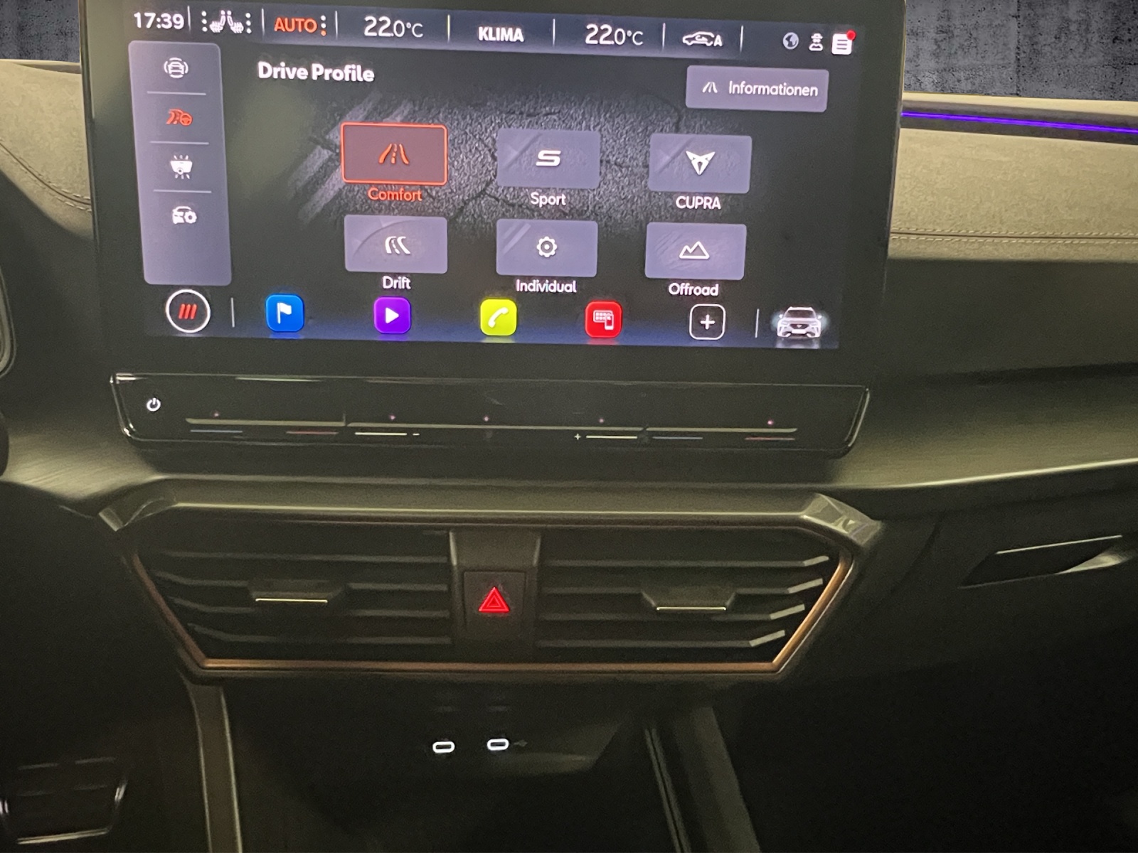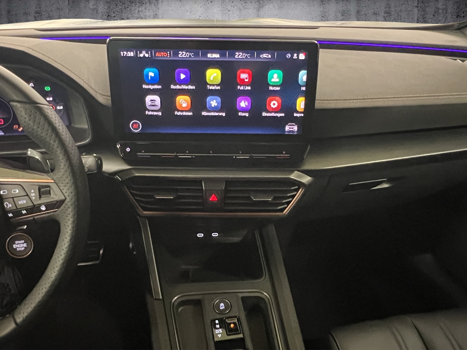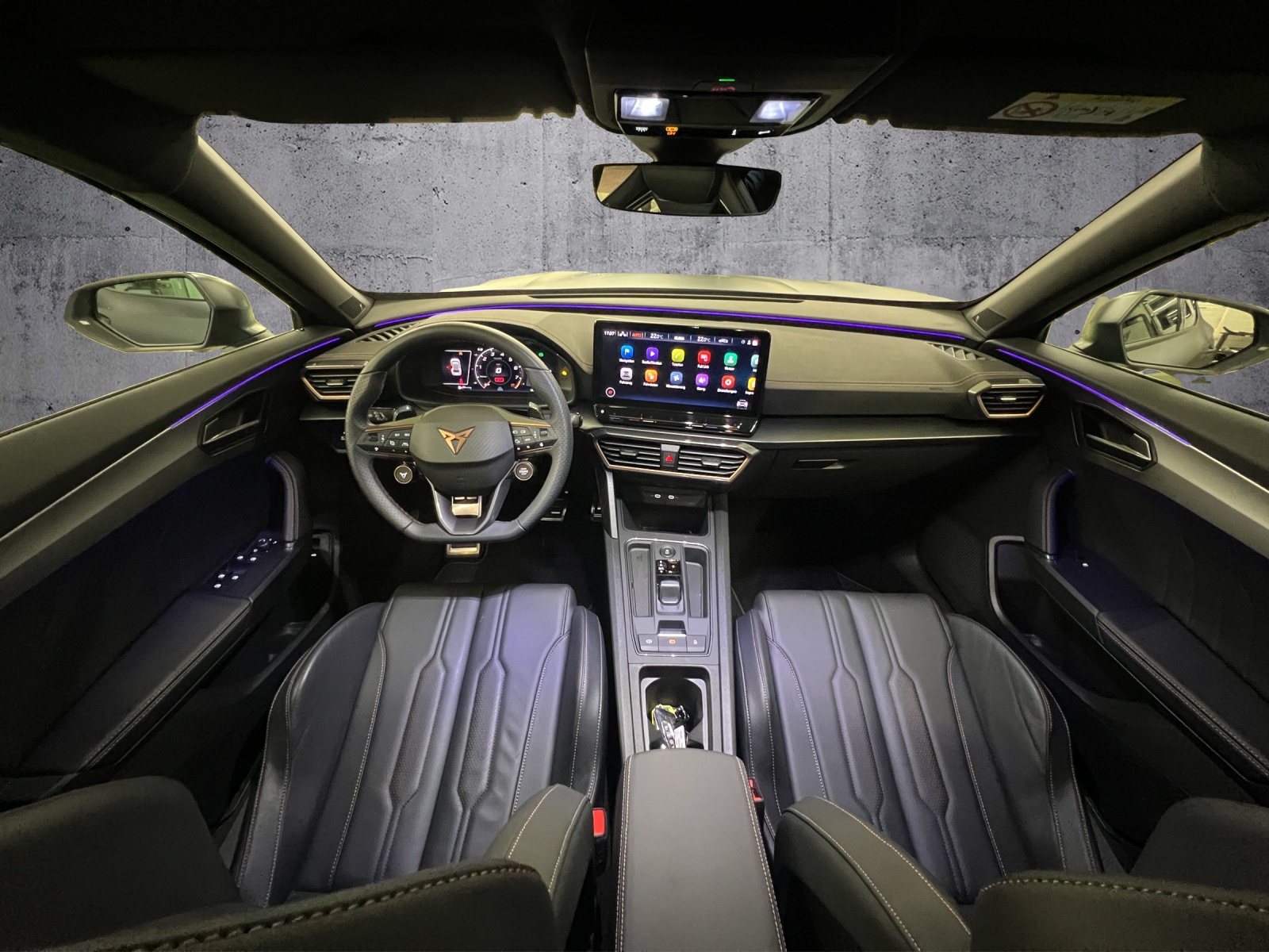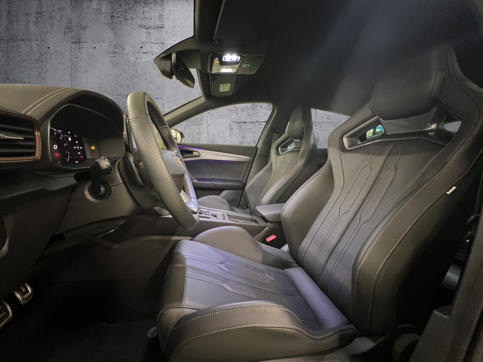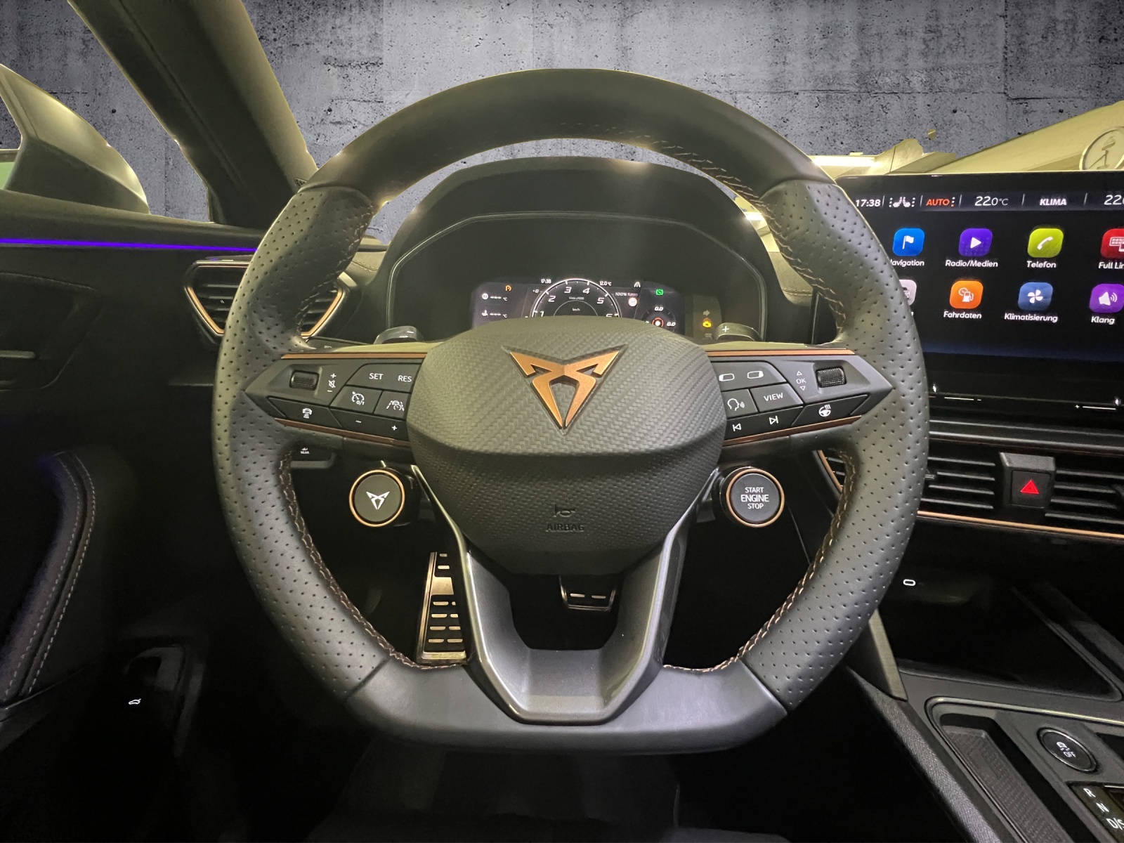 230-Volt Steckdose im Kofferraum und 12-Volt Steckdose in der Mittelkonsole 3-Punkt-Sicherheitsgurte auf allen Plätzen ABS, EBV elektronische Bremskraft-verteilung Abgedunkelte Scheiben ab B-Säule hinten Airbag: Airbag Beifahrer deaktivierbar Airbag: Airbag Fahrer und Beifahrer Airbag: Knie-Airbag für Fahrer Airbag: Kopfairbags vorne und hinten Airbag: Seitenairbag für Fahrer und Beifahrer Assist: City Notbremsfunktion Assist: Einparkhilfe vorne und hinten mit Rückfahrkamera Assist: Elektronische Parkbremse mit Auto Hold Funktion Assist: Exit Assist (Ausparkassistent) Assist: Exit Warning (Ausstiegswarner) Assist: Lane assist (Spurhalteassistent) Assist: Multifunktionskamera Assist: Multikollisionsbremse Assist: Parklenkassistent Assist: PreCrash Sicherheitssystem Assist: Prädiktive automatische Distanzregelung ACC Assist: Tiredness detection (Müdigkeitserkennung) Assist: Top View Camera (Rundumblick) Assist: Traffic Jam Assist (Stauassistent) Assist: Traffic sign recognition (Verkehrszeichenerkennung) Aussenspiegel elektrisch einstell-, beheiz- und einklappbar Aussenspiegel mit Beifahrerspiegelabsenkung Aussenspiegel mit LED-Umfeldbeleuchtung Automatisch abblendender Innenrückspiegel Beleuchtete Sonnenblende links mit abdeckbarem Spiegel und Lasche, rechts mit abdeckbarem Spiegel Bremsen mit 6-Kolben-AKEBONO-Bremssätteln CUPRA Drive Profile mit "driving experience button" Comfort, Sport, CUPRA, Individual, Snow, Offroad ESC mit EBA, DSR, XDS und Reifendruckkontrolle Elektrische Fensterheber vorne und hinten mit Komfortschaltung und Einklemmschutz Fahrwerk: Adaptive Fahrwerksregelung DCC Fahrwerk: Progressivlenkung Fussmatten vorne und hinten Garantie: Cupra 12 Jahre Gewährleistung gegen Karosserie-Durchrostung Garantie: Cupra 3 Jahre Lack-Gewährleistung Garantie: Cupra Garantie 2 Jahre ohne Kilometerbegrenzung Heckscheiben-Wisch-/Waschanlage mit Intervall Klima: 3-Zonen Climatronic mit Fondraumbedienung LED-Innenraumbeleuchtung mit Ambientebeleuchtung Smart Wraparound "Multicolor" Lackierung: Metallic-Lackierung Lenkrad: Supersportlenkrad mit Start-/ Drive Profile-Knopfsystem und Schaltwippen, beheizbar Licht : LED-Scheinwerfer für Abblend- und Fernlicht Licht: Coming Leaving Home Funktion Licht: Drittes Bremslicht Licht: Durchgehende Full LED-Heckleuchten Licht: LED-Heckleuchten mit dynamischem Blinklicht Licht: LED-Nebelscheinwerfer mit Cornering-Funktion Licht: Leuchtweitenregulierung dynamisch Media: 2 USB C Anschlüsse hinten und vorne Media: CUPRA Connectivity Box Media: CUPRA Navigationssystem 12" Infotainment (MIB3) Media: DAB+ (Digital Audio Broadcasting) Media: Kartenmaterial ''Europa'' Media: Mobiltelefon Freisprechanlage Bluetooth Pollenfilter (Staubfilter) Räder: Alufelgen 8,5J X 20", "Exclusive" Machined in Black/Copper Räder: Reifendruck-Kontrollanzeige Räder: Reserverad platzsparend Schlüsselloses Schliess- und Startsystem (KESSY) Seitliche Frontsplitter und Einsätze in Karbon Servolenkung mit geschwindigkeitsabhängiger Lenkkraftunterstützung Sitze: 2 verstellbare Kopfstützen vorne und 3 hinten Sitze: CUPRA Sport Schalensitze in "Sharp Textil schwarz" Sitze: Easy Backseat Release (Rücksitzentriegelung im Kofferraum) Sitze: Geteilt abklappbare Rücksitzlehne 1/3 - 2/3 Sitze: Kindersitzverankerung ISOFIX hinten Sitze: Mittelarmlehne hinten Sitze: Mittelarmlehne vorne Sitze: Sitzheizung für Vordersitze, getrennt regelbar Sitze: Vordersitze höhenverstellbar mit Lendenwirbelstütze Sportabgasanlage mit 4-Fach Endrohr und Karbon Heckdiffusor Stopp - Start- und Rekuperationssystem Wegfahrsperre elektronisch Zentralverriegelung mit Funkfernbedienung, 2 Funkschlüssel
