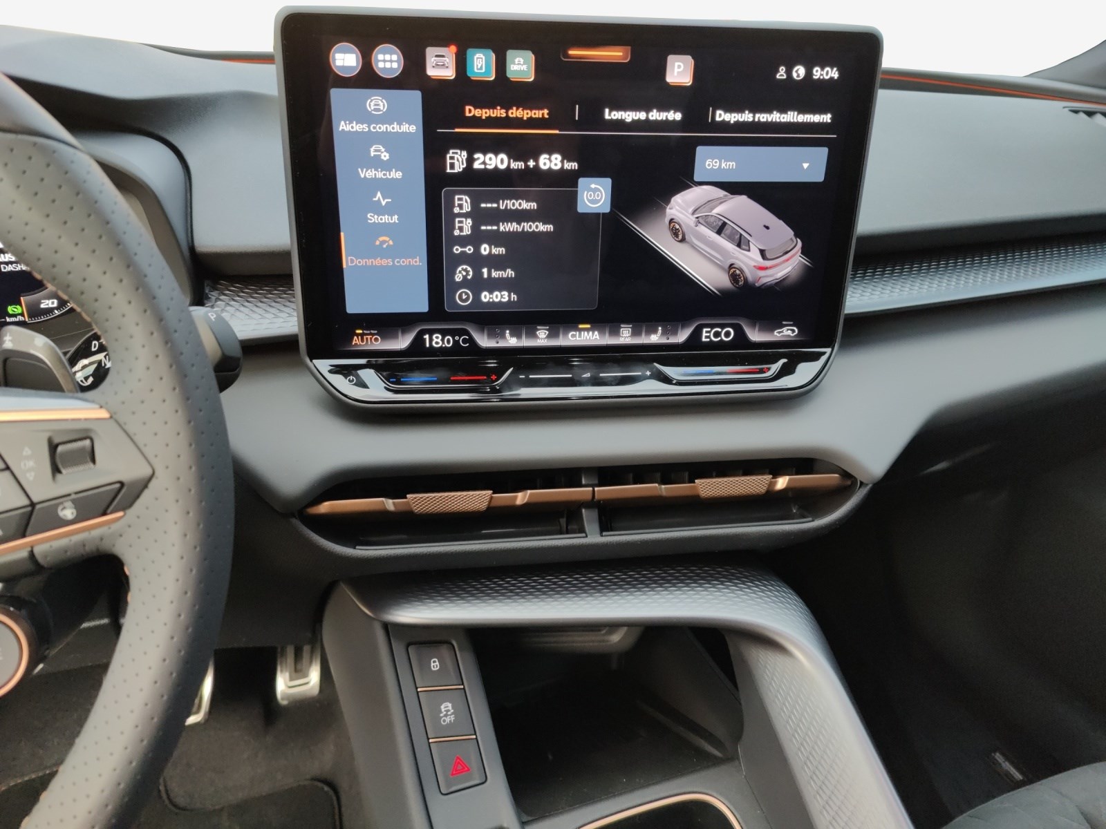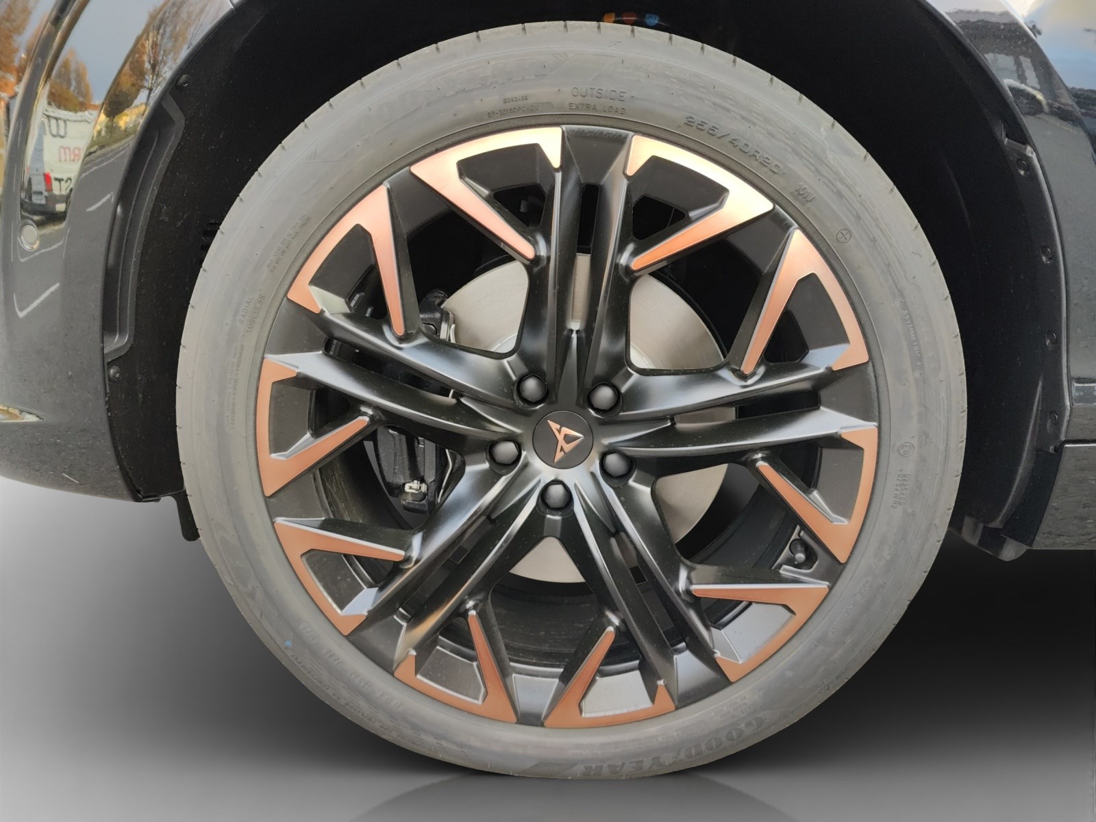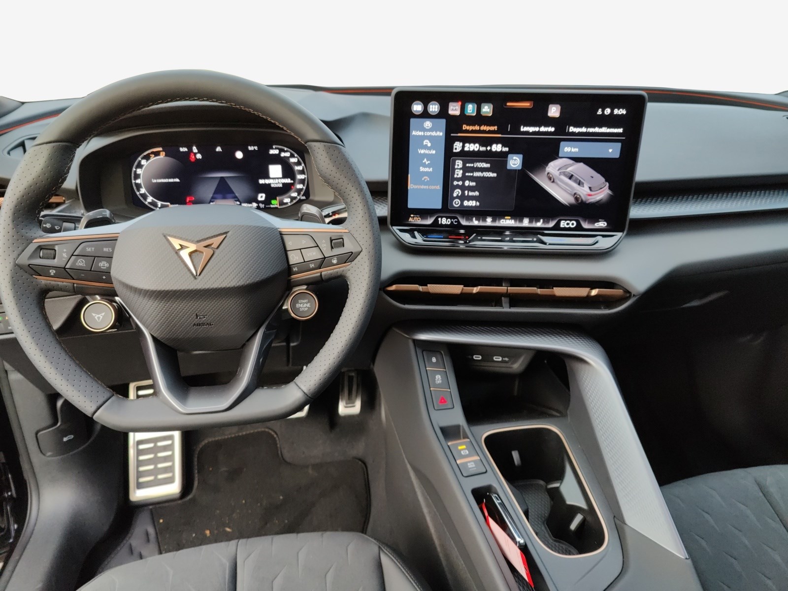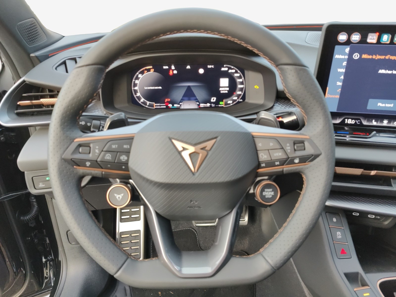 Media: IMMERSIVE by SENNHEISER Mèdias: CUPRA Connect Online Infotainment Peinture: Peinture métallisée Roues: Aluminium 8,5J x 20", "HADRON COPPER" usiné en Sport Black Matt & Copper