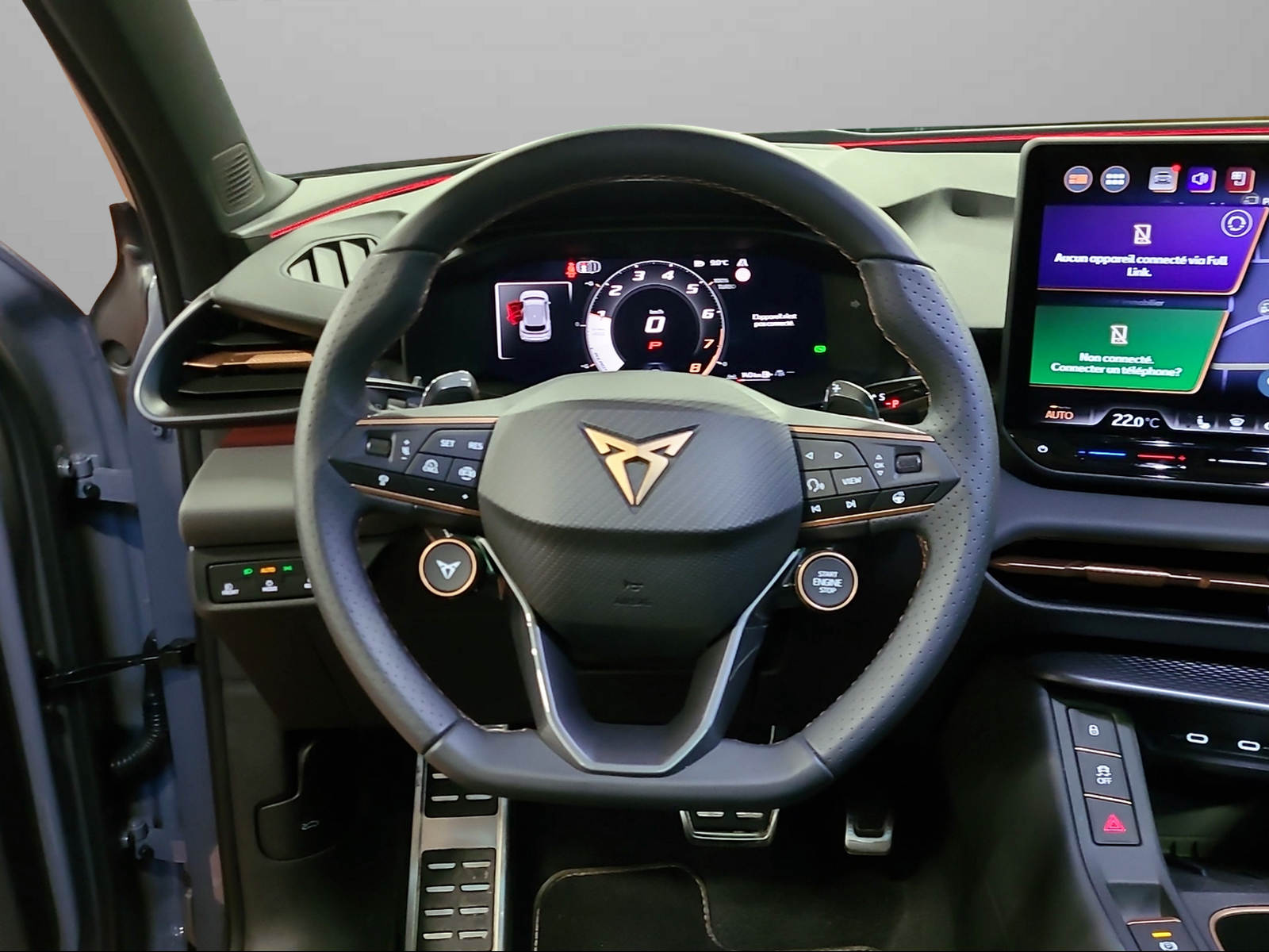 Dispositif d'attelage pour remorque (escamotable) avec assistant de manouvre de remorque Lackierung: Spezial- Lackierungen Media: IMMERSIVE by SENNHEISER Pack: CUPRA Terramar VZ Pack Pack: Pack de plug-in facile Roues: Jantes aluminium 8,5J x 20", "VORTEX" Usinées en Sport Noir Mat & Cuivre Suspension: Étriers de frein AKEBONO Performance avant et arriere