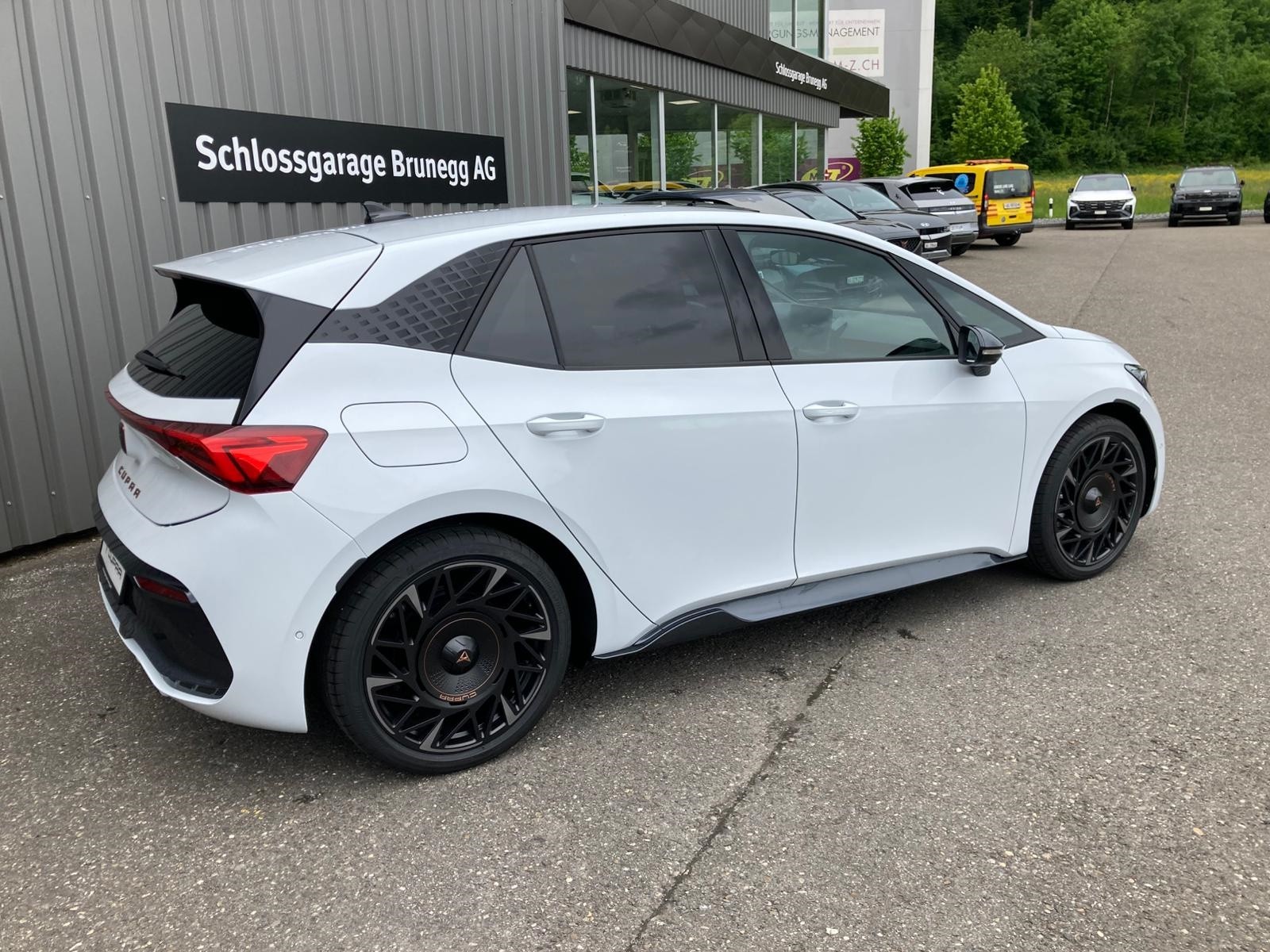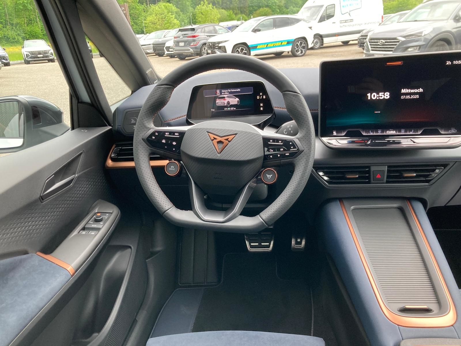5.3" Full Digital Cockpit ABS, EBV elektronische Bremskraft-verteilung Airbag: Airbag Beifahrer deaktivierbar Airbag: Airbag Fahrer und Beifahrer Airbag: Kopfairbags vorne und hinten Airbag: Seitenairbags für Fahrer und Beifahrer Ambiente Innenraumbeleuchtung "Multicolor" mit 6 Farben Assist: Aufmerksamkeits- und Müdigkeitserkennung (ADA) Assist: Ausweichunterstützung / Abbiegeassistent Assist: Einparkhilfe vorne und hinten mit optischer Anzeige Assist: Lane assist (Spurhalteassistent) Assist: Regen-/Lichtsensor Assist: Traction Control (TCS) Assist: Verkehrszeichenerkennung Aussenspiegel elektrisch einstell-, beheiz- und einklappbar mit Beifahrerabsenkfunktion Aussenspiegel in Cosmo Grey, Türgriffe in Wagenfarbe CUPRA Drive Profile mit "driving experience button" Range, Comfort, Performance, CUPRA, Individual Dreipunkt-Automatiksicherheitsgurte auf allen Plätzen Elektrische Fensterheber vorne und hinten mit Komfortschaltung und Einklemmschutz Elektronisches Stabilitäts-Programm Garantie: Cupra 12 Jahre Gewährleistung gegen Karosserie-Durchrostung Garantie: Cupra 3 Jahre Lack-Gewährleistung Garantie: Cupra Garantie Batterie- Gewährleistung 8 Jahre oder 160000 KM auf 70% Batterieleistung. Garantie: Cupra Hersteller-Garantieverlängerung für das 3., 4. und 5. Jahr / max.100000 km Getriebe: 1-Gang Automatik Heckscheiben-Wisch-/Waschanlage mit Intervall Innenspiegel automatisch abblendbar Klima: 2-Zonen Climatronic Klima: Elektrische Luftzusatzheizung Lackierung: Uni-Lackierung Lenkrad: Beheizbares Ledermultifunktionslenkrad Licht: Drittes Bremslicht Licht: Durchgehende Full LED-Heckleuchten Licht: Full LED-Scheinwerfer für Abblend-und Fernlicht und Coming Home Funktion Licht: LED-Nebelscheinwerfer Media: 12,9" Infotainment (MIB3) Media: 2 USB C Anschlüsse hinten und vorne Media: Bluetooth-Freisprecheinrichtung Media: CUPRA Connect Online Infotainment für Navigationssystem Media: CUPRA Connect Safety & Services für Navigationssystem Media: DAB+ (Digital Audio Broadcasting) Pollenfilter (Staubfilter) Räder: Alufelgen 7.5J x 19", "TYPHOON" 31/2 in Glossy Black / Copper Räder: Alufelgen 7.5J x 20", "HURRICANE" 31/3 in Sport Black "e-racer" Räder: Reifendruckkontrollsystem Servolenkung geschwindigkeitsabhängig Sitze: CUPRA Sport Schalensitze in Textil, schwarz "SEAQUAL" Sitze: Fahrersitz höhenverstellbar Sitze: Geteilt abklappbare Rücksitzlehne 1/3 - 2/3 Sitze: Kindersitzbefestigungssystem ISOFIX Sitze: Mittelarmlehne vorne Sonnenblende Fahrer und Beifahrerseite Wegfahrsperre elektronisch Zentralverriegelung "Keyless-Go"