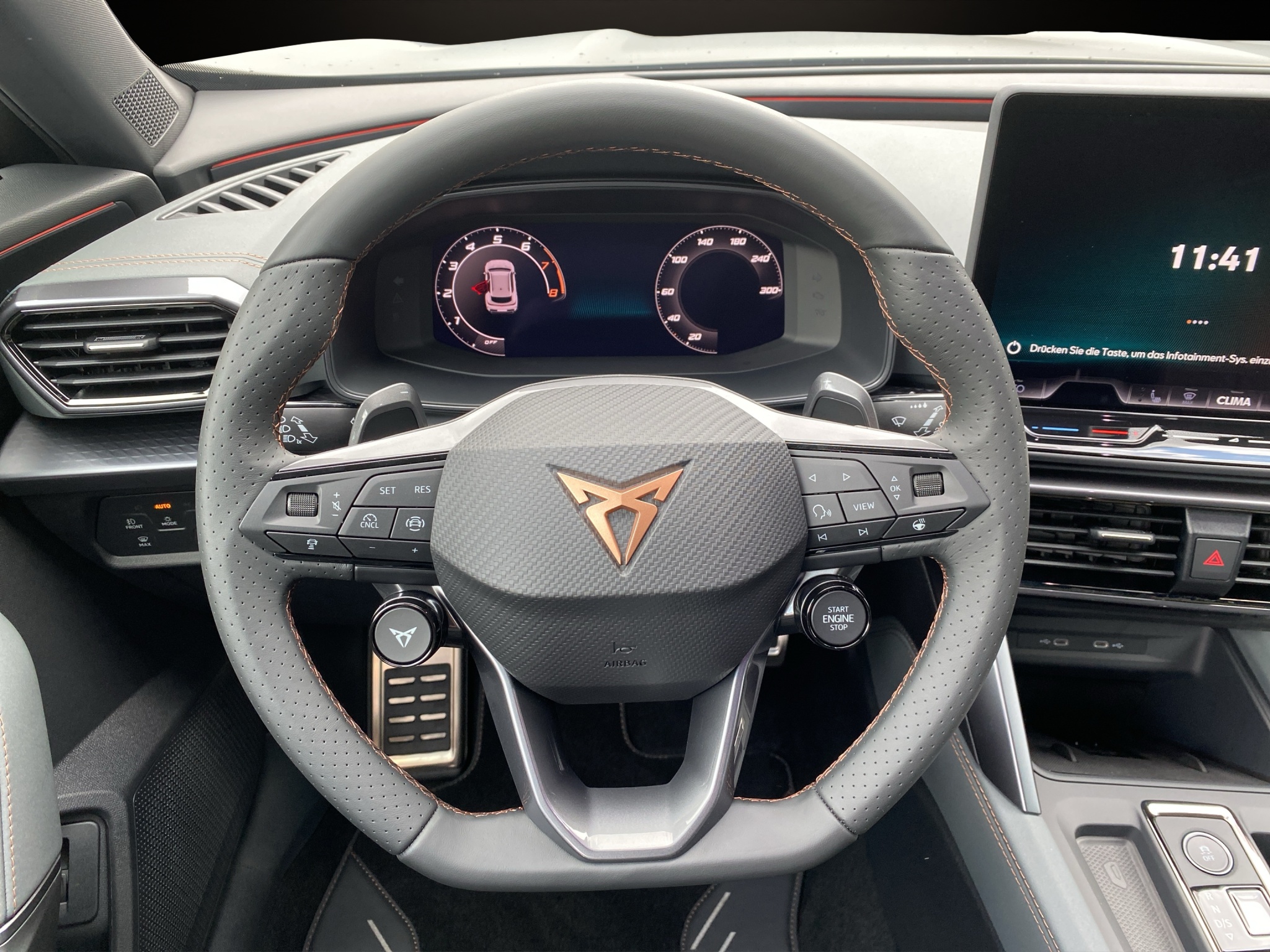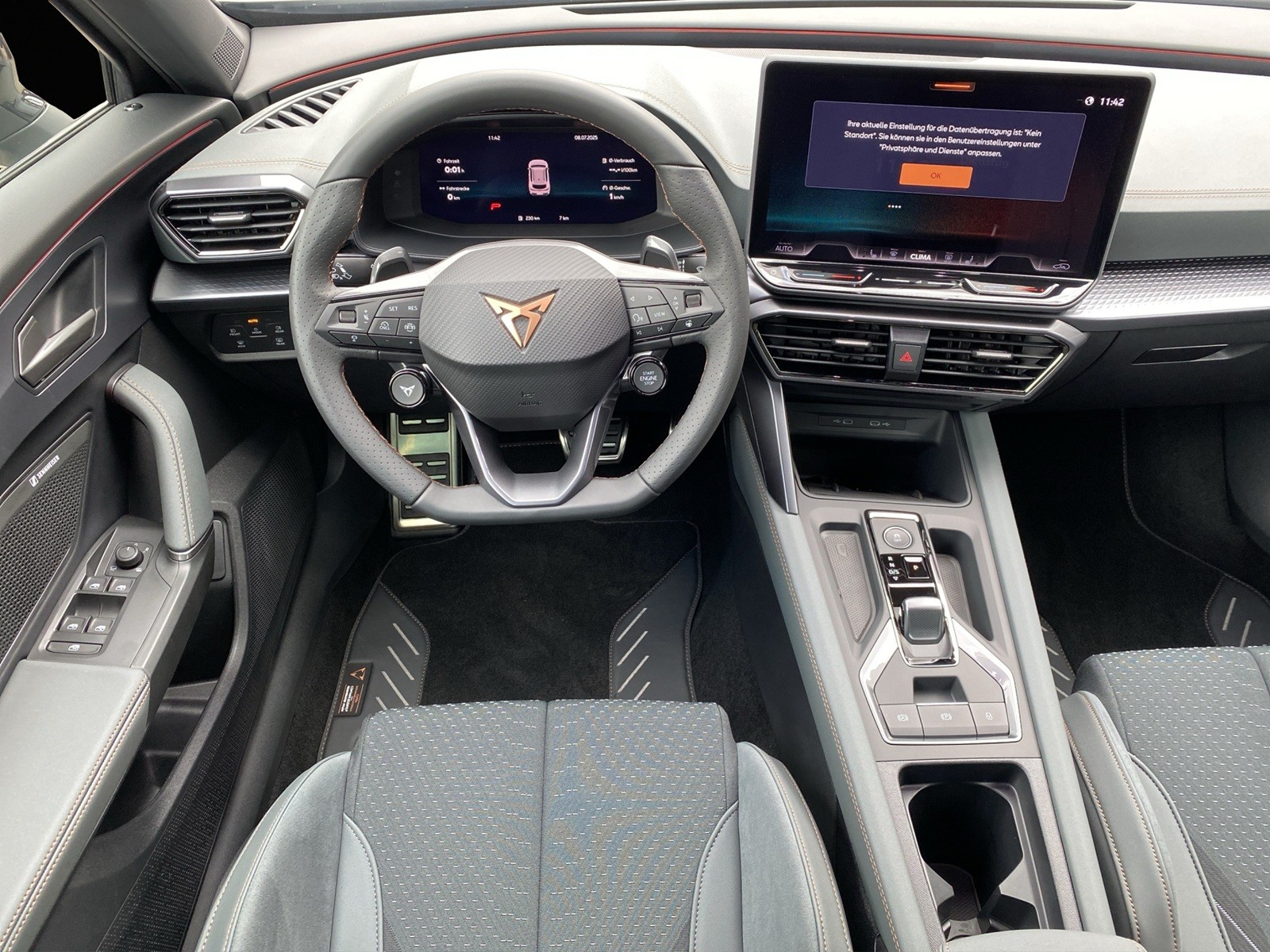 Serienausstattung 3-Punkt-Sicherheitsgurte auf allen Plätzen ABS, EBV elektronische Bremskraft-verteilung Abgedunkelte Scheiben ab B-Säule hinten Airbag: Airbag Beifahrer deaktivierbar Airbag: Airbag Fahrer und Beifahrer Airbag: Kopfairbags vorne und hinten Airbag: Seitenairbags vorne und hinten, vorne mit Knieairbag Assist: Aufmerksamkeits- und Müdigkeitserkennung (ADA) Assist: Ausweichunterstützung / Abbiegeassistent Assist: Automatische Distanzregelung ACC Assist: City Notbremsfunktion Assist: Einparkhilfe vorne und hinten mit Rückfahrkamera Assist: Elektronische Parkbremse mit Auto Hold Funktion Assist: Lane assist (Spurhalteassistent) Assist: Multifunktionskamera Assist: Multikollisionsbremse Assist: Prädiktive Speedlimiter Assist: Regen-/Lichtsensor Assist: Traction Control (TCS) Assist: Traffic sign recognition (Verkehrszeichenerkennung) Assist: Umfeldbeobachtung Front-Assist Aussenspiegel mit Beifahrerspiegelabsenkung Aussenspiegel mit LED-Umfeldbeleuchtung Automatisch abblendender Innenrückspiegel Beleuchtete Sonnenblende links mit abdeckbarem Spiegel und Lasche, rechts mit abdeckbarem Spiegel Dekor: Luftausströmer, Lenkrad- und Mittelkonsolendetails in "Dark Chrome" ESC mit EBA, DSR, XDS und Reifendruckkontrolle Elektrische Fensterheber vorne und hinten mit Komfortschaltung und Einklemmschutz Fahrwerk: Adaptive Fahrwerksregelung DCC Fahrwerk: Performance AKEBONO Bremssättel vorne und hinten Fahrwerk: Progressivlenkung Fussmatten vorne und hinten Garantie: Cupra 12 Jahre Gewährleistung gegen Karosserie-Durchrostung Garantie: Cupra 3 Jahre Lack-Gewährleistung Garantie: Cupra Garantie 2 Jahre ohne Kilometerbegrenzung Garantie: Cupra Hersteller-Garantieverlängerung für das 3., 4. und 5. Jahr / max.100’000 km Heckscheiben-Wisch-/Waschanlage mit Intervall Kindersitzverankerung ISOFIX (äussere Plätze hinten) Klima: 3-Zonen Climatronic mit Fondraumbedienung Lackierung: Uni-Lackierung Lenkrad: Supersportlenkrad mit Start-/ Drive Profile-Knopfsystem und Schaltwippen, beheizbar Licht: Coming-home-Funktion Licht: Drittes Bremslicht Licht: Durchgehende Full LED-Heckleuchten Licht: Fernlicht-Assistent Licht: LED Heckleuchten mit beleuchtetem 3D CUPRA Logo Licht: LED-Heckleuchten mit dynamischem Blinklicht Licht: LED-Nebelscheinwerfer mit Cornering-Funktion Licht: Leuchtweitenregulierung dynamisch Licht: Nebelschlussleuchte Media: 12,9" Infotainment (MIB3) Media: 2 USB C Anschlüsse hinten und vorne Media: CUPRA Connect Online Infotainment Media: CUPRA Connect Remote & Access Media: CUPRA Connect Safety & Services Media: CUPRA Connectivity Box Media: CUPRA Navigationssystem 12.9" Infotainment Media: DAB+ (Digital Audio Broadcasting) Media: IMMERSIVE by SENNHEISER Media: Mobiltelefon Freisprechanlage Bluetooth Pyrotechnische Gurtstraffer und Gurtkraftbegrenzer Räder: Alufelgen 8J x 19", "SANDSTORM COPPER" Machined in Copper Räder: Reifendruckkontrollsystem Räder: Reifenreparatur-Set (Tire Fit) Servolenkung mit geschwindigkeitsabhängiger Lenkkraftunterstützung Sitze: 3 verstellbare Kopfstützen hinten Sitze: CUPRA CUPBucket Sportschalensitze in Textil "Enceladus Grey" Sitze: Elektrische Sitzverstellung mit Memory-Funktion für Fahrer- und Beifahrerseite Sitze: Geteilt abklappbare Rücksitzlehne 1/3 - 2/3 Sitze: Kopfstützen vorne (integrierte) Sitze: Lendenwirbelstütze Fahrer- und Beifahrerseite elektrisch einstellbar Sitze: Mittelarmlehne hinten Sitze: Mittelarmlehne vorne Sitze: Sitzheizung für Vordersitze, getrennt regelbar Sitze: Vordersitze höhenverstellbar mit Lendenwirbelstütze Stopp - Start- und Rekuperationssystem Wegfahrsperre elektronisch Zentralverriegelung "Keyless-Go" Zentralverriegelung mit Funkfernbedienung, 2 Funkschlüssel
