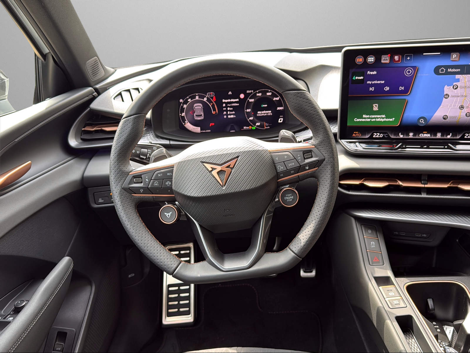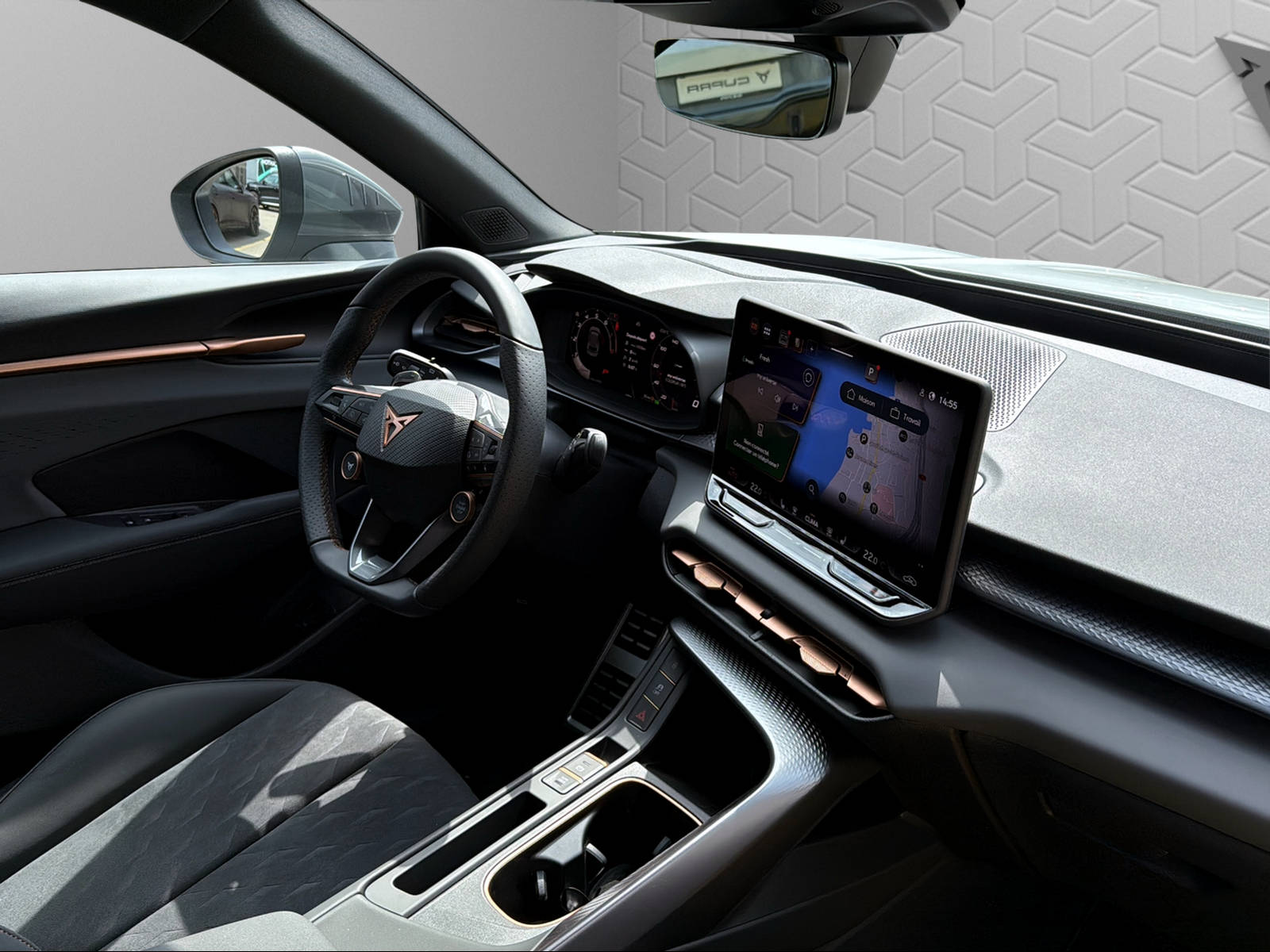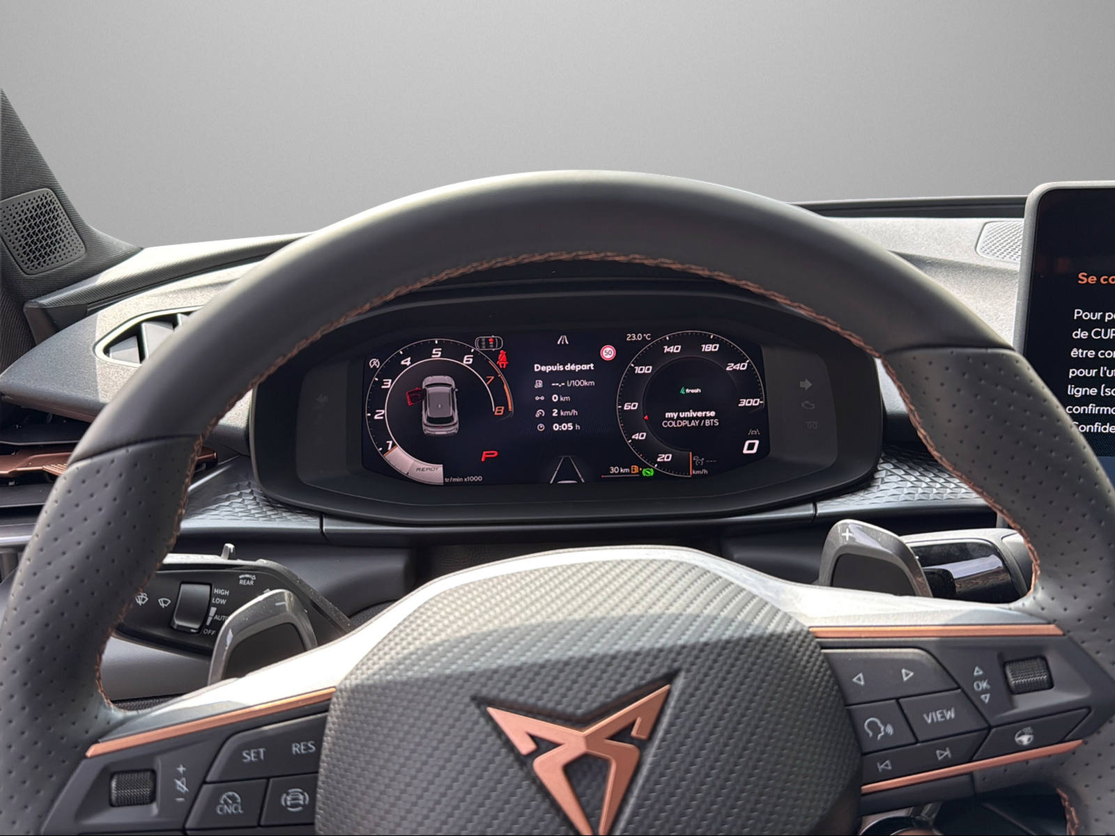 3-Punkt-Sicherheitsgurte auf allen Plätzen ABS, EBV elektronische Bremskraft-verteilung Abgedunkelte Scheiben ab B-Säule hinten Airbag: Airbag Beifahrer deaktivierbar Airbag: Airbag Fahrer und Beifahrer Airbag: Kopfairbags vorne und hinten Airbag: Seitenairbags für Fahrer und Beifahrer Alarme avec surveillance intérieure Ambiente Innenraumbeleuchtung mit beleuchteten Türpanelen Assist: Aufmerksamkeits- und Müdigkeitserkennung (ADA) Assist: Ausweichunterstützung / Abbiegeassistent Assist: Automatische Distanzregelung ACC Assist: City Notbremsfunktion Assist: Einparkhilfe vorne und hinten mit Rückfahrkamera Assist: Elektronische Parkbremse mit Auto Hold Funktion Assist: Lane assist (Spurhalteassistent) Assist: Multifunktionskamera Assist: Multikollisionsbremse Assist: Prädiktive Speedlimiter Assist: Traffic sign recognition (Verkehrszeichenerkennung) Assist: Umfeldüberwachungssystem "Front-Assist" Aussenspiegel elektrisch einstell-, beheiz- und einklappbar Aussenspiegel mit LED-Umfeldbeleuchtung Beleuchtete Sonnenblende links mit abdeckbarem Spiegel und Lasche, rechts mit abdeckbarem Spiegel Capteur de pluie et lumière ESC mit EBA, DSR, XDS und Reifendruckkontrolle Einstiegsleisten beleuchtet Elektrische Fensterheber vorne und hinten mit Komfortschaltung und Einklemmschutz Fahrwerk: CUPRA Sportfahrwerk Fahrwerk: Progressivlenkung Garantie: CUPRA Prolongation de garantie constructeur pour les 3ème, 4ème et 5ème années / Garantie: Cupra 12 ans de garantie contre perforation de la carrosserie Garantie: Cupra 2 ans de garantie, kilométrage illimité Garantie: Cupra 3 ans de garantie pour la peinture Garantie: Garantie Cupra 2 ans Heckklappe elektrisch öffnend und schliessend "Virtual Pedal" Heckscheiben-Wisch-/Waschanlage mit Intervall Klima: 3-Zonen Climatronic mit Fondraumbedienung Lackierung: Uni-Lackierung Lenkrad: Leder Multifunktionslenkrad mit Schaltwippen, beheizbar Licht: Drittes Bremslicht Licht: Durchgehende Full LED-Heckleuchten Licht: LED Heckleuchten mit beleuchtetem 3D CUPRA Logo Licht: LED-Heckleuchten mit dynamischem Blinklicht Licht: LED-Nebelscheinwerfer mit Cornering-Funktion Licht: LED-Scheinwerfer für Abblend- und Fernlicht Licht: Leuchtweitenregulierung dynamisch Licht: Nebelschlussleuchte Media: 12,9" Infotainment (MIB3) Media: 2 USB C Anschlüsse hinten und vorne Media: CUPRA Connect Online Infotainment Media: DAB+ (Digital Audio Broadcasting) Media: Mobiltelefon Freisprechanlage Bluetooth Mittelarmlehne vorne und hinten Mèdias: CUPRA Connect Remote & Access / CUPRA Connect Safety & Services Mèdias: CUPRA Connectivity Box Pyrotechnische Gurtstraffer und Gurtkraftbegrenzer Roues: Aluminium 8,5J x 19", "COSMIC" usiné en Sport Black Matt & Silver Räder: Performance Reifen Räder: Reifendruckkontrollsystem Rétroviseur intérieur anti-éblouissement Schlüsselloses Schliess- und Startsystem (KESSY Advance) Servolenkung mit geschwindigkeitsabhängiger Lenkkraftunterstützung Sitze: 3 verstellbare Kopfstützen hinten Sitze: CUPRA Sport Schalensitze in Textil, "DEEP OCEAN" "SEAQUAL" Sitze: Geteilt abklappbare Rücksitzlehne 1/3 - 2/3 Sitze: Geteilt abklappbare Rücksitzlehne mit Mittelarmlehne Sitze: Kindersitzverankerung ISOFIX hinten Sitze: Vordersitze höhenverstellbar mit Lendenwirbelstütze Stopp - Start- und Rekuperationssystem Suspension: Régulation adaptive du châssis DCC pro Tapis de sol avant et arrière Wegfahrsperre elektronisch Zentralverriegelung mit Funkfernbedienung, 2 Funkschlüssel Éclairage d'ambiance LED Smart Wraparound, avec affichage des fonctions