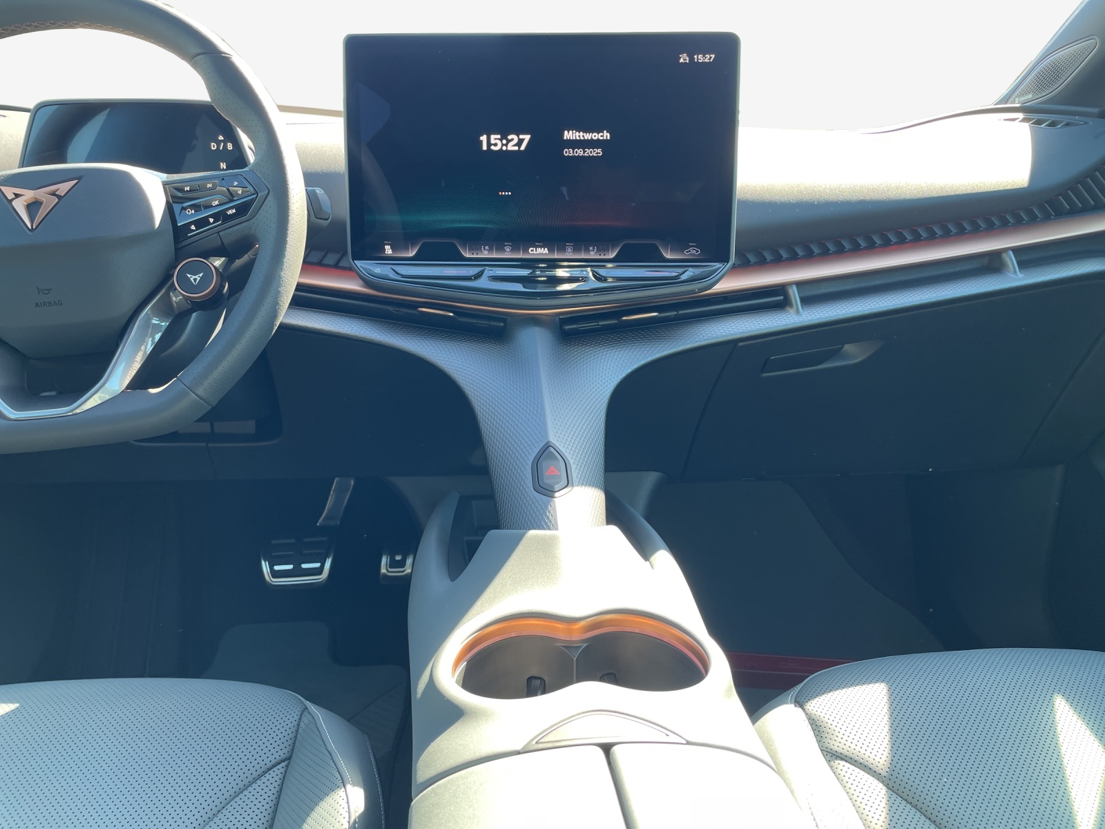 5.3" Full Digital Cockpit Abgedunkelte Scheiben ab B-Säule hinten Airbag: Airbag Beifahrer deaktivierbar Airbag: Airbag Fahrer und Beifahrer Airbag: Seitenairbags für Fahrer und Beifahrer Alarmanlage mit Innenraumüberwachung Assist: Aufmerksamkeits- und Müdigkeitserkennung (ADA) Assist: Ausweichunterstützung / Abbiegeassistent Assist: Exit Assist (Ausparkassistent) Assist: Exit Warning (Ausstiegswarner) Assist: Intelligenter Geschwindigkeitsassistent Assist: Parklenkassistent RPA (Remote Park Assist) Assist: PreCrash Sicherheitssystem Assist: Prädiktive automatische Distanzregelung ACC Assist: Regen-/Lichtsensor Assist: Side Assist (Spurwechselassistent) Assist: Top View Camera (Rundumblick) Assist: Traction Control (TCS) Assist: Traffic sign recognition (Verkehrszeichenerkennung) Assist: eCall Notruffunktion Augmented Reality Head-up-Display Aussenspiegel elektrisch einstell-, beheiz- und einklappbar mit Beifahrerabsenkfunktion- Automatisch abblendender Innenrückspiegel Dreipunkt-Automatiksicherheitsgurte auf allen Plätzen Einstiegsleisten beleuchtet Elektrische Fensterheber vorne und hinten mit Komfortschaltung und Einklemmschutz Elektronisches Stabilitäts-Programm (ESP) Fahrwerk: Adaptive Fahrwerksregelung DCC Garantie: Cupra 12 Jahre Gewährleistung gegen Karosserie-Durchrostung Garantie: Cupra 3 Jahre Lack-Gewährleistung Garantie: Cupra Garantie 2 Jahre ohne Kilometerbegrenzung Getriebe: 1-Gang Automatik Heckklappe elektrisch öffnend und schliessend "Virtual Pedal" Klima: 3-Zonen Climatronic mit Fondraumbedienung LED Ambientebeleuchtung "IMMERSIVE" Lackierung: Uni-Lackierung Lenkrad: Supersportlenkrad mit Drive Profile-Knopfsystem,beheizbar Licht: Drittes Bremslicht Licht: LED Heckleuchten mit beleuchtetem 3D CUPRA Logo Licht: Matrix LED Fernlicht Licht: Matrix LED Scheinwerfer Licht: Nebelschlussleuchte Media: 15" Infotainment (MIB3) Media: 2 USB C Anschlüsse hinten und vorne Media: Bluetooth-Freisprecheinrichtung Media: CUPRA Connect Online Infotainment Media: CUPRA Connect Remote & Access Media: CUPRA Connect Safety & Services Media: CUPRA Navigationssystem Media: DAB+ (Digital Audio Broadcasting) Media: SENNHEISER Sound System mit 12 High-End-Lautsprecher inkl. 300 Watt Subwoofer Media: Wireless Charger zur induktiven Smartphone Ladung Räder: Alufelgen 9J x 21", "Etna" Machined Sport in Black/Copper Räder: Reifendruckkontrollsystem Schlüsselloses Schliess- und Startsystem (KESSY Advance) Servolenkung geschwindigkeitsabhängig Sitze: CUPRA CUPBucket Sportschalensitze in Leder "Enceladus Grey" Sitze: Elektrische Sitzverstellung mit Memory-Funktion für Fahrer- und Beifahrerseite Sitze: Geteilt abklappbare Rücksitzlehne mit Mittelarmlehne und Durchlademöglichkeit Sitze: Kindersitzbefestigungssystem ISOFIX Sitze: Kopfstützen hinten höhenverstellbar Sitze: Kopfstützen vorne (integrierte) Sitze: Lendenwirbelstütze Fahrer- und Beifahrerseite elektrisch einstellbar Sitze: Sitzbelüftung für Vordersitze Sitze: Sitzheizung für Vorder- und Rücksitze, getrennt regelbar Sitze: Vordersitze höhenverstellbar Vorbereitung für Anhängevorrichtung Wegfahrsperre elektronisch Zentralverriegelung mit Fernbedienung