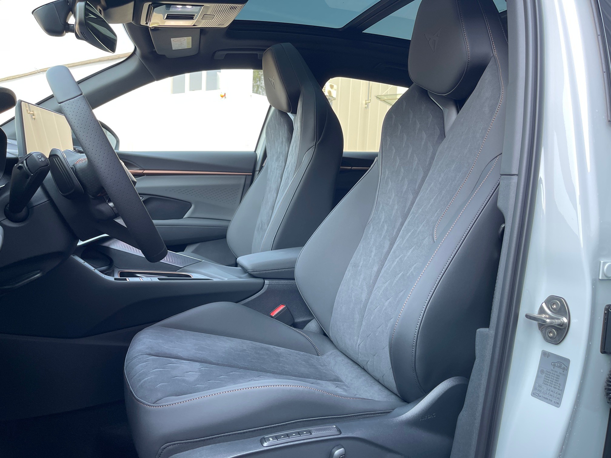 3-Punkt-Sicherheitsgurte auf allen Plätzen ABS, EBV elektronische Bremskraft-verteilung Abgedunkelte Scheiben ab B-Säule hinten Airbag: Airbag Beifahrer deaktivierbar Airbag: Airbag Fahrer und Beifahrer Airbag: Kopfairbags vorne und hinten Airbag: Seitenairbags für Fahrer und Beifahrer Alarmanlage mit Innenraumüberwachung Assist: Aufmerksamkeits- und Müdigkeitserkennung (ADA) Assist: Ausweichunterstützung / Abbiegeassistent Assist: Automatische Distanzregelung ACC Assist: City Notbremsfunktion Assist: Einparkhilfe vorne und hinten mit Rückfahrkamera Assist: Elektronische Parkbremse mit Auto Hold Funktion Assist: Lane assist (Spurhalteassistent) Assist: Multifunktionskamera Assist: Multikollisionsbremse Assist: Prädiktive Speedlimiter Assist: Traffic sign recognition (Verkehrszeichenerkennung) Assist: Umfeldüberwachungssystem "Front-Assist" Aussenspiegel elektrisch einstell-, beheiz- und einklappbar Aussenspiegel mit LED-Umfeldbeleuchtung Beleuchtete Sonnenblende links mit abdeckbarem Spiegel und Lasche, rechts mit abdeckbarem Spiegel ESC mit EBA, DSR, XDS und Reifendruckkontrolle Einstiegsleisten beleuchtet Elektrische Fensterheber vorne und hinten mit Komfortschaltung und Einklemmschutz Fahrwerk: Adaptive Fahrwerksregelung DCC Fahrwerk: CUPRA Sportfahrwerk Fahrwerk: Progressivlenkung Full Digital Cockpit 10.25" Fussmatten vorne und hinten Garantie: Cupra 12 Jahre Gewährleistung gegen Karosserie-Durchrostung Garantie: Cupra 3 Jahre Lack-Gewährleistung Garantie: Cupra Hersteller-Garantieverlängerung für das 3., 4. und 5. Jahr / max.100000 km Heckklappe elektrisch öffnend und schliessend "Virtual Pedal" Heckscheiben-Wisch-/Waschanlage mit Intervall Innenspiegel automatisch abblendbar Klima: 3-Zonen Climatronic mit Fondraumbedienung LED-Ambientebeleuchtung Smart Wraparound, inkl. Funktionsanzeige Lackierung: Uni-Lackierung Lenkrad: Leder Multifunktionslenkrad mit Schaltwippen, beheizbar Licht: Drittes Bremslicht Licht: Durchgehende Full LED-Heckleuchten Licht: LED Heckleuchten mit beleuchtetem 3D CUPRA Logo Licht: LED-Heckleuchten mit dynamischem Blinklicht Licht: LED-Nebelscheinwerfer mit Cornering-Funktion Licht: LED-Scheinwerfer für Abblend- und Fernlicht Licht: Leuchtweitenregulierung dynamisch Licht: Nebelschlussleuchte Media: 12,9" Infotainment (MIB3) Media: 2 USB C Anschlüsse hinten und vorne Media: CUPRA Connect Remote & Access / CUPRA Connect Safety & Services Media: CUPRA Connectivity Box Media: DAB+ (Digital Audio Broadcasting) Media: Mobiltelefon Freisprechanlage Bluetooth Mittelarmlehne vorne und hinten Pyrotechnische Gurtstraffer und Gurtkraftbegrenzer Räder: Alufelgen 8.5J x 19", "COSMIC" Machined in Sport Black Matt & Silver Räder: Performance Reifen Räder: Reifendruckkontrollsystem Schlüsselloses Schliess- und Startsystem (KESSY Advance) Servolenkung mit geschwindigkeitsabhängiger Lenkkraftunterstützung Sitze: 3 verstellbare Kopfstützen hinten Sitze: CUPRA Sport Schalensitze in Textil, "DEEP OCEAN" "SEAQUAL" Sitze: Geteilt abklappbare Rücksitzlehne 1/3 - 2/3 Sitze: Geteilt abklappbare Rücksitzlehne mit Mittelarmlehne Sitze: Kindersitzverankerung ISOFIX hinten Sitze: Vordersitze höhenverstellbar mit Lendenwirbelstütze Stopp - Start- und Rekuperationssystem Wegfahrsperre elektronisch Zentralverriegelung mit Funkfernbedienung, 2 Funkschlüssel