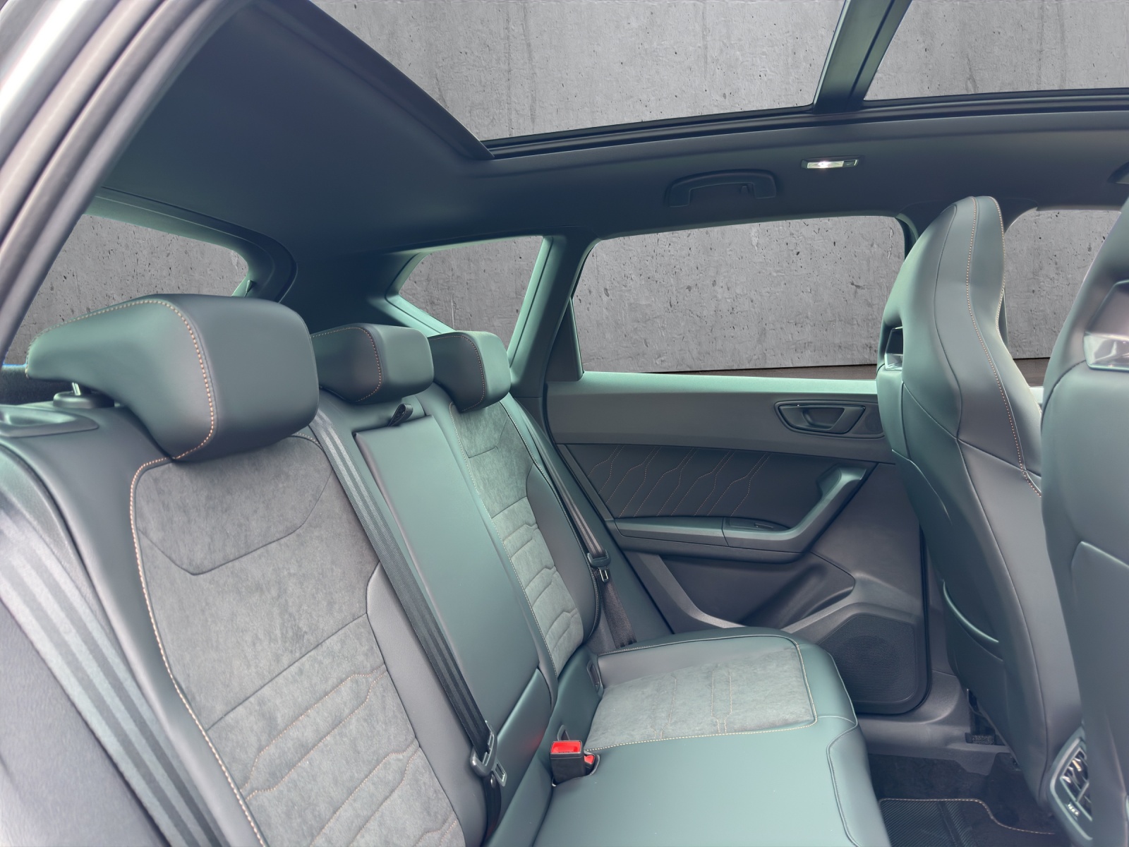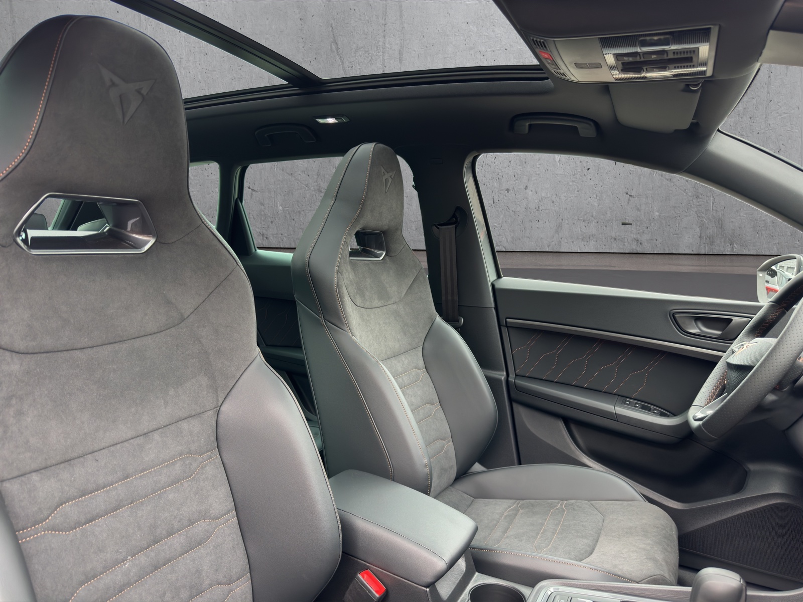 Serienausstattung ABS, EBV elektronische Bremskraft-verteilung Abgedunkelte Scheiben ab B-Säule hinten Airbag: Airbag Beifahrer deaktivierbar Airbag: Airbag Fahrer und Beifahrer Airbag: Knieairbag auf der Fahrerseite Airbag: Kopfairbags vorne und hinten Airbag: Seitenairbags für Fahrer und Beifahrer Assist: Aufmerksamkeits- und Müdigkeitserkennung (ADA) Assist: Einparkhilfe vorne und hinten mit optischer Anzeige Assist: Elektronische Parkbremse mit Auto Hold Funktion Assist: Lane assist (Spurhalteassistent) Assist: Multifunktionskamera Assist: Multikollisionsbremse Assist: Parklenkassistent Assist: Regen-/Lichtsensor Assist: Top View Camera (Rundumblick) Aussenspiegel elektrisch einstell-, beheiz- und einklappbar Aussenspiegel mit Beifahrerspiegelabsenkung Aussenspiegel mit LED-Umfeldbeleuchtung Aussenspiegel und Türgriffe in Wagenfarbe Automatisch abblendender Innenrückspiegel Beleuchtete Sonnenblende links mit abdeckbarem Spiegel und Lasche, rechts mit abdeckbarem Spiegel CUPRA Drive Profile mit "driving experience button" Comfort, Sport, CUPRA, Individual, Snow, Offroad Dekor: Dekorblenden in Grau glänzend Dekor: Türverkleidung mit Ambient light Dreipunkt-Automatiksicherheitsgurte auf allen Plätzen ESC mit EBA, DSR, XDS und Reifendruckkontrolle Einstiegsleisten in Aluminium Elektrische Fensterheber vorne und hinten mit Komfortschaltung und Einklemmschutz Fahrwerk: Adaptive Fahrwerksregelung DCC Fahrwerk: Progressivlenkung Fussmatten vorne und hinten Garantie: Cupra 12 Jahre Gewährleistung gegen Karosserie-Durchrostung Garantie: Cupra 3 Jahre Lack-Gewährleistung Garantie: Cupra Hersteller-Garantieverlängerung für das 3., 4. und 5. Jahr / max.100’000 km Heckscheiben-Wisch-/Waschanlage mit Intervall Klima: 2-Zonen Climatronic Lackierung: Uni-Lackierung Lenkrad: Beheizbares Ledermultifunktionslenkrad mit Schaltwippen Licht: Coming-home-Funktion Licht: Drittes Bremslicht Licht: LED-Heckleuchten mit dynamischem Blinklicht Licht: LED-Nebelscheinwerfer mit Cornering-Funktion Licht: LED-Scheinwerfer für Abblend- und Fernlicht Licht: Leuchtweitenregulierung dynamisch Licht: Nebelschlussleuchte Media: 2 USB C Anschlüsse hinten und vorne Media: 9.2" 3D Infotainment (MIB3) Media: CUPRA Connect Online Infotainment für Navigationssystem Media: CUPRA Connect Remote & Access für Navigationssystem Media: CUPRA Connect Safety & Services für Navigationssystem Media: CUPRA Connectivity Box Media: CUPRA FullLink für Navigationssystem Media: CUPRA Navigationssystem Media: DAB+ (Digital Audio Broadcasting) Media: Kartenmaterial ''Europa'' Media: Mobiltelefon Freisprechanlage Bluetooth Paket: Fahrerassistenzpaket M für Navigationssystem Pyrotechnische Gurtstraffer und Gurtkraftbegrenzer Radlaufblenden in Wagenfarbe Räder: Alufelgen 8J x 19", "EXCLUSIVE"in Sport Black Matt Räder: Reifenreparatur-Set (Tire Fit) Schlüsselloses Schliess- und Startsystem (KESSY) Servolenkung mit geschwindigkeitsabhängiger Lenkkraftunterstützung Sitze: 2 verstellbare Kopfstützen vorne und 3 hinten Sitze: CUPRA Sportschalensitze in Dinamica "Black" Sitze: Easy Backseat Release (Rücksitzentriegelung im Kofferraum) Sitze: Geteilt abklappbare Rücksitzlehne 1/3 - 2/3 Sitze: Kindersitzverankerung ISOFIX hinten Sitze: Mittelarmlehne hinten Sitze: Mittelarmlehne vorne Sitze: Vordersitze höhenverstellbar mit Lendenwirbelstütze Sportabgasanlage mit 4-fach Endrohr Stopp - Start- und Rekuperationssystem Wegfahrsperre elektronisch Zentralverriegelung mit Funkfernbedienung, 2 Funkschlüssel