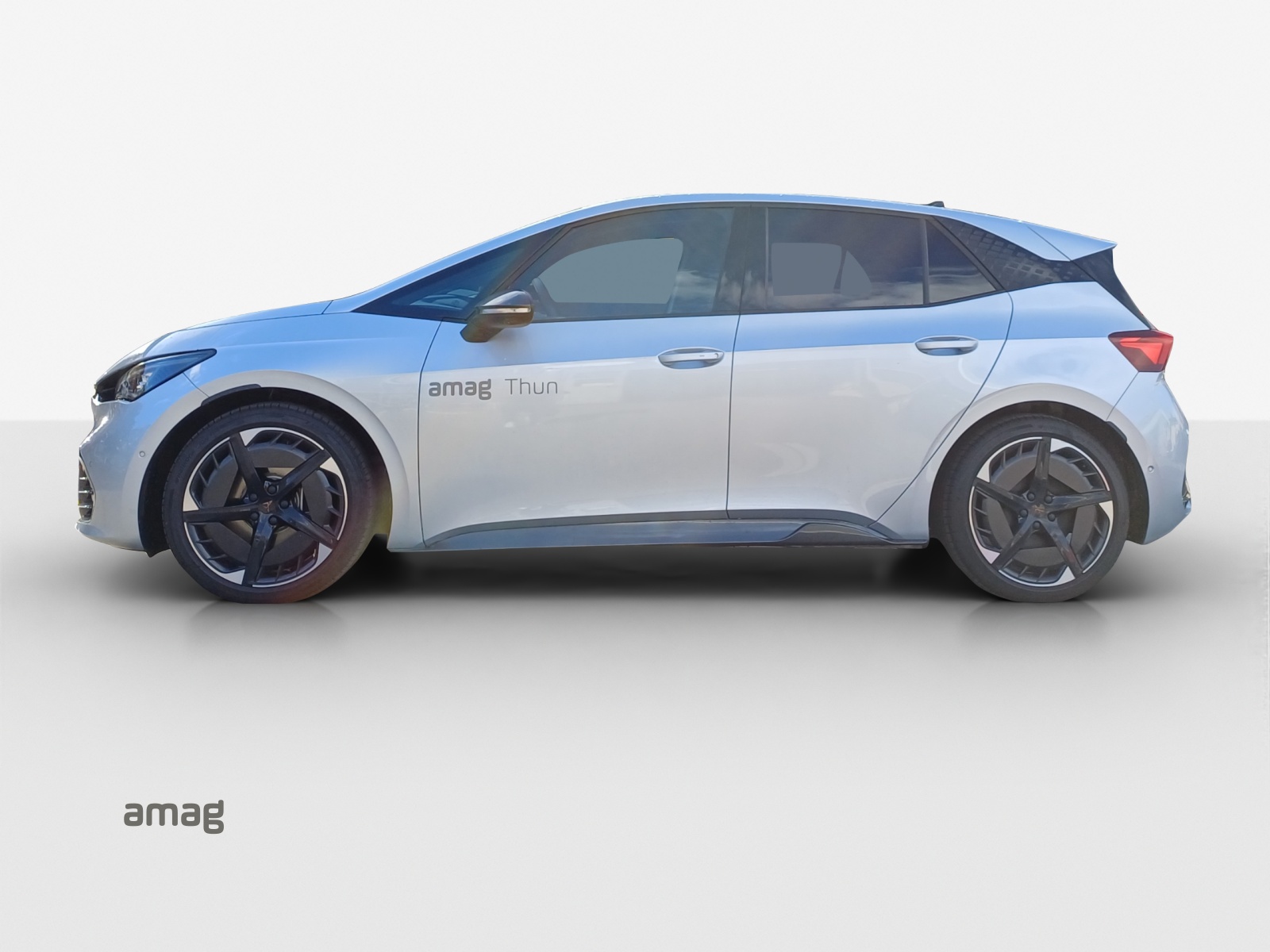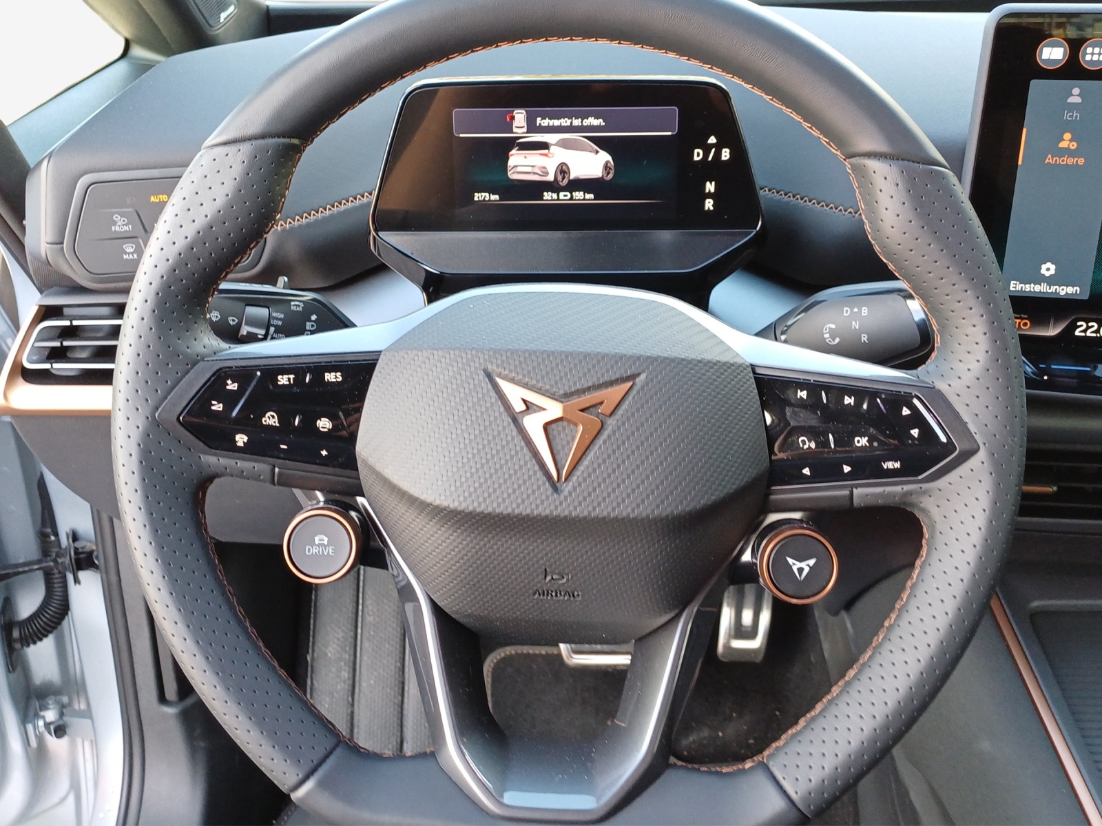 Serienausstattung 5.3" Full Digital Cockpit ABS, EBV elektronische Bremskraft-verteilung Airbag: Airbag Beifahrer deaktivierbar Airbag: Airbag Fahrer und Beifahrer Airbag: Kopfairbags vorne und hinten Airbag: Seitenairbags für Fahrer und Beifahrer Ambiente Innenraumbeleuchtung "Multicolor" mit 6 Farben Assist: Aufmerksamkeits- und Müdigkeitserkennung (ADA) Assist: Ausweichunterstützung / Abbiegeassistent Assist: Einparkhilfe vorne und hinten mit optischer Anzeige Assist: Lane assist (Spurhalteassistent) Assist: Regen-/Lichtsensor Assist: Traction Control (TCS) Assist: Verkehrszeichenerkennung Aussenspiegel elektrisch einstell-, beheiz- und einklappbar mit Beifahrerabsenkfunktion Aussenspiegel in Cosmo Grey, Türgriffe in Wagenfarbe CUPRA Drive Profile mit "driving experience button" Range, Comfort, Performance, CUPRA, Individual Dreipunkt-Automatiksicherheitsgurte auf allen Plätzen Elektrische Fensterheber vorne und hinten mit Komfortschaltung und Einklemmschutz Elektronisches Stabilitäts-Programm Garantie: Cupra 12 Jahre Gewährleistung gegen Karosserie-Durchrostung Garantie: Cupra 3 Jahre Lack-Gewährleistung Garantie: Cupra Garantie Batterie- Gewährleistung 8 Jahre oder 160000 KM auf 70% Batterieleistung. Garantie: Cupra Hersteller-Garantieverlängerung für das 3., 4. und 5. Jahr / max.100000 km Getriebe: 1-Gang Automatik Heckscheiben-Wisch-/Waschanlage mit Intervall Innenspiegel automatisch abblendbar Klima: 2-Zonen Climatronic Klima: Elektrische Luftzusatzheizung Lackierung: Uni-Lackierung Lenkrad: Beheizbares Ledermultifunktionslenkrad Licht: Drittes Bremslicht Licht: Durchgehende Full LED-Heckleuchten Licht: Full LED-Scheinwerfer für Abblend-und Fernlicht und Coming Home Funktion Licht: LED-Nebelscheinwerfer Media: 12,9" Infotainment (MIB3) Media: 2 USB C Anschlüsse hinten und vorne Media: Bluetooth-Freisprecheinrichtung Media: CUPRA Connect Online Infotainment für Navigationssystem Media: CUPRA Connect Safety & Services für Navigationssystem Media: DAB+ (Digital Audio Broadcasting) Pollenfilter (Staubfilter) Räder: Alufelgen 7.5J x 19", "TYPHOON" 31/2 in Glossy Black / Copper Räder: Alufelgen 7.5J x 20", "HURRICANE" 31/3 in Sport Black "e-racer" Räder: Reifendruckkontrollsystem Servolenkung geschwindigkeitsabhängig Sitze: CUPRA Sport Schalensitze in Textil, schwarz "SEAQUAL" Sitze: Fahrersitz höhenverstellbar Sitze: Geteilt abklappbare Rücksitzlehne 1/3 - 2/3 Sitze: Kindersitzbefestigungssystem ISOFIX Sitze: Mittelarmlehne vorne Sonnenblende Fahrer und Beifahrerseite Wegfahrsperre elektronisch Zentralverriegelung "Keyless-Go"