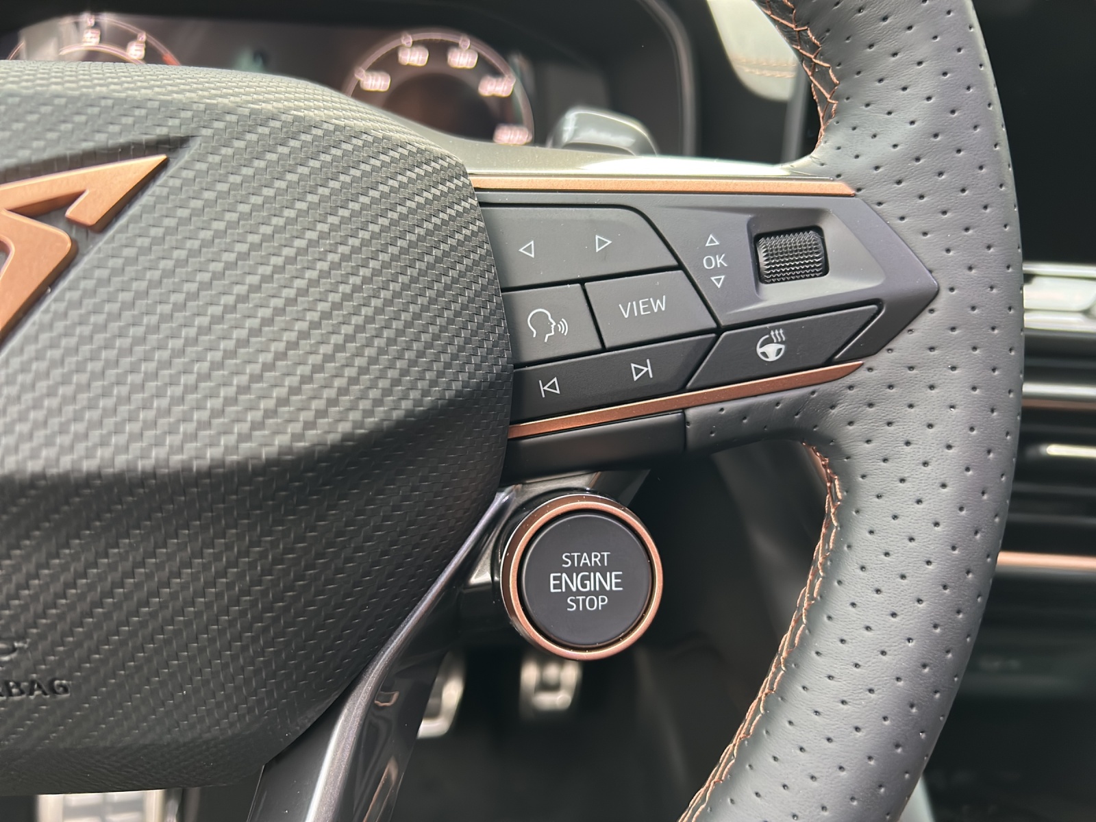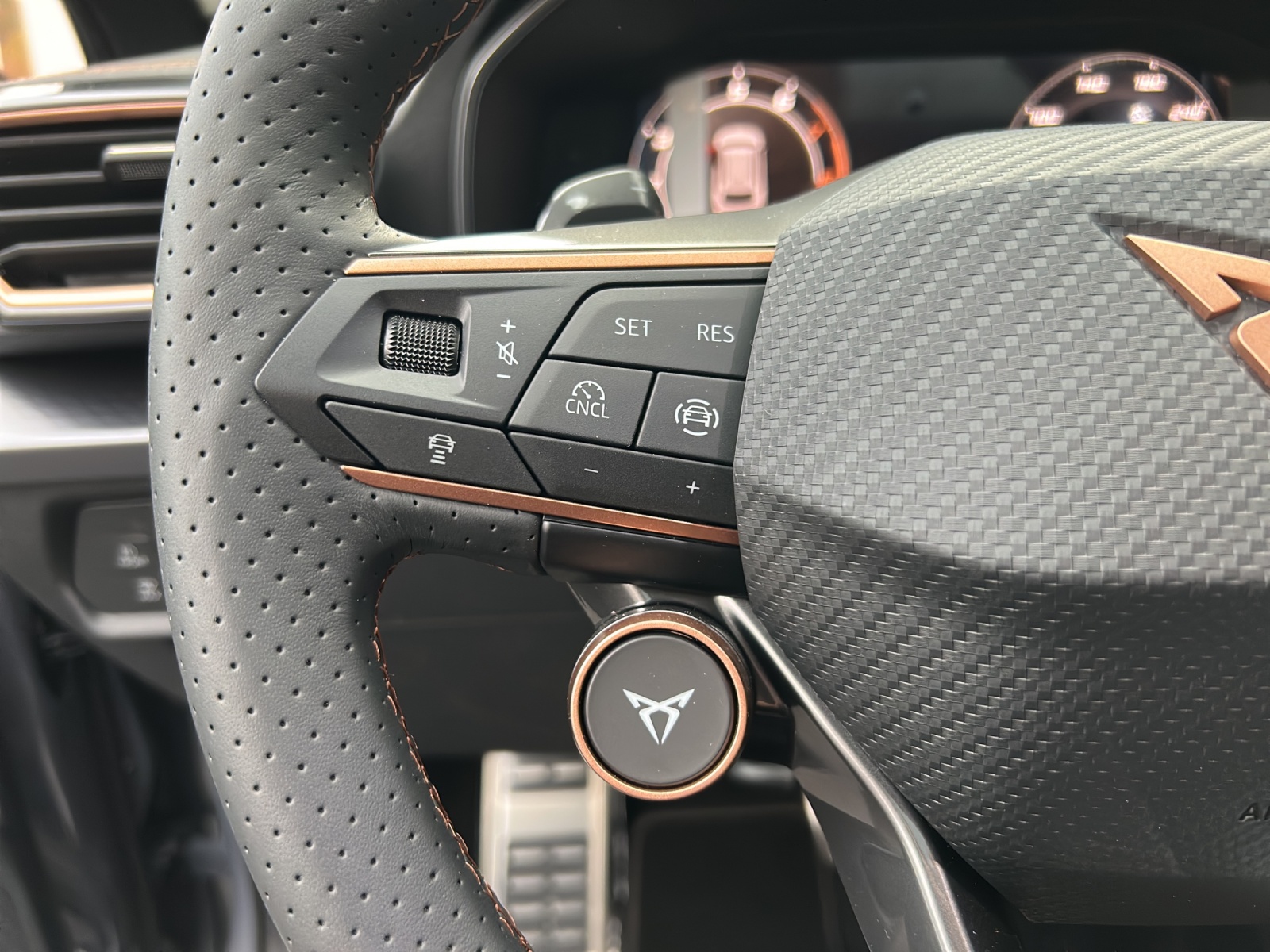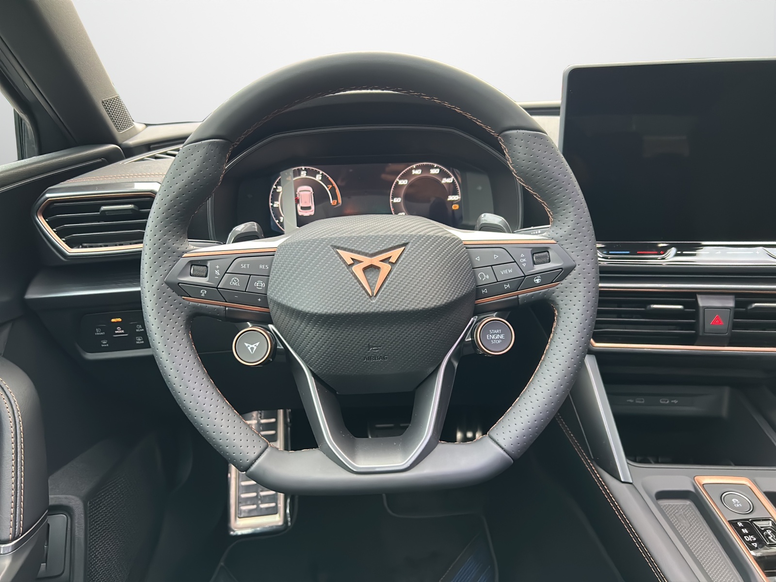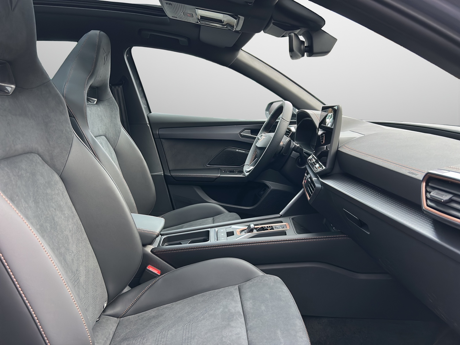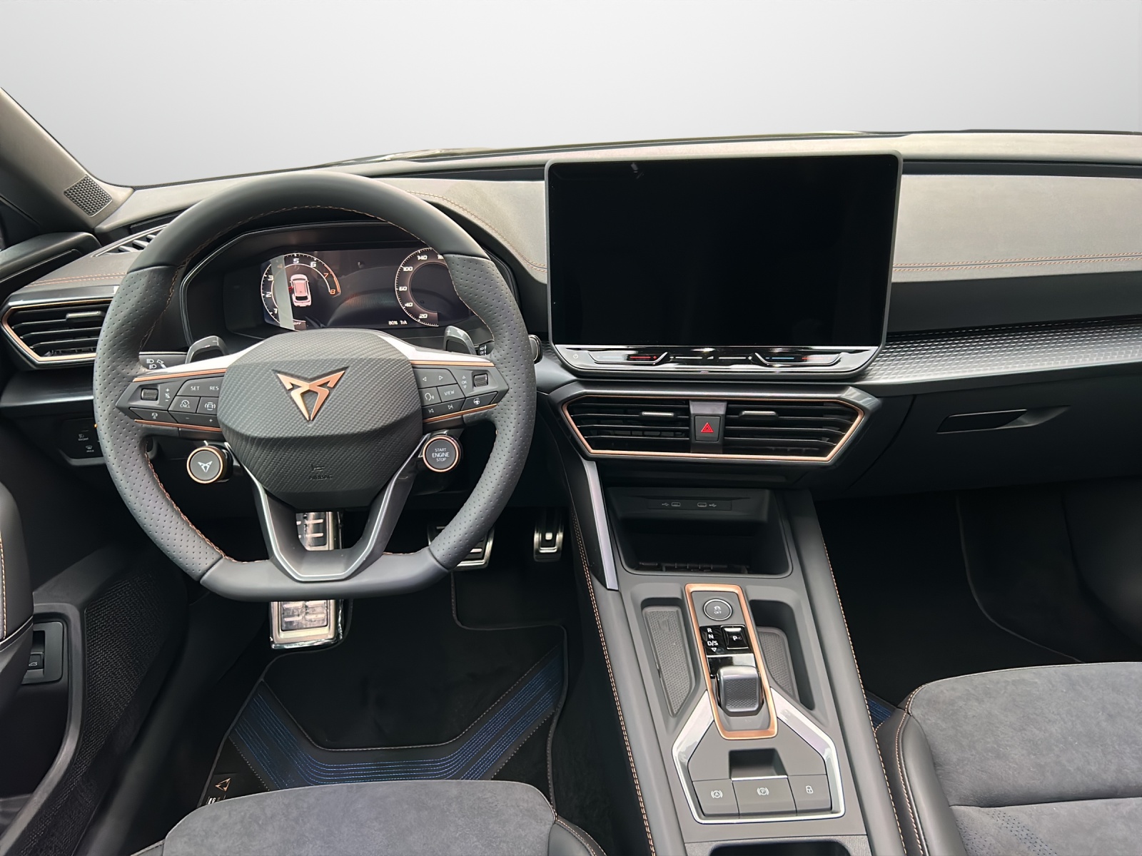 ABS, EBV elektronische Bremskraft-verteilung Abgedunkelte Scheiben ab B-Säule hinten Airbag: Airbag Beifahrer deaktivierbar Airbag: Airbag Fahrer und Beifahrer Airbag: Seitenairbags vorne mit Kopfairbag und Interaktionsairbag vorne Assist: Aufmerksamkeits- und Müdigkeitserkennung (ADA) Assist: Ausweichunterstützung / Abbiegeassistent Assist: Automatische Distanzregelung ACC Assist: Einparkhilfe vorne und hinten Assist: Elektronische Parkbremse mit Auto Hold Funktion Assist: Lane assist (Spurhalteassistent) Assist: Multifunktionskamera Assist: Multikollisionsbremse Assist: Prädiktive Speedlimiter Assist: Regen-/Lichtsensor Assist: Traction Control (TCS) Assist: Traffic sign recognition (Verkehrszeichenerkennung) Aussenspiegel elektrisch einstell-, beheiz- und einklappbar mit Beifahrerabsenkfunktion CUPRA Drive Profile mit "driving experience button" Comfort, Performance, Drift, Individual Dekor: Dekorblenden in Copper Dreipunkt-Automatiksicherheitsgurte auf allen Plätzen ESC mit EBA, DSR und Reifendruckkontrolle Elektrische Fensterheber vorne und hinten mit Komfortschaltung und Einklemmschutz Fussmatten vorne und hinten Garantie: Cupra 12 Jahre Gewährleistung gegen Karosserie-Durchrostung Garantie: Cupra 3 Jahre Lack-Gewährleistung Garantie: Cupra Hersteller-Garantieverlängerung für das 3., 4. und 5. Jahr / max.100000 km Heckscheiben-Wisch-/Waschanlage mit Intervall Innenspiegel automatisch abblendbar Klima: 3-Zonen Climatronic mit Fondraumbedienung LED-Innenraumbeleuchtung mit Ambientebeleuchtung"Monochrom" Lackierung: Uni-Lackierung Lenkrad: Supersportlenkrad mit Start-/ Drive Profile-Knopfsystem und Schaltwippen, beheizbar Licht: Coming Leaving Home Funktion Licht: Drittes Bremslicht Licht: Durchgehende Full LED-Heckleuchten Licht: Dynamische LED-Blinker Licht: Fernlicht-Assistent Licht: LED Heckleuchten mit beleuchtetem 3D CUPRA Logo Licht: LED-Nebelscheinwerfer mit Cornering-Funktion Licht: LED-Scheinwerfer für Abblend- und Fernlicht Licht: Leuchtweitenregulierung Licht: Nebelschlussleuchte Media: 12,9" Infotainment (MIB3) Media: 2 USB C Anschlüsse hinten und vorne Media: CUPRA Connect Remote & Access Media: CUPRA Connect Safety & Services Media: CUPRA Connectivity Box Media: DAB+ (Digital Audio Broadcasting) Media: Mobiltelefon Freisprechanlage Bluetooth Pyrotechnische Gurtstraffer und Gurtkraftbegrenzer vorne Räder: Alufelgen 7,5J x 18", "GARBI" Machined in Dark Shadow Räder: Reifenreparatur-Set (Tire Fit) Schlüsselloses Schliess- und Startsystem (KESSY) Servolenkung mit geschwindigkeitsabhängiger Lenkkraftunterstützung Sicherheitsgurtkontrolle für alle Sitze Sitze: 2 verstellbare Kopfstützen vorne und 3 hinten Sitze: CUPRA Sport Schalensitze in "Sharp Textil schwarz" Sitze: Fahrer- und Beifahrersitz mit Lendenwirbelstütze Sitze: Geteilt abklappbare Rücksitzlehne 1/3 - 2/3 Sitze: Kindersitzverankerung ISOFIX hinten Sitze: Kopfstützen vorne (integrierte) Sitze: Lendenwirbelstütze in den Vordersitzlehnen Sitze: Mittelarmlehne hinten Sitze: Mittelarmlehne vorne Sitze: Sitzheizung für Vordersitze, getrennt regelbar Sitze: Vordersitze höhenverstellbar Sonnenblende Fahrer und Beifahrerseite Stopp - Start- und Rekuperationssystem Wegfahrsperre elektronisch Zentralverriegelung mit Funkfernbedienung, 2 Funkschlüssel