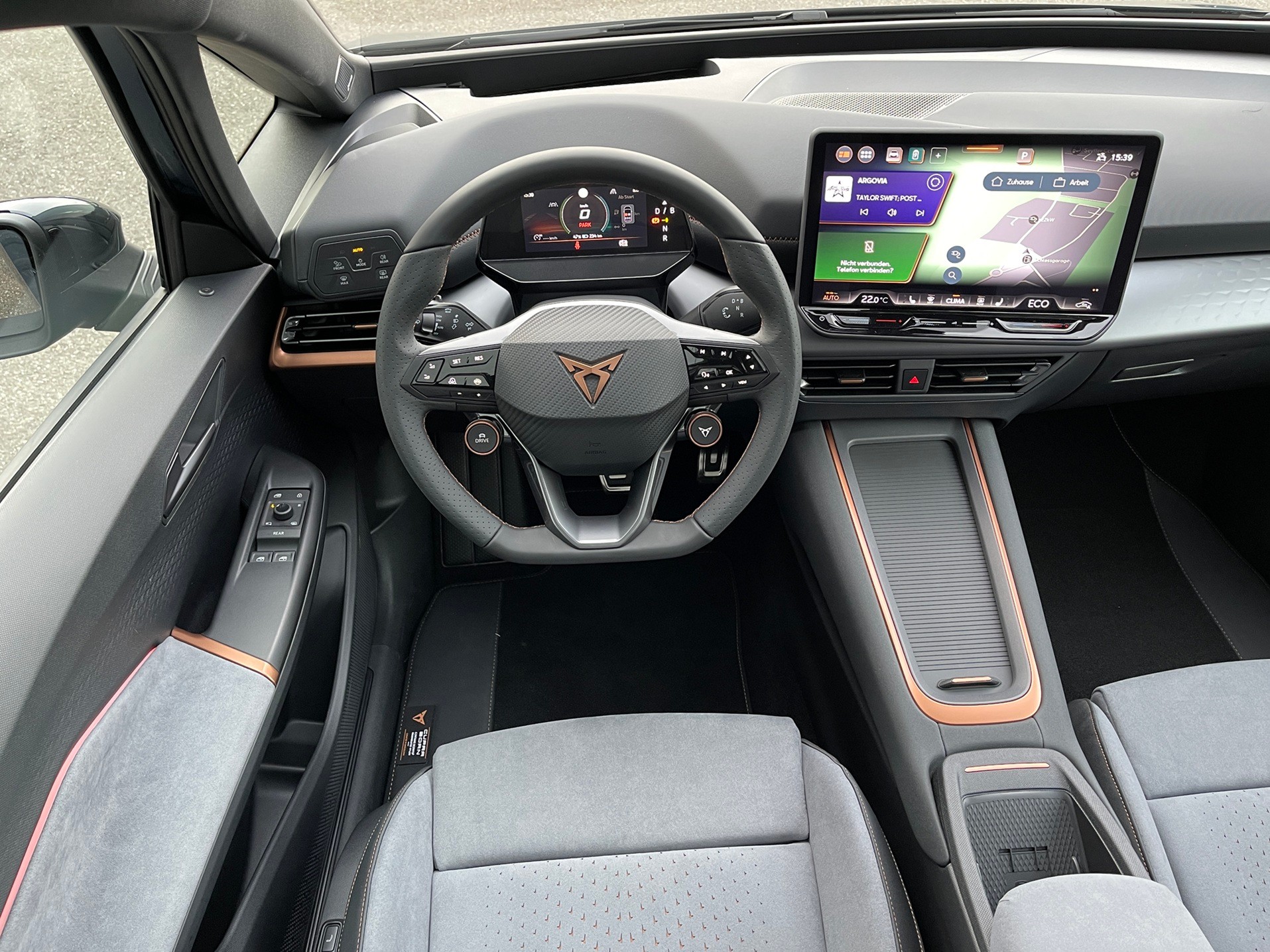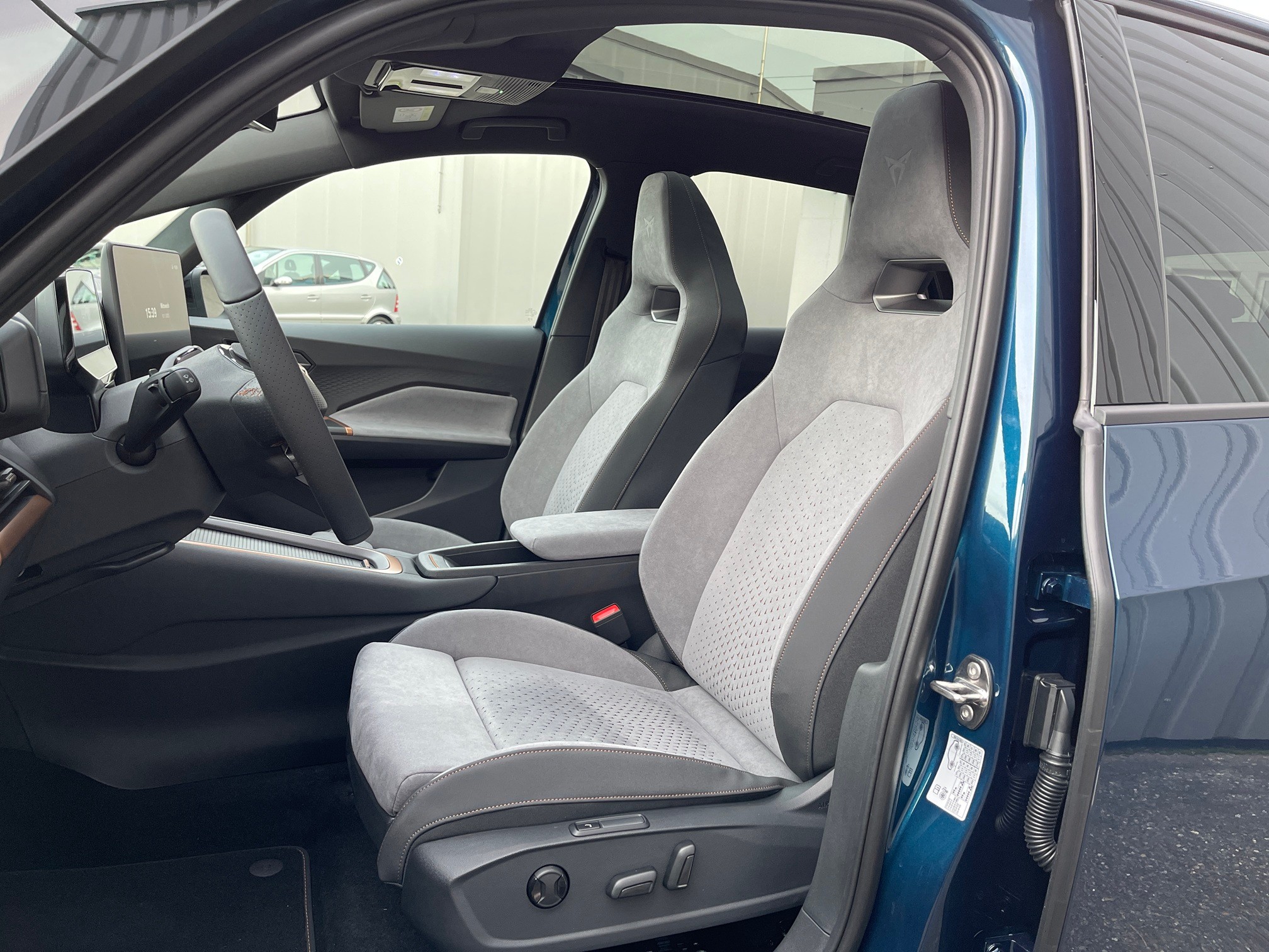 5.3" Full Digital Cockpit ABS, EBV elektronische Bremskraft-verteilung Airbag: Airbag Beifahrer deaktivierbar Airbag: Airbag Fahrer und Beifahrer Airbag: Kopfairbags vorne und hinten Airbag: Seitenairbags für Fahrer und Beifahrer Alarmanlage mit Innenraumüberwachung Ambiente Innenraumbeleuchtung "Multicolor" mit 6 Farben Assist: Aufmerksamkeits- und Müdigkeitserkennung (ADA) Assist: Ausweichunterstützung / Abbiegeassistent Assist: Einparkhilfe vorne und hinten mit optischer Anzeige Assist: Lane assist (Spurhalteassistent) Assist: Regen-/Lichtsensor Assist: Traction Control (TCS) Assist: Verkehrszeichenerkennung Augmented Reality Head-up-Display Aussenspiegel elektrisch einstell-, beheiz- und einklappbar mit Beifahrerabsenkfunktion Aussenspiegel in Cosmo Grey, Türgriffe in Wagenfarbe CUPRA Drive Profile mit "driving experience button" Range, Comfort, Performance, CUPRA, Individual Dreipunkt-Automatiksicherheitsgurte auf allen Plätzen Elektrische Fensterheber vorne und hinten mit Komfortschaltung und Einklemmschutz Elektronisches Stabilitäts-Programm Garantie: Cupra 12 Jahre Gewährleistung gegen Karosserie-Durchrostung Garantie: Cupra 3 Jahre Lack-Gewährleistung Garantie: Cupra Garantie 2 Jahre ohne Kilometerbegrenzung Garantie: Cupra Garantie Batterie- Gewährleistung 8 Jahre oder 160000 KM auf 70% Batterieleistung. Garantie: Cupra Hersteller-Garantieverlängerung für das 3., 4. und 5. Jahr / max.100000 km Getriebe: 1-Gang Automatik Heckscheiben-Wisch-/Waschanlage mit Intervall Innenspiegel automatisch abblendbar Klima: 2-Zonen Climatronic Klima: Elektrische Luftzusatzheizung Lackierung: Uni-Lackierung Lenkrad: Beheizbares Ledermultifunktionslenkrad Licht: Drittes Bremslicht Licht: Durchgehende Full LED-Heckleuchten Licht: Full LED-Scheinwerfer für Abblend-und Fernlicht und Coming Home Funktion Licht: LED-Nebelscheinwerfer Media: 12,9" Infotainment (MIB3) Media: 2 USB C Anschlüsse hinten und vorne Media: Bluetooth-Freisprecheinrichtung Media: CUPRA Connect Online Infotainment für Navigationssystem Media: CUPRA Connect Safety & Services für Navigationssystem Media: CUPRA Navigationssystem 12.9" Infotainment Media: DAB+ (Digital Audio Broadcasting) Paket: CUPRA Sportschalensitze in Dinamica "Granite Grey" Pollenfilter (Staubfilter) Räder: Alufelgen 7.5J x 19", "TYPHOON" 31/1 Machined in Sport Black Räder: Alufelgen 7.5J x 19", "TYPHOON" 31/2 in Glossy Black / Copper Räder: Alufelgen 7.5J x 20", "HURRICANE" 31/3 in Sport Black "e-racer" Räder: Reifendruckkontrollsystem Räder: Tool Kit 19'' und 20'' Servolenkung geschwindigkeitsabhängig Sitze: CUPRA Sport Schalensitze in Textil, schwarz "SEAQUAL" Sitze: Fahrersitz höhenverstellbar Sitze: Geteilt abklappbare Rücksitzlehne 1/3 - 2/3 Sitze: Kindersitzbefestigungssystem ISOFIX Sitze: Mittelarmlehne vorne Sonnenblende Fahrer und Beifahrerseite Wegfahrsperre elektronisch Zentralverriegelung "Keyless-Go"