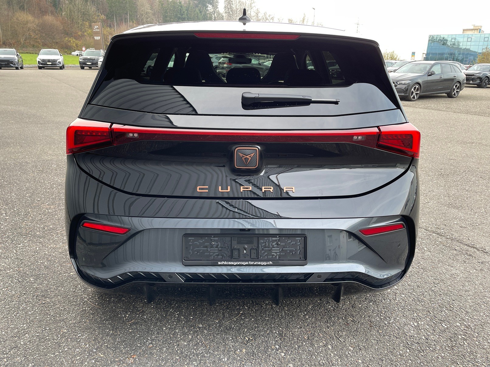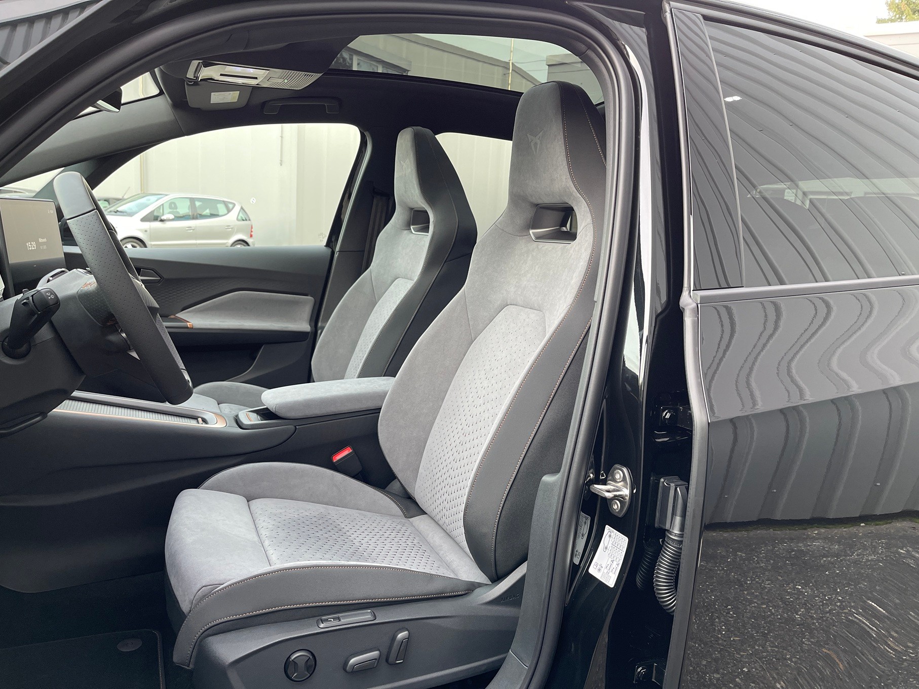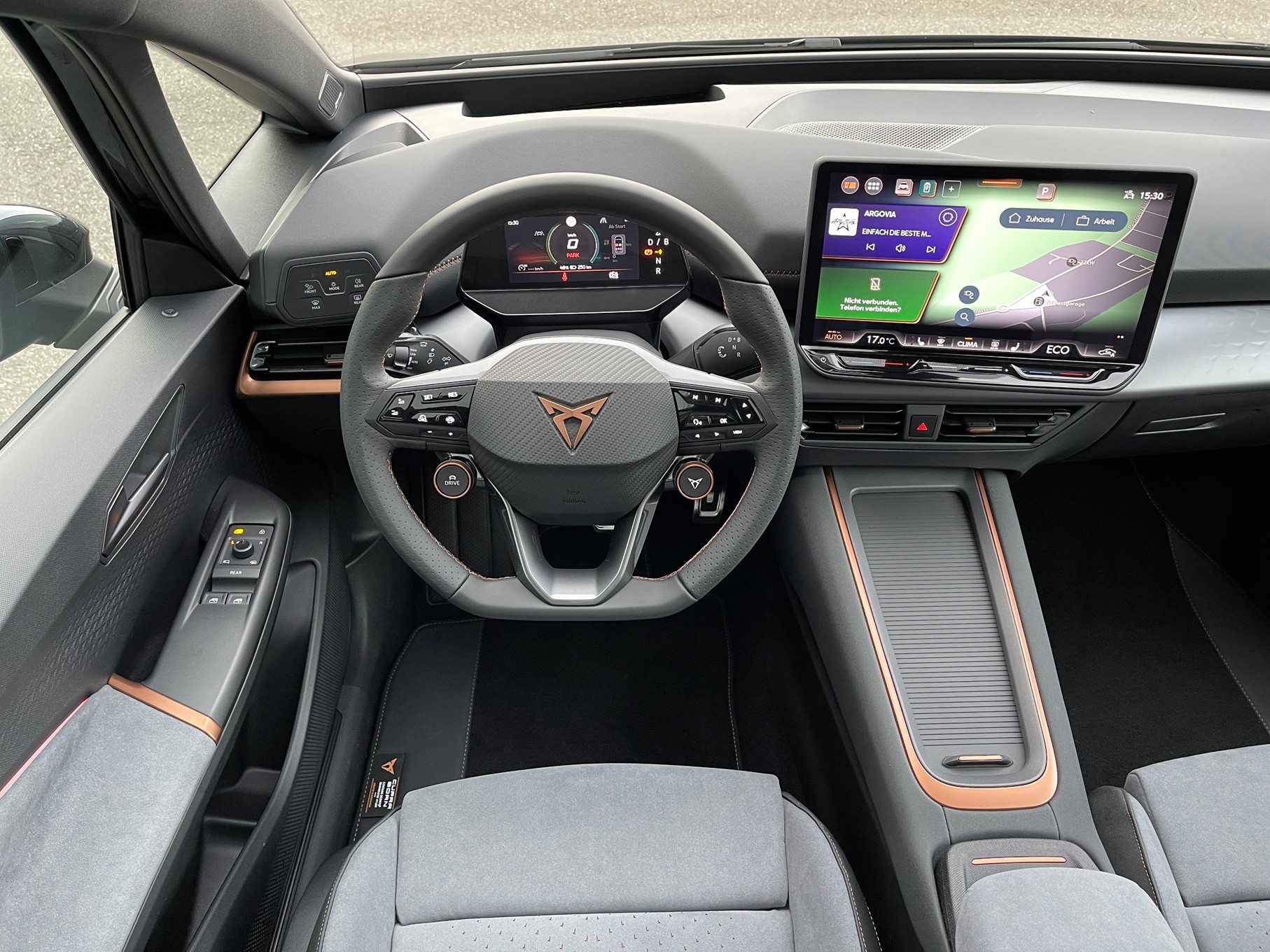 5.3" Full Digital Cockpit ABS, EBV elektronische Bremskraft-verteilung Airbag: Airbag Beifahrer deaktivierbar Airbag: Airbag Fahrer und Beifahrer Airbag: Kopfairbags vorne und hinten Airbag: Seitenairbags für Fahrer und Beifahrer Alarmanlage mit Innenraumüberwachung Ambiente Innenraumbeleuchtung "Multicolor" mit 6 Farben Assist: Aufmerksamkeits- und Müdigkeitserkennung (ADA) Assist: Ausweichunterstützung / Abbiegeassistent Assist: Einparkhilfe vorne und hinten mit optischer Anzeige Assist: Lane assist (Spurhalteassistent) Assist: Regen-/Lichtsensor Assist: Traction Control (TCS) Assist: Verkehrszeichenerkennung Augmented Reality Head-up-Display Aussenspiegel elektrisch einstell-, beheiz- und einklappbar mit Beifahrerabsenkfunktion Aussenspiegel in Cosmo Grey, Türgriffe in Wagenfarbe CUPRA Drive Profile mit "driving experience button" Range, Comfort, Performance, CUPRA, Individual Dreipunkt-Automatiksicherheitsgurte auf allen Plätzen Elektrische Fensterheber vorne und hinten mit Komfortschaltung und Einklemmschutz Elektronisches Stabilitäts-Programm Garantie: Cupra 12 Jahre Gewährleistung gegen Karosserie-Durchrostung Garantie: Cupra 3 Jahre Lack-Gewährleistung Garantie: Cupra Garantie 2 Jahre ohne Kilometerbegrenzung Garantie: Cupra Garantie Batterie- Gewährleistung 8 Jahre oder 160000 KM auf 70% Batterieleistung. Garantie: Cupra Hersteller-Garantieverlängerung für das 3., 4. und 5. Jahr / max.100000 km Getriebe: 1-Gang Automatik Heckscheiben-Wisch-/Waschanlage mit Intervall Innenspiegel automatisch abblendbar Klima: 2-Zonen Climatronic Klima: Elektrische Luftzusatzheizung Lackierung: Uni-Lackierung Lenkrad: Beheizbares Ledermultifunktionslenkrad Licht: Drittes Bremslicht Licht: Durchgehende Full LED-Heckleuchten Licht: Full LED-Scheinwerfer für Abblend-und Fernlicht und Coming Home Funktion Licht: LED-Nebelscheinwerfer Media: 12,9" Infotainment (MIB3) Media: 2 USB C Anschlüsse hinten und vorne Media: Bluetooth-Freisprecheinrichtung Media: CUPRA Connect Online Infotainment für Navigationssystem Media: CUPRA Connect Safety & Services für Navigationssystem Media: CUPRA Navigationssystem 12.9" Infotainment Media: DAB+ (Digital Audio Broadcasting) Paket: CUPRA Sportschalensitze in Dinamica "Granite Grey" Pollenfilter (Staubfilter) Räder: Alufelgen 7.5J x 19", "TYPHOON" 31/1 Machined in Sport Black Räder: Alufelgen 7.5J x 19", "TYPHOON" 31/2 in Glossy Black / Copper Räder: Alufelgen 7.5J x 20", "HURRICANE" 31/3 in Sport Black "e-racer" Räder: Reifendruckkontrollsystem Räder: Tool Kit 19'' und 20'' Servolenkung geschwindigkeitsabhängig Sitze: CUPRA Sport Schalensitze in Textil, schwarz "SEAQUAL" Sitze: Fahrersitz höhenverstellbar Sitze: Geteilt abklappbare Rücksitzlehne 1/3 - 2/3 Sitze: Kindersitzbefestigungssystem ISOFIX Sitze: Mittelarmlehne vorne Sonnenblende Fahrer und Beifahrerseite Wegfahrsperre elektronisch Zentralverriegelung "Keyless-Go"