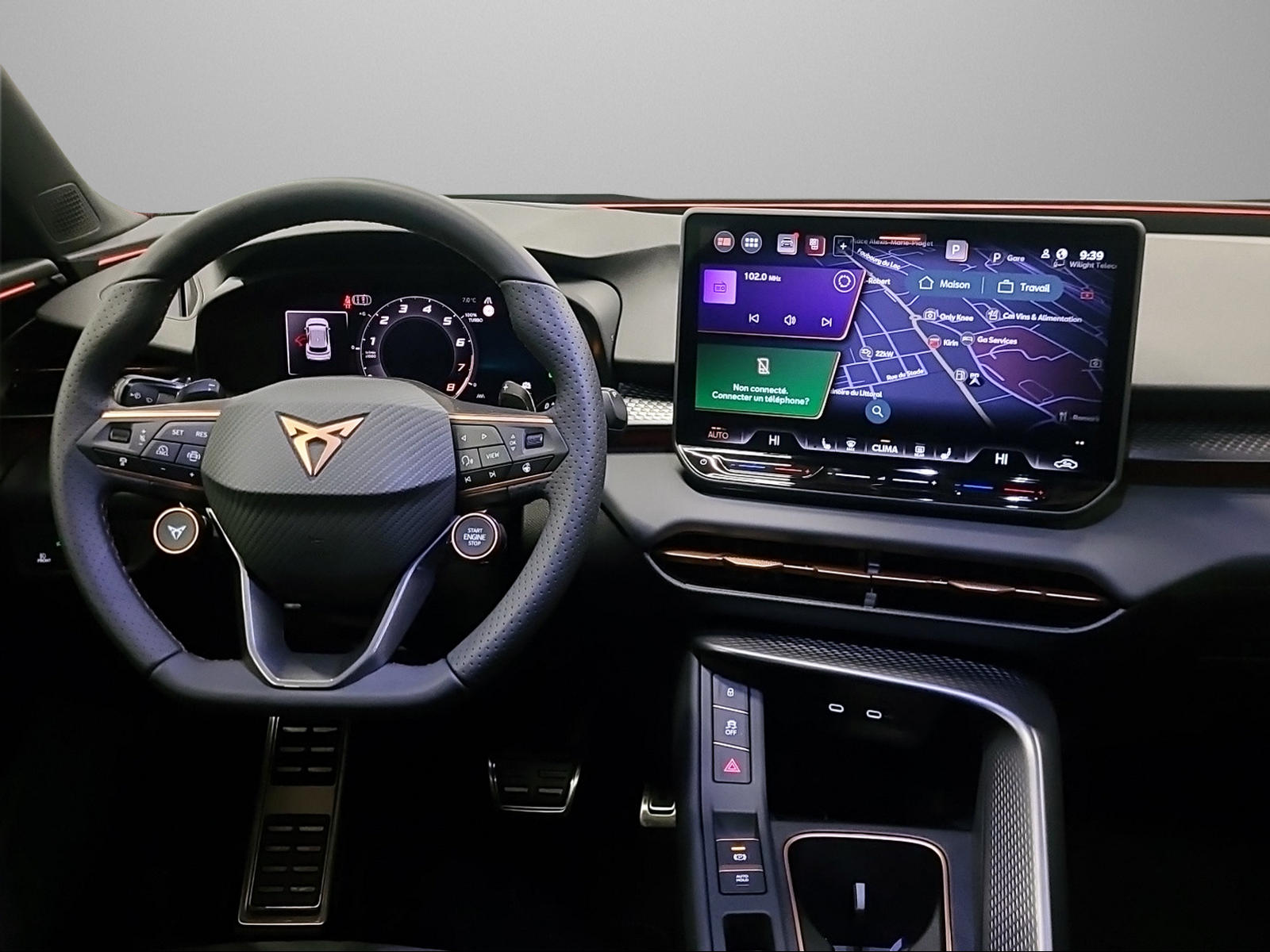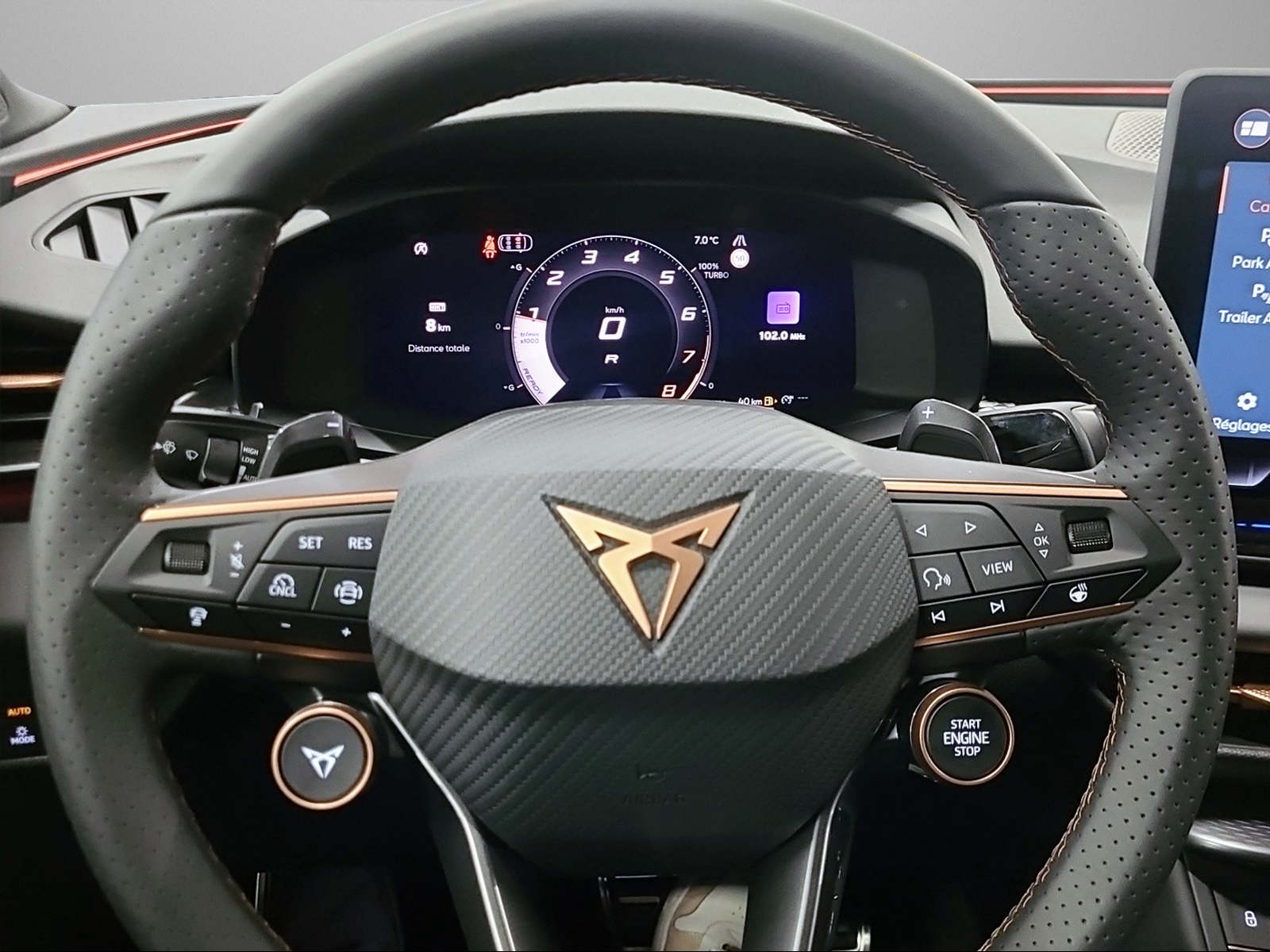 ABS, EBV répartiteur électronique de la force de freinage Accoudoir central à l'avant et à l'arrière Airbag conducteur et passager Airbag: Airbag passager désactivable Airbag: Airbags latéraux pour conducteur et passeggero Airbag: Airbags rideaux pour la tête AV et AR Assist: Aide a l'évasion/assistant de virage Assist: Contrôle de distance automatique ACC Assist: Contrôle de distance de parcage AV et AR Assist: Détection de l'attention et de la somnolence (ADA) Assist: Fonction de freinage d'urgence en ville Assist: Frein de stationnement électronique avec fonction auto hold Assist: Freinage multi collision Assist: Lane assist (assistant au maintien de la trajectoire) Assist: Limiteurs de vitesse prédictifs Assist: Multifunktionskamera Assist: Systeme de surveillance environnementale "Front Assist" Assist: Traffic sign recognition (identification des panneaux de signalisation) Carrosserie entièrement galvanisée Ceintures de sécurité avec prétensionneurs pyrotechniques et limiteurs de tension Ceintures de sécurité à 3 points à toutes les places Cockpit numérique complet 10.25" Direction assistée asservie à la vitesse Détecteur de luminosité et de pluie ESC avec EBA, DSR, XDS et système de contrôle de pression des pneus Essuie-glace AR intermittent avec lave-glace Fahrwerk: Progressivlenkung Fussmatten vorne und hinten Garantie: CUPRA Prolongation de garantie constructeur pour les 3ème, 4ème et 5ème années / Garantie: Cupra 12 ans de garantie contre perforation de la carrosserie Garantie: Cupra 3 ans de garantie pour la peinture LLumière: Phares LED pour feux de croisement et feux de route Lumiere: Feu AR antibrouillard Lumiere: L'éclairage diurne à LED Lumière: 3ème feu de stop Lumière: Combinaison complète de feux arrière à LED dans tout le pays Lumière: Feux arriere a LED avec logo CUPRA 3D éclairé Lumière: Feux arrière LED avec clignotant dynamique Lumière: Phares LED antibrouillard avec fonction cornering Lumière: Réglage dynamique de la portée des phares Lève-vitres électriques à l'avant et à l'arrière, à commande confort et sécurité antipincements Media: 12,9" Infotainment (MIB3) Mèdias: 2 ports USB C arrière et front Mèdias: 8+1 Haut-parleurs Mèdias: CUPRA Connect Remote & Access / CUPRA Connect Safety & Services Mèdias: CUPRA Connectivity Box Mèdias: DAB+ (Digital Audio Broadcasting) Mèdias: Dispositif mains libres Bluetooth pour téléphone mobile Pare-soleil éclairé à gauche avec miroir dissimulé et languette, à droite avec miroir dissimulé Plancher de chargement variable Poignées couleur carrosserie Roues: Affichage du contrôle de la pression Roues: Alufelgen 8J x 18", "ATOMIC" usiné en Dark Shadow Rétroviseur intérieur réglable jour/nuit Rétroviseurs extérieurs avec éclairage périphérique LED Rétroviseurs extérieurs réglables et chauffants électriquement Sieges: 3 appuis-tete arriere réglables Sièges: Ancrage ISOFIX pour siège enfant à l'arrière Sièges: Dossier de banquette rabattable séparément 1/3 - 2/3 Sièges: Sieges baquets sport CUPRA en textile, "DEEP OCEAN" "SEAQUAL" Sièges: Sièges avant réglables en hauteur avec soutien lombaire Stop / Start et système de récupération Suspension: Suspension sport CUPRA Verrouillage centralisé "Keyless-Go" Verrouillage centralisé avec télécommande radio, 2 clés radio Volant: Volant multifonction en cuir avec palettes de changement de vitesse