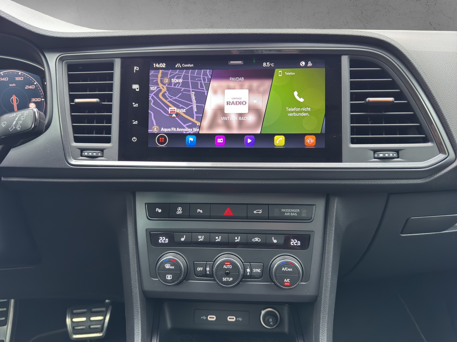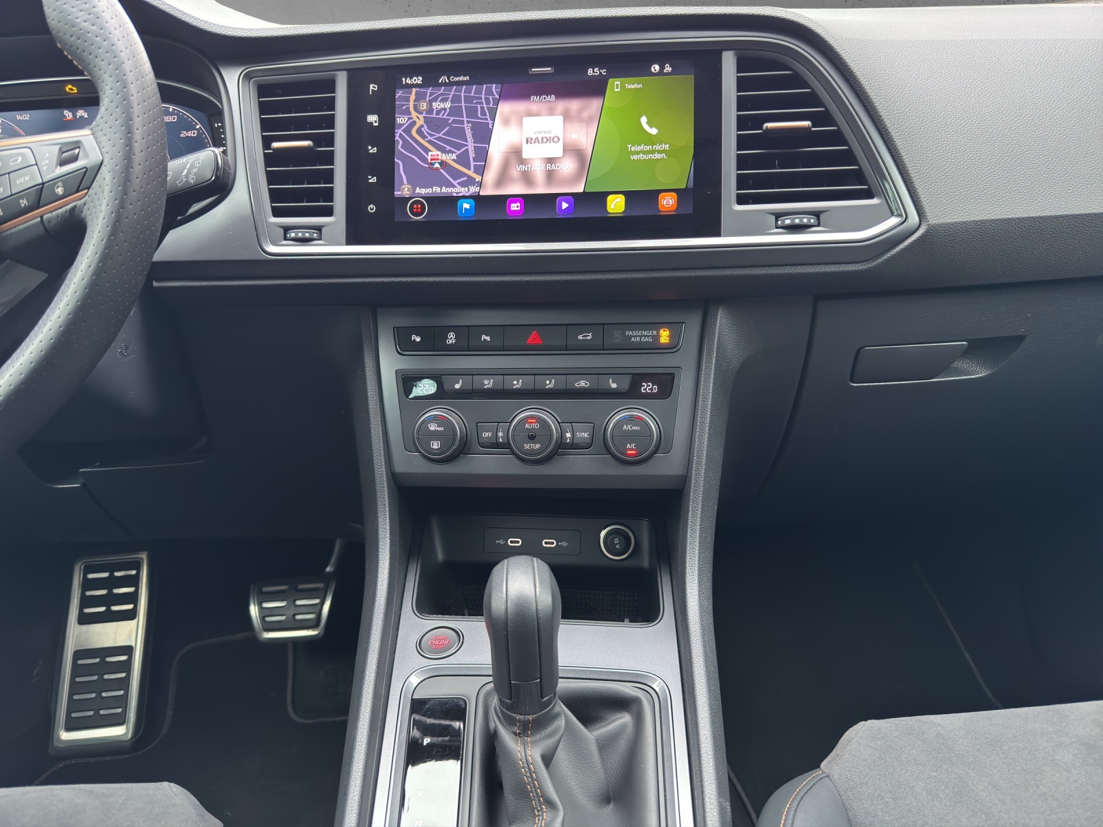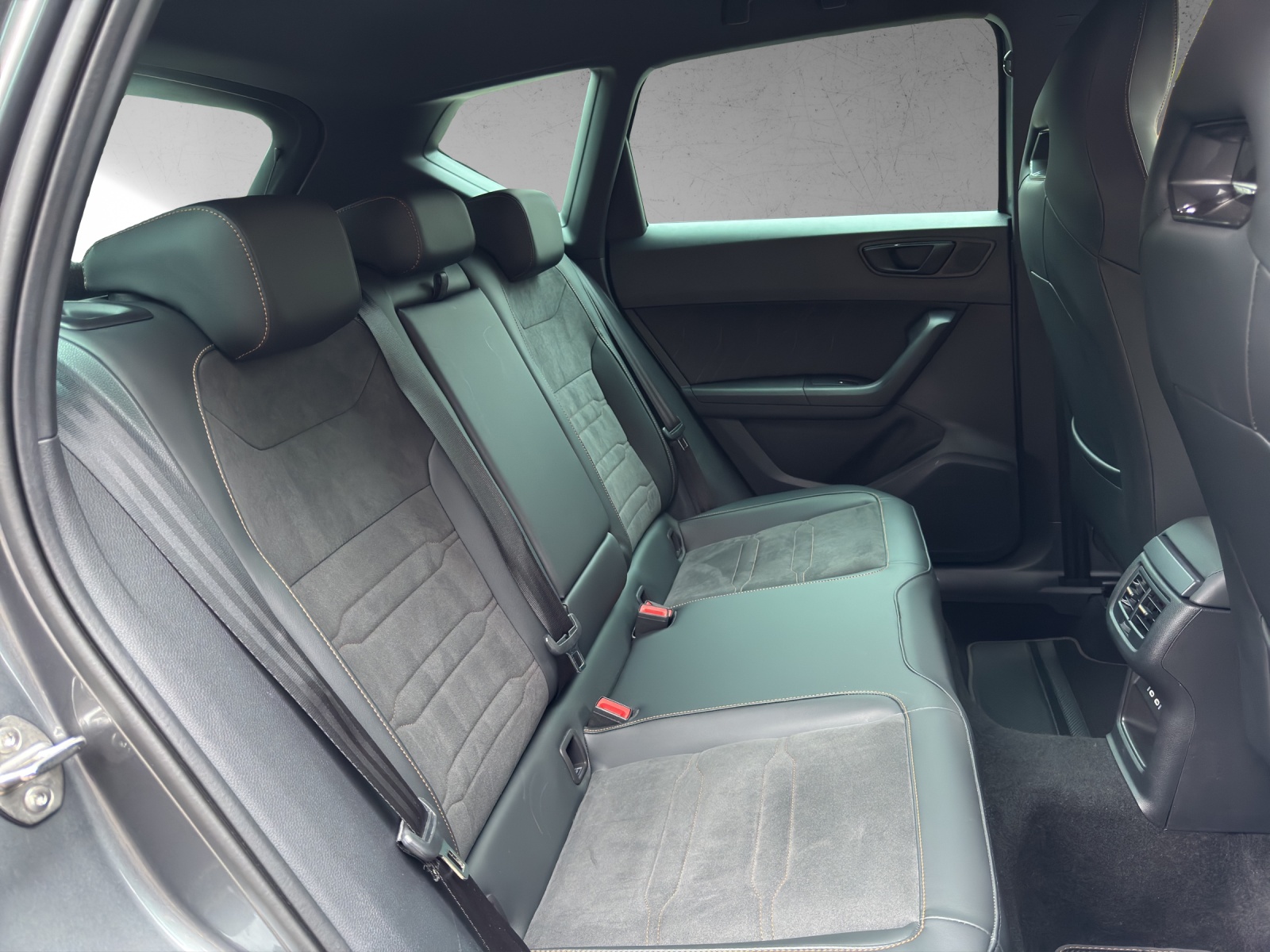ABS, EBV elektronische Bremskraft-verteilung Abgedunkelte Scheiben ab B-Säule hinten Airbag: Airbag Beifahrer deaktivierbar Airbag: Airbag Fahrer und Beifahrer Airbag: Knieairbag auf der Fahrerseite Airbag: Kopfairbags vorne und hinten Airbag: Seitenairbags für Fahrer und Beifahrer Assist: Aufmerksamkeits- und Müdigkeitserkennung (ADA) Assist: Einparkhilfe vorne und hinten mit optischer Anzeige Assist: Elektronische Parkbremse mit Auto Hold Funktion Assist: Lane assist (Spurhalteassistent) Assist: Multikollisionsbremse Assist: Parklenkassistent Assist: Regen-/Lichtsensor Aussenspiegel elektrisch einstell-, beheiz- und einklappbar Aussenspiegel mit Beifahrerspiegelabsenkung Aussenspiegel mit LED-Umfeldbeleuchtung Aussenspiegel und Türgriffe in Wagenfarbe Automatisch abblendender Innenrückspiegel Beleuchtete Sonnenblende links mit abdeckbarem Spiegel und Lasche, rechts mit abdeckbarem Spiegel CUPRA Drive Profile mit "driving experience button" Comfort, Sport, CUPRA, Individual, Snow, Offroad Dekor: Dekorblenden in Grau glänzend Dekor: Türverkleidung mit Ambient light Dreipunkt-Automatiksicherheitsgurte auf allen Plätzen ESC mit EBA, DSR, XDS und Reifendruckkontrolle Einstiegsleisten in Aluminium Elektrische Fensterheber vorne und hinten mit Komfortschaltung und Einklemmschutz Fahrwerk: Progressivlenkung Fussmatten vorne und hinten Garantie: Cupra 12 Jahre Gewährleistung gegen Karosserie-Durchrostung Garantie: Cupra 3 Jahre Lack-Gewährleistung Garantie: Cupra Garantie 2 Jahre ohne Kilometerbegrenzung Heckscheiben-Wisch-/Waschanlage mit Intervall Klima: 2-Zonen Climatronic Lackierung: Uni-Lackierung Lenkrad: Beheizbares Ledermultifunktionslenkrad mit Schaltwippen Licht: Coming-home-Funktion Licht: Drittes Bremslicht Licht: LED-Heckleuchten mit dynamischem Blinklicht Licht: LED-Nebelscheinwerfer mit Cornering-Funktion Licht: LED-Scheinwerfer für Abblend- und Fernlicht Licht: Nebelschlussleuchte Media: 2 USB C Anschlüsse hinten und vorne Media: 9.2" 3D Infotainment (MIB3) Media: CUPRA Connect Online Infotainment für Navigationssystem Media: CUPRA Connect Remote & Access für Navigationssystem Media: CUPRA Connect Safety & Services für Navigationssystem Media: CUPRA FullLink für Navigationssystem Media: CUPRA Navigationssystem Media: DAB+ (Digital Audio Broadcasting) Media: Kartenmaterial ''Europa'' Media: Mobiltelefon Freisprechanlage Bluetooth Pyrotechnische Gurtstraffer und Gurtkraftbegrenzer Radlaufblenden in Wagenfarbe Räder: Alufelgen 8J x 19", Machined Sport Black/Silver Räder: Reifenreparatur-Set (Tire Fit) Schlüsselloses Schliess- und Startsystem (KESSY) Servolenkung mit geschwindigkeitsabhängiger Lenkkraftunterstützung Sitze: 2 verstellbare Kopfstützen vorne und 3 hinten Sitze: CUPRA Sportschalensitze in Dinamica "Black" Sitze: Easy Backseat Release (Rücksitzentriegelung im Kofferraum) Sitze: Geteilt abklappbare Rücksitzlehne 1/3 - 2/3 Sitze: Kindersitzverankerung ISOFIX hinten Sitze: Mittelarmlehne hinten Sitze: Mittelarmlehne vorne Sportabgasanlage mit 2-fach Endrohr Stopp - Start- und Rekuperationssystem Wegfahrsperre elektronisch Zentralverriegelung mit Funkfernbedienung, 2 Funkschlüssel