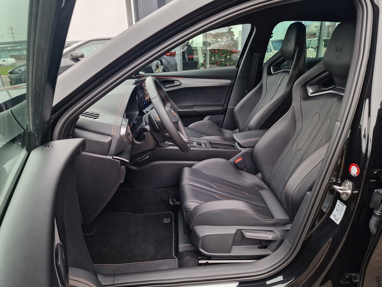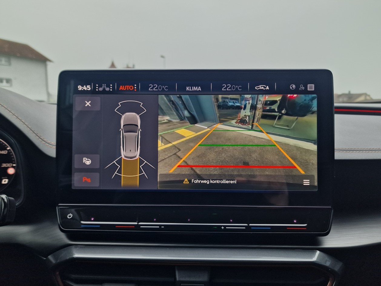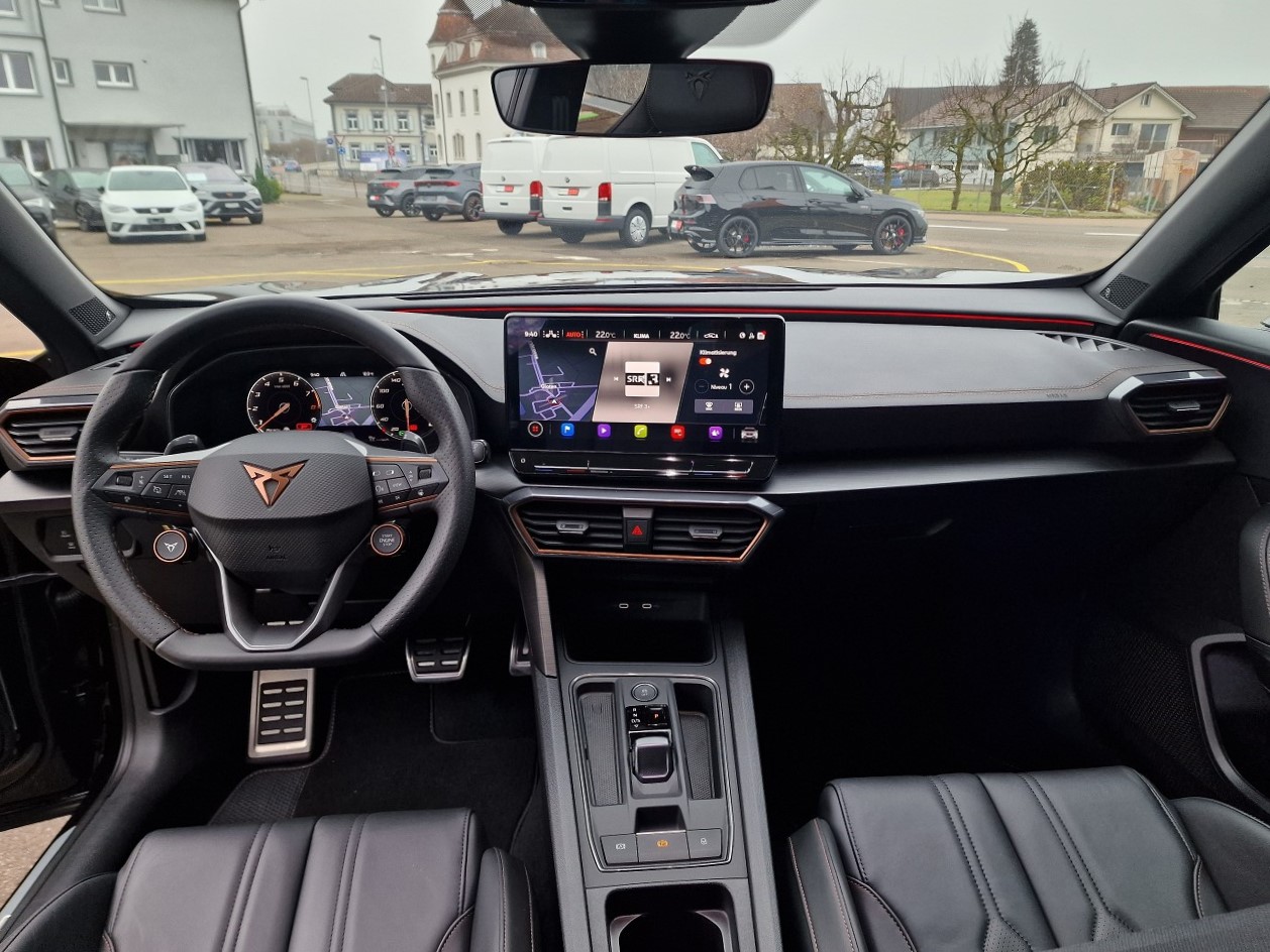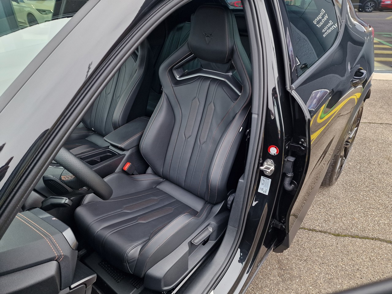 230-Volt Steckdose im Kofferraum und 12-Volt Steckdose in der Mittelkonsole 3-Punkt-Sicherheitsgurte auf allen Plätzen ABS, EBV elektronische Bremskraft-verteilung Abgedunkelte Scheiben ab B-Säule hinten Airbag: Airbag Beifahrer deaktivierbar Airbag: Airbag Fahrer und Beifahrer Airbag: Knie-Airbag für Fahrer Airbag: Kopfairbags vorne und hinten Airbag: Seitenairbag für Fahrer und Beifahrer Assist: City Notbremsfunktion Assist: Einparkhilfe vorne und hinten mit Rückfahrkamera Assist: Elektronische Parkbremse mit Auto Hold Funktion Assist: Exit Assist (Ausparkassistent) Assist: Exit Warning (Ausstiegswarner) Assist: Lane assist (Spurhalteassistent) Assist: Multifunktionskamera Assist: Multikollisionsbremse Assist: Parklenkassistent Assist: PreCrash Sicherheitssystem Assist: Prädiktive automatische Distanzregelung ACC Assist: Tiredness detection (Müdigkeitserkennung) Assist: Top View Camera (Rundumblick) Assist: Traffic Jam Assist (Stauassistent) Assist: Traffic sign recognition (Verkehrszeichenerkennung) Aussenspiegel elektrisch einstell-, beheiz- und einklappbar Aussenspiegel mit Beifahrerspiegelabsenkung Aussenspiegel mit LED-Umfeldbeleuchtung Automatisch abblendender Innenrückspiegel Beleuchtete Sonnenblende links mit abdeckbarem Spiegel und Lasche, rechts mit abdeckbarem Spiegel Bremsen mit 6-Kolben-AKEBONO-Bremssätteln CUPRA Drive Profile mit "driving experience button" Comfort, Sport, CUPRA, Individual, Snow, Offroad ESC mit EBA, DSR, XDS und Reifendruckkontrolle Elektrische Fensterheber vorne und hinten mit Komfortschaltung und Einklemmschutz Fahrwerk: Adaptive Fahrwerksregelung DCC Fahrwerk: Progressivlenkung Fussmatten vorne und hinten Garantie: Cupra 12 Jahre Gewährleistung gegen Karosserie-Durchrostung Garantie: Cupra 3 Jahre Lack-Gewährleistung Garantie: Cupra Garantie 2 Jahre ohne Kilometerbegrenzung Heckscheiben-Wisch-/Waschanlage mit Intervall Klima: 3-Zonen Climatronic mit Fondraumbedienung LED-Innenraumbeleuchtung mit Ambientebeleuchtung Smart Wraparound "Multicolor" Lackierung: Metallic-Lackierung Lenkrad: Supersportlenkrad mit Start-/ Drive Profile-Knopfsystem und Schaltwippen, beheizbar Licht : LED-Scheinwerfer für Abblend- und Fernlicht Licht: Coming Leaving Home Funktion Licht: Drittes Bremslicht Licht: Durchgehende Full LED-Heckleuchten Licht: LED-Heckleuchten mit dynamischem Blinklicht Licht: LED-Nebelscheinwerfer mit Cornering-Funktion Licht: Leuchtweitenregulierung dynamisch Licht: Nebelschlussleuchte Media: 2 USB C Anschlüsse hinten und vorne Media: CUPRA Connect Safety & Services für Navigationssystem Media: CUPRA Connectivity Box Media: CUPRA Navigationssystem 12" Infotainment (MIB3) Media: DAB+ (Digital Audio Broadcasting) Media: Kartenmaterial ''Europa'' Media: Mobiltelefon Freisprechanlage Bluetooth Pollenfilter (Staubfilter) Räder: Alufelgen 8,5J X 20", "Exclusive" Machined in Black/Copper Räder: Reserverad platzsparend Schlüsselloses Schliess- und Startsystem (KESSY) Seitliche Frontsplitter und Einsätze in Karbon Servolenkung mit geschwindigkeitsabhängiger Lenkkraftunterstützung Sitze: 2 verstellbare Kopfstützen vorne und 3 hinten Sitze: CUPRA Sport Schalensitze in "Sharp Textil schwarz" Sitze: Geteilt abklappbare Rücksitzlehne 1/3 - 2/3 Sitze: Kindersitzverankerung ISOFIX hinten Sitze: Mittelarmlehne hinten Sitze: Mittelarmlehne vorne Sitze: Sitzheizung für Vordersitze, getrennt regelbar Sitze: Vordersitze höhenverstellbar mit Lendenwirbelstütze Sportabgasanlage mit 4-Fach Endrohr und Karbon Heckdiffusor Stopp - Start- und Rekuperationssystem Wegfahrsperre elektronisch Zentralverriegelung mit Funkfernbedienung, 2 Funkschlüssel