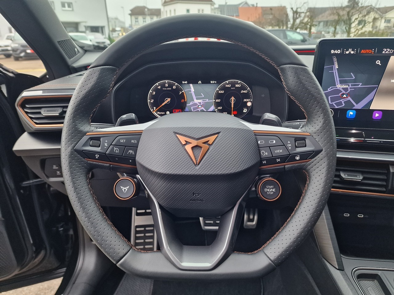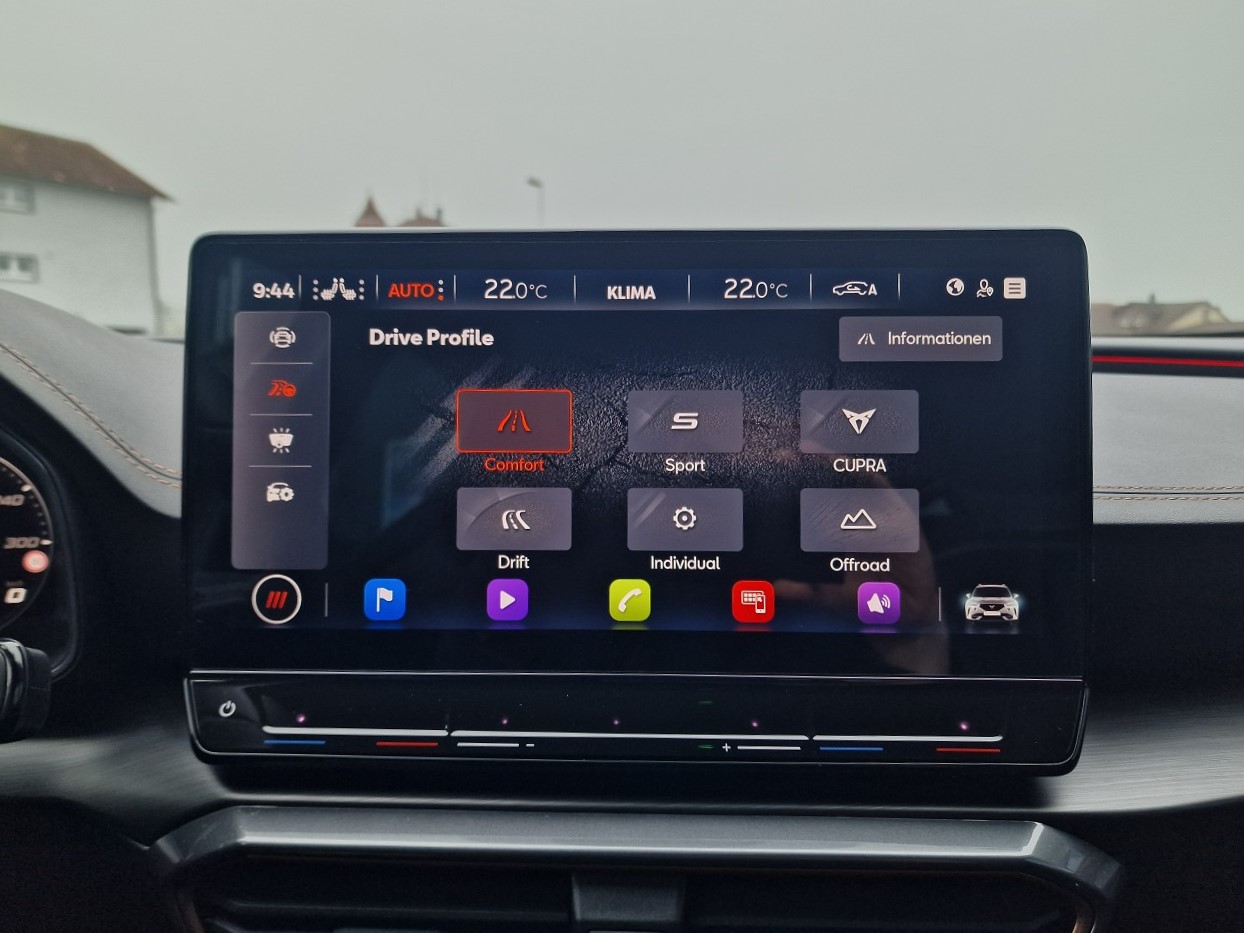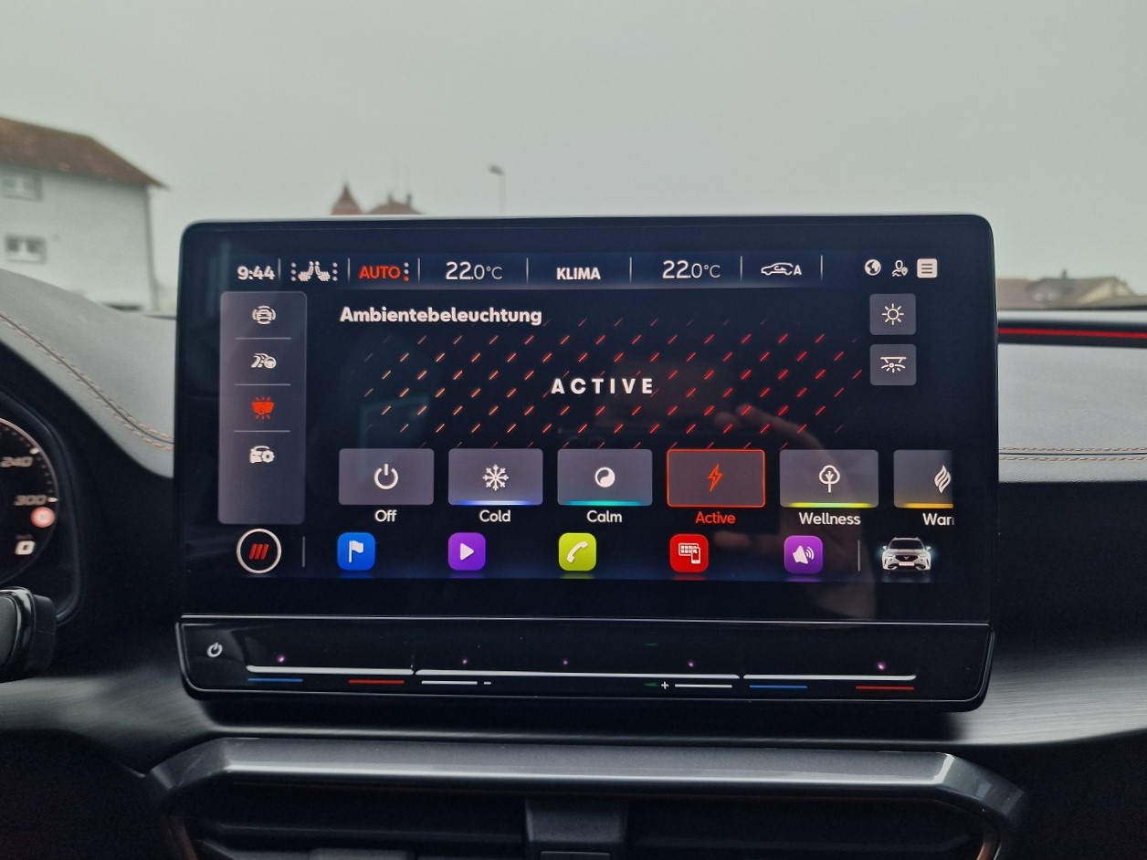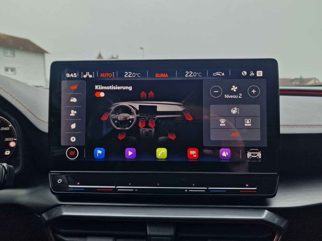 230-Volt Steckdose im Kofferraum und 12-Volt Steckdose in der Mittelkonsole 3-Punkt-Sicherheitsgurte auf allen Plätzen ABS, EBV elektronische Bremskraft-verteilung Abgedunkelte Scheiben ab B-Säule hinten Airbag: Airbag Beifahrer deaktivierbar Airbag: Airbag Fahrer und Beifahrer Airbag: Knie-Airbag für Fahrer Airbag: Kopfairbags vorne und hinten Airbag: Seitenairbag für Fahrer und Beifahrer Assist: City Notbremsfunktion Assist: Einparkhilfe vorne und hinten mit Rückfahrkamera Assist: Elektronische Parkbremse mit Auto Hold Funktion Assist: Exit Assist (Ausparkassistent) Assist: Exit Warning (Ausstiegswarner) Assist: Lane assist (Spurhalteassistent) Assist: Multifunktionskamera Assist: Multikollisionsbremse Assist: Parklenkassistent Assist: PreCrash Sicherheitssystem Assist: Prädiktive automatische Distanzregelung ACC Assist: Tiredness detection (Müdigkeitserkennung) Assist: Top View Camera (Rundumblick) Assist: Traffic Jam Assist (Stauassistent) Assist: Traffic sign recognition (Verkehrszeichenerkennung) Aussenspiegel elektrisch einstell-, beheiz- und einklappbar Aussenspiegel mit Beifahrerspiegelabsenkung Aussenspiegel mit LED-Umfeldbeleuchtung Automatisch abblendender Innenrückspiegel Beleuchtete Sonnenblende links mit abdeckbarem Spiegel und Lasche, rechts mit abdeckbarem Spiegel Bremsen mit 6-Kolben-AKEBONO-Bremssätteln CUPRA Drive Profile mit "driving experience button" Comfort, Sport, CUPRA, Individual, Snow, Offroad ESC mit EBA, DSR, XDS und Reifendruckkontrolle Elektrische Fensterheber vorne und hinten mit Komfortschaltung und Einklemmschutz Fahrwerk: Adaptive Fahrwerksregelung DCC Fahrwerk: Progressivlenkung Fussmatten vorne und hinten Garantie: Cupra 12 Jahre Gewährleistung gegen Karosserie-Durchrostung Garantie: Cupra 3 Jahre Lack-Gewährleistung Garantie: Cupra Garantie 2 Jahre ohne Kilometerbegrenzung Heckscheiben-Wisch-/Waschanlage mit Intervall Klima: 3-Zonen Climatronic mit Fondraumbedienung LED-Innenraumbeleuchtung mit Ambientebeleuchtung Smart Wraparound "Multicolor" Lackierung: Metallic-Lackierung Lenkrad: Supersportlenkrad mit Start-/ Drive Profile-Knopfsystem und Schaltwippen, beheizbar Licht : LED-Scheinwerfer für Abblend- und Fernlicht Licht: Coming Leaving Home Funktion Licht: Drittes Bremslicht Licht: Durchgehende Full LED-Heckleuchten Licht: LED-Heckleuchten mit dynamischem Blinklicht Licht: LED-Nebelscheinwerfer mit Cornering-Funktion Licht: Leuchtweitenregulierung dynamisch Licht: Nebelschlussleuchte Media: 2 USB C Anschlüsse hinten und vorne Media: CUPRA Connect Safety & Services für Navigationssystem Media: CUPRA Connectivity Box Media: CUPRA Navigationssystem 12" Infotainment (MIB3) Media: DAB+ (Digital Audio Broadcasting) Media: Kartenmaterial ''Europa'' Media: Mobiltelefon Freisprechanlage Bluetooth Pollenfilter (Staubfilter) Räder: Alufelgen 8,5J X 20", "Exclusive" Machined in Black/Copper Räder: Reserverad platzsparend Schlüsselloses Schliess- und Startsystem (KESSY) Seitliche Frontsplitter und Einsätze in Karbon Servolenkung mit geschwindigkeitsabhängiger Lenkkraftunterstützung Sitze: 2 verstellbare Kopfstützen vorne und 3 hinten Sitze: CUPRA Sport Schalensitze in "Sharp Textil schwarz" Sitze: Geteilt abklappbare Rücksitzlehne 1/3 - 2/3 Sitze: Kindersitzverankerung ISOFIX hinten Sitze: Mittelarmlehne hinten Sitze: Mittelarmlehne vorne Sitze: Sitzheizung für Vordersitze, getrennt regelbar Sitze: Vordersitze höhenverstellbar mit Lendenwirbelstütze Sportabgasanlage mit 4-Fach Endrohr und Karbon Heckdiffusor Stopp - Start- und Rekuperationssystem Wegfahrsperre elektronisch Zentralverriegelung mit Funkfernbedienung, 2 Funkschlüssel