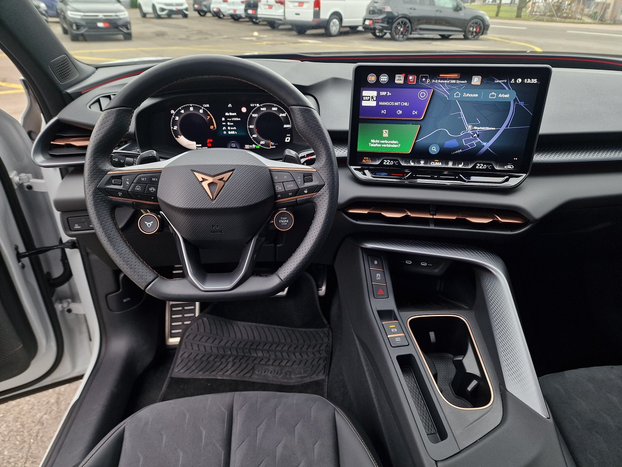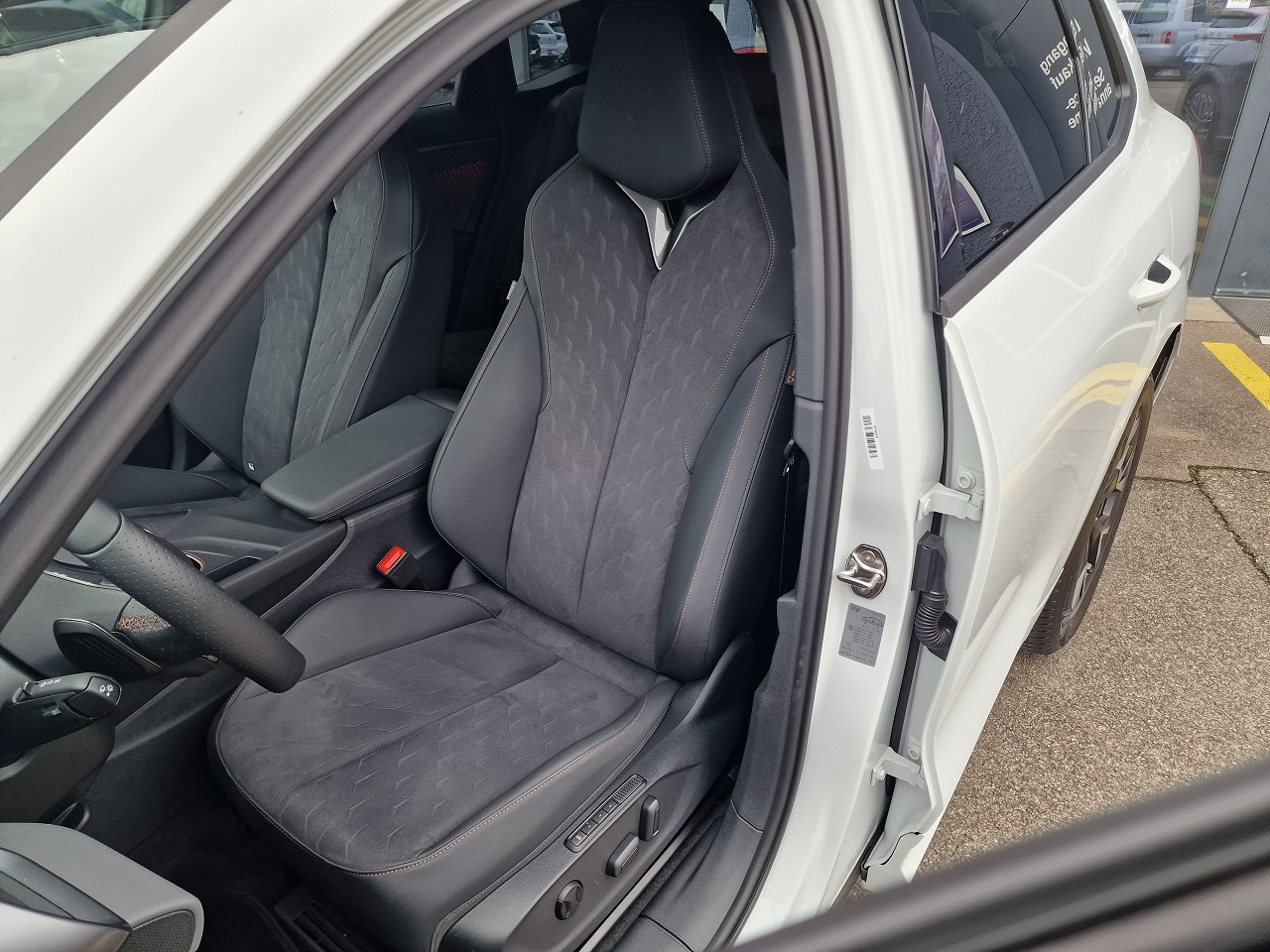 3-Punkt-Sicherheitsgurte auf allen Plätzen ABS, EBV elektronische Bremskraft-verteilung Airbag: Airbag Beifahrer deaktivierbar Airbag: Airbag Fahrer und Beifahrer Airbag: Kopfairbags vorne und hinten Airbag: Seitenairbags für Fahrer und Beifahrer Ambiente Innenraumbeleuchtung mit beleuchteten Türpanelen Assist: Aufmerksamkeits- und Müdigkeitserkennung (ADA) Assist: Ausweichunterstützung / Abbiegeassistent Assist: Automatische Distanzregelung ACC Assist: City Notbremsfunktion Assist: Elektronische Parkbremse mit Auto Hold Funktion Assist: Lane assist (Spurhalteassistent) Assist: Multifunktionskamera Assist: Multikollisionsbremse Assist: Prädiktive Speedlimiter Assist: Traffic sign recognition (Verkehrszeichenerkennung) Assist: Umfeldüberwachungssystem "Front-Assist" Aussenspiegel elektrisch einstell-, beheizbar Aussenspiegel mit LED-Umfeldbeleuchtung Beleuchtete Sonnenblende links mit abdeckbarem Spiegel und Lasche, rechts mit abdeckbarem Spiegel ESC mit EBA, DSR, XDS und Reifendruckkontrolle Elektrische Fensterheber vorne und hinten mit Komfortschaltung und Einklemmschutz Fahrwerk: CUPRA Sportfahrwerk Fahrwerk: Progressivlenkung Fussmatten vorne und hinten Garantie: Cupra 12 Jahre Gewährleistung gegen Karosserie-Durchrostung Garantie: Cupra 3 Jahre Lack-Gewährleistung Garantie: Cupra Garantie 2 Jahre ohne Kilometerbegrenzung Heckscheiben-Wisch-/Waschanlage mit Intervall Innenspiegel automatisch abblendbar Lackierung: Uni-Lackierung Lenkrad: Leder Multifunktionslenkrad mit Schaltwippen Licht: Drittes Bremslicht Licht: Durchgehende Full LED-Heckleuchten Licht: LED Heckleuchten mit beleuchtetem 3D CUPRA Logo Licht: LED-Heckleuchten mit dynamischem Blinklicht Licht: LED-Nebelscheinwerfer mit Cornering-Funktion Licht: LED-Scheinwerfer für Abblend- und Fernlicht Licht: Leuchtweitenregulierung dynamisch Licht: Nebelschlussleuchte Media: 12,9" Infotainment (MIB3) Media: 2 USB C Anschlüsse hinten und vorne Media: CUPRA Connect Online Infotainment Media: CUPRA Connect Remote & Access / CUPRA Connect Safety & Services Media: CUPRA Connectivity Box Media: DAB+ (Digital Audio Broadcasting) Media: Mobiltelefon Freisprechanlage Bluetooth Mittelarmlehne vorne und hinten Pyrotechnische Gurtstraffer und Gurtkraftbegrenzer Räder: Alufelgen 8J x 18", "ATOMIC" Machined in Sport Black Matt Räder: Reifendruckkontrollsystem Servolenkung mit geschwindigkeitsabhängiger Lenkkraftunterstützung Sitze: 3 verstellbare Kopfstützen hinten Sitze: CUPRA Sport Schalensitze in Textil, "DEEP OCEAN" "SEAQUAL" Sitze: Geteilt abklappbare Rücksitzlehne 1/3 - 2/3 Sitze: Kindersitzverankerung ISOFIX hinten Sitze: Vordersitze höhenverstellbar mit Lendenwirbelstütze Stopp - Start- und Rekuperationssystem Wegfahrsperre elektronisch Zentralverriegelung "Keyless-Go" Zentralverriegelung mit Funkfernbedienung, 2 Funkschlüssel