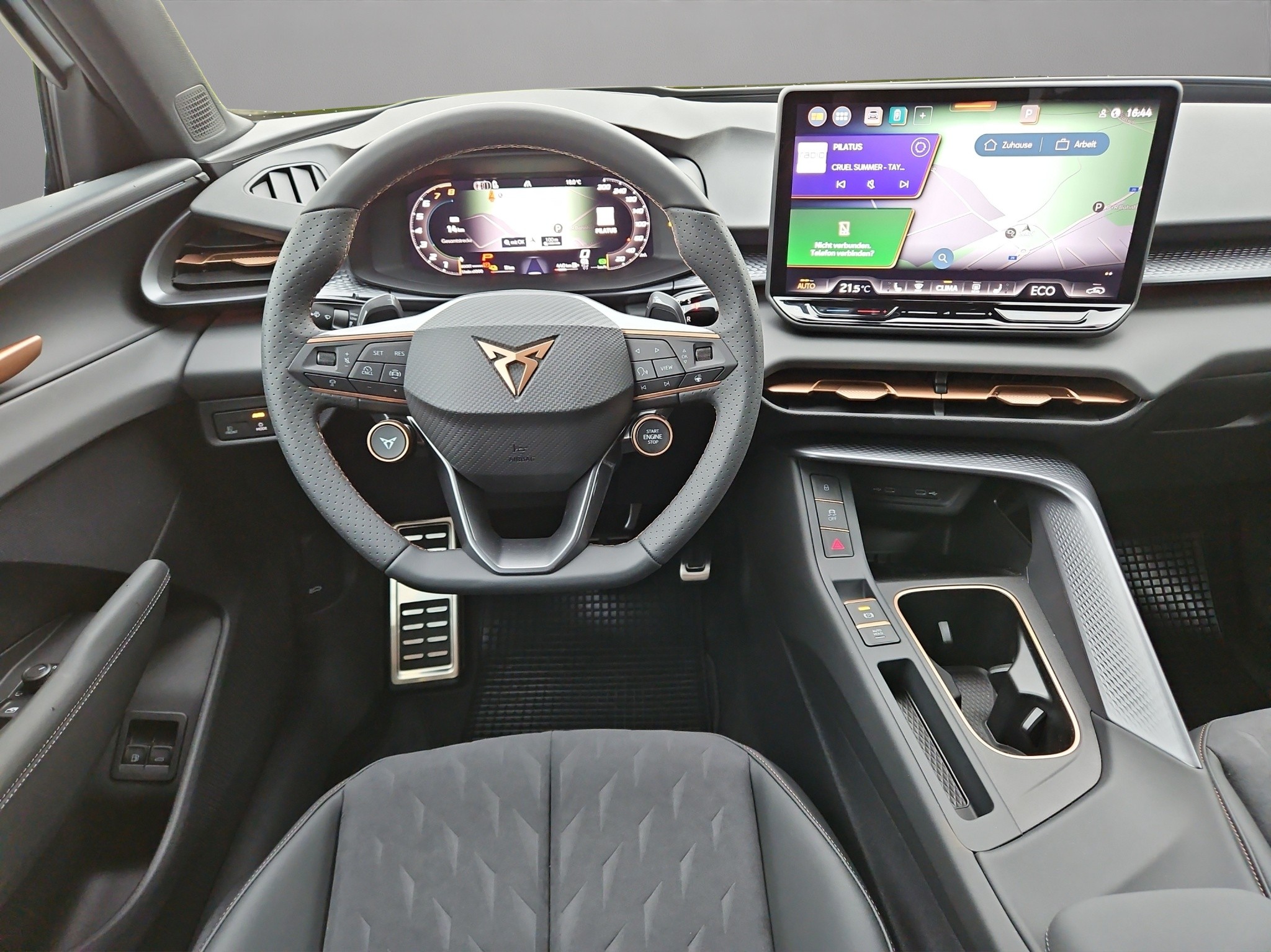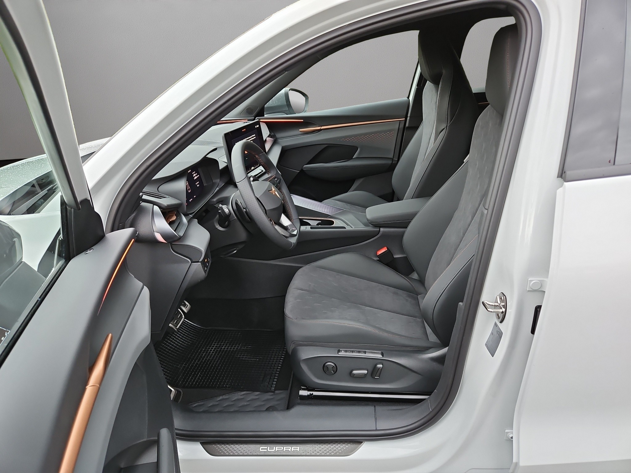 3-Punkt-Sicherheitsgurte auf allen Plätzen ABS, EBV elektronische Bremskraft-verteilung Abgedunkelte Scheiben ab B-Säule hinten Airbag: Airbag Beifahrer deaktivierbar Airbag: Airbag Fahrer und Beifahrer Airbag: Kopfairbags vorne und hinten Airbag: Seitenairbags für Fahrer und Beifahrer Alarmanlage mit Innenraumüberwachung Assist: Aufmerksamkeits- und Müdigkeitserkennung (ADA) Assist: Ausweichunterstützung / Abbiegeassistent Assist: Automatische Distanzregelung ACC Assist: City Notbremsfunktion Assist: Einparkhilfe vorne und hinten mit Rückfahrkamera Assist: Elektronische Parkbremse mit Auto Hold Funktion Assist: Lane assist (Spurhalteassistent) Assist: Multifunktionskamera Assist: Multikollisionsbremse Assist: Prädiktive Speedlimiter Assist: Traffic sign recognition (Verkehrszeichenerkennung) Assist: Umfeldüberwachungssystem "Front-Assist" Aussenspiegel elektrisch einstell-, beheiz- und einklappbar Aussenspiegel mit LED-Umfeldbeleuchtung Beleuchtete Sonnenblende links mit abdeckbarem Spiegel und Lasche, rechts mit abdeckbarem Spiegel ESC mit EBA, DSR, XDS und Reifendruckkontrolle Einstiegsleisten beleuchtet Elektrische Fensterheber vorne und hinten mit Komfortschaltung und Einklemmschutz Fahrwerk: Adaptive Fahrwerksregelung DCC Fahrwerk: CUPRA Sportfahrwerk Fahrwerk: Progressivlenkung Full Digital Cockpit 10.25" Fussmatten vorne und hinten Garantie: Cupra 12 Jahre Gewährleistung gegen Karosserie-Durchrostung Garantie: Cupra 3 Jahre Lack-Gewährleistung Garantie: Cupra Garantie 2 Jahre ohne Kilometerbegrenzung Garantie: Cupra Garantie Batterie- Gewährleistung 8 Jahre oder 160000 KM auf 70% Batterieleistung. Garantie: Cupra Hersteller-Garantieverlängerung für das 3., 4. und 5. Jahr / max.100000 km Heckklappe elektrisch öffnend und schliessend "Virtual Pedal" Heckscheiben-Wisch-/Waschanlage mit Intervall Innenspiegel automatisch abblendbar Klima: 3-Zonen Climatronic mit Fondraumbedienung LED-Ambientebeleuchtung Smart Wraparound, inkl. Funktionsanzeige Lackierung: Uni-Lackierung Ladekabel für Haushaltssteckdose (Mode 2) Lenkrad: Leder Multifunktionslenkrad mit Schaltwippen, beheizbar Licht: Drittes Bremslicht Licht: Durchgehende Full LED-Heckleuchten Licht: LED Heckleuchten mit beleuchtetem 3D CUPRA Logo Licht: LED-Heckleuchten mit dynamischem Blinklicht Licht: LED-Nebelscheinwerfer mit Cornering-Funktion Licht: LED-Scheinwerfer für Abblend- und Fernlicht Licht: Leuchtweitenregulierung dynamisch Licht: Nebelschlussleuchte Media: 12,9" Infotainment (MIB3) Media: 2 USB C Anschlüsse hinten und vorne Media: CUPRA Connect Remote & Access / CUPRA Connect Safety & Services Media: CUPRA Connectivity Box Media: DAB+ (Digital Audio Broadcasting) Media: Mobiltelefon Freisprechanlage Bluetooth Mittelarmlehne vorne und hinten Pyrotechnische Gurtstraffer und Gurtkraftbegrenzer Räder: Alufelgen 8.5J x 19", "COSMIC" Machined in Sport Black Matt & Silver Räder: Reifendruckkontrollsystem Schlüsselloses Schliess- und Startsystem (KESSY Advance) Servolenkung mit geschwindigkeitsabhängiger Lenkkraftunterstützung Sitze: 3 verstellbare Kopfstützen hinten Sitze: CUPRA Sport Schalensitze in Textil, "DEEP OCEAN" "SEAQUAL" Sitze: Geteilt abklappbare Rücksitzlehne 1/3 - 2/3 Sitze: Geteilt abklappbare Rücksitzlehne mit Mittelarmlehne Sitze: Kindersitzverankerung ISOFIX hinten Sitze: Vordersitze höhenverstellbar mit Lendenwirbelstütze Stopp - Start- und Rekuperationssystem Wegfahrsperre elektronisch Zentralverriegelung mit Funkfernbedienung, 2 Funkschlüssel