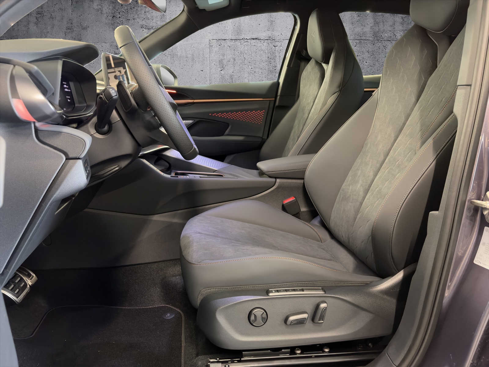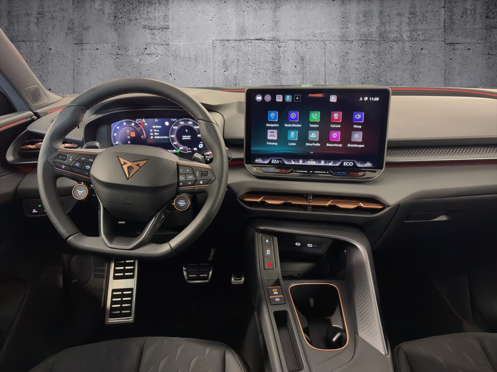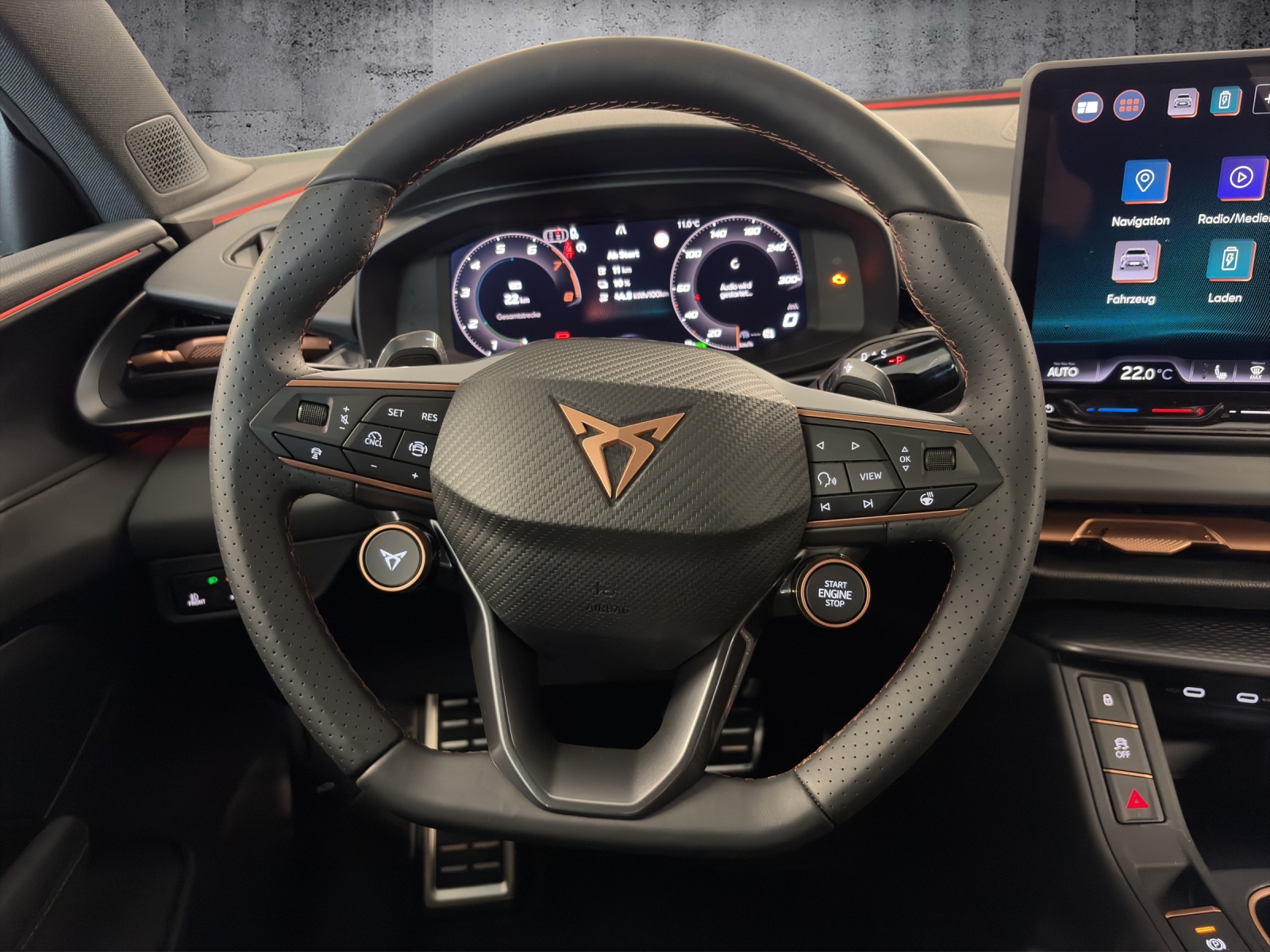 3-Punkt-Sicherheitsgurte auf allen Plätzen ABS, EBV elektronische Bremskraft-verteilung Abgedunkelte Scheiben ab B-Säule hinten Airbag: Airbag Beifahrer deaktivierbar Airbag: Airbag Fahrer und Beifahrer Airbag: Kopfairbags vorne und hinten Airbag: Seitenairbags für Fahrer und Beifahrer Alarmanlage mit Innenraumüberwachung Assist: Aufmerksamkeits- und Müdigkeitserkennung (ADA) Assist: Ausweichunterstützung / Abbiegeassistent Assist: Automatische Distanzregelung ACC Assist: City Notbremsfunktion Assist: Einparkhilfe vorne und hinten mit Rückfahrkamera Assist: Elektronische Parkbremse mit Auto Hold Funktion Assist: Lane assist (Spurhalteassistent) Assist: Multifunktionskamera Assist: Multikollisionsbremse Assist: Prädiktive Speedlimiter Assist: Traffic sign recognition (Verkehrszeichenerkennung) Assist: Umfeldüberwachungssystem "Front-Assist" Aussenspiegel elektrisch einstell-, beheiz- und einklappbar Aussenspiegel mit LED-Umfeldbeleuchtung Beleuchtete Sonnenblende links mit abdeckbarem Spiegel und Lasche, rechts mit abdeckbarem Spiegel ESC mit EBA, DSR, XDS und Reifendruckkontrolle Einstiegsleisten beleuchtet Elektrische Fensterheber vorne und hinten mit Komfortschaltung und Einklemmschutz Fahrwerk: Adaptive Fahrwerksregelung DCC Fahrwerk: CUPRA Sportfahrwerk Fahrwerk: Progressivlenkung Full Digital Cockpit 10.25" Fussmatten vorne und hinten Garantie: Cupra 12 Jahre Gewährleistung gegen Karosserie-Durchrostung Garantie: Cupra 3 Jahre Lack-Gewährleistung Garantie: Cupra Garantie 2 Jahre ohne Kilometerbegrenzung Garantie: Cupra Garantie Batterie- Gewährleistung 8 Jahre oder 160000 KM auf 70% Batterieleistung. Garantie: Cupra Hersteller-Garantieverlängerung für das 3., 4. und 5. Jahr / max.100000 km Heckklappe elektrisch öffnend und schliessend "Virtual Pedal" Heckscheiben-Wisch-/Waschanlage mit Intervall Innenspiegel automatisch abblendbar Klima: 3-Zonen Climatronic mit Fondraumbedienung LED-Ambientebeleuchtung Smart Wraparound, inkl. Funktionsanzeige Lackierung: Uni-Lackierung Ladekabel für Haushaltssteckdose (Mode 2) Lenkrad: Leder Multifunktionslenkrad mit Schaltwippen, beheizbar Licht: Drittes Bremslicht Licht: Durchgehende Full LED-Heckleuchten Licht: LED Heckleuchten mit beleuchtetem 3D CUPRA Logo Licht: LED-Heckleuchten mit dynamischem Blinklicht Licht: LED-Nebelscheinwerfer mit Cornering-Funktion Licht: Leuchtweitenregulierung dynamisch Licht: Nebelschlussleuchte Media: 12,9" Infotainment (MIB3) Media: 2 USB C Anschlüsse hinten und vorne Media: CUPRA Connect Remote & Access / CUPRA Connect Safety & Services Media: CUPRA Connectivity Box Media: CUPRA Navigationssystem Media: DAB+ (Digital Audio Broadcasting) Media: IMMERSIVE by SENNHEISER Media: Mobiltelefon Freisprechanlage Bluetooth Mittelarmlehne vorne und hinten Pyrotechnische Gurtstraffer und Gurtkraftbegrenzer Räder: Alufelgen 8.5J x 19", "COSMIC" Machined in Sport Black Matt & Silver Räder: Reifendruckkontrollsystem Schlüsselloses Schliess- und Startsystem (KESSY Advance) Servolenkung mit geschwindigkeitsabhängiger Lenkkraftunterstützung Sitze: 3 verstellbare Kopfstützen hinten Sitze: Geteilt abklappbare Rücksitzlehne 1/3 - 2/3 Sitze: Geteilt abklappbare Rücksitzlehne mit Mittelarmlehne Sitze: Kindersitzverankerung ISOFIX hinten Sitze: Vordersitze höhenverstellbar mit Lendenwirbelstütze Stopp - Start- und Rekuperationssystem Wegfahrsperre elektronisch Zentralverriegelung mit Funkfernbedienung, 2 Funkschlüssel