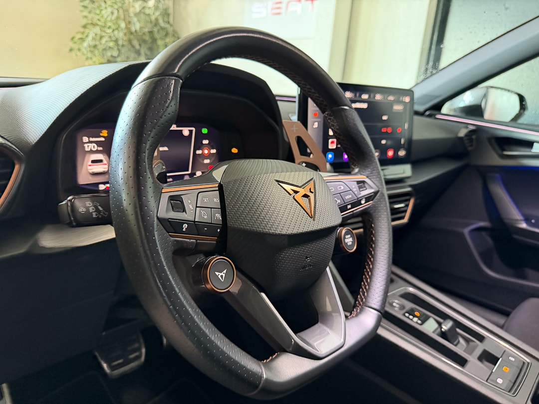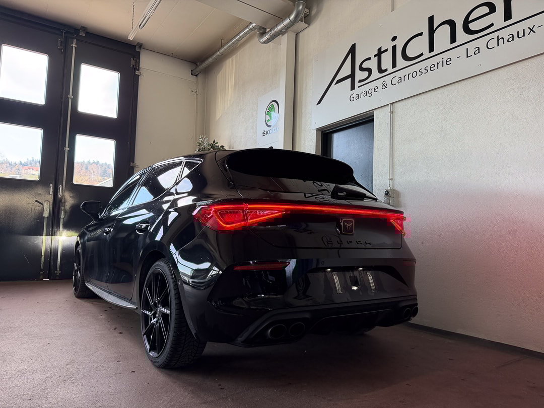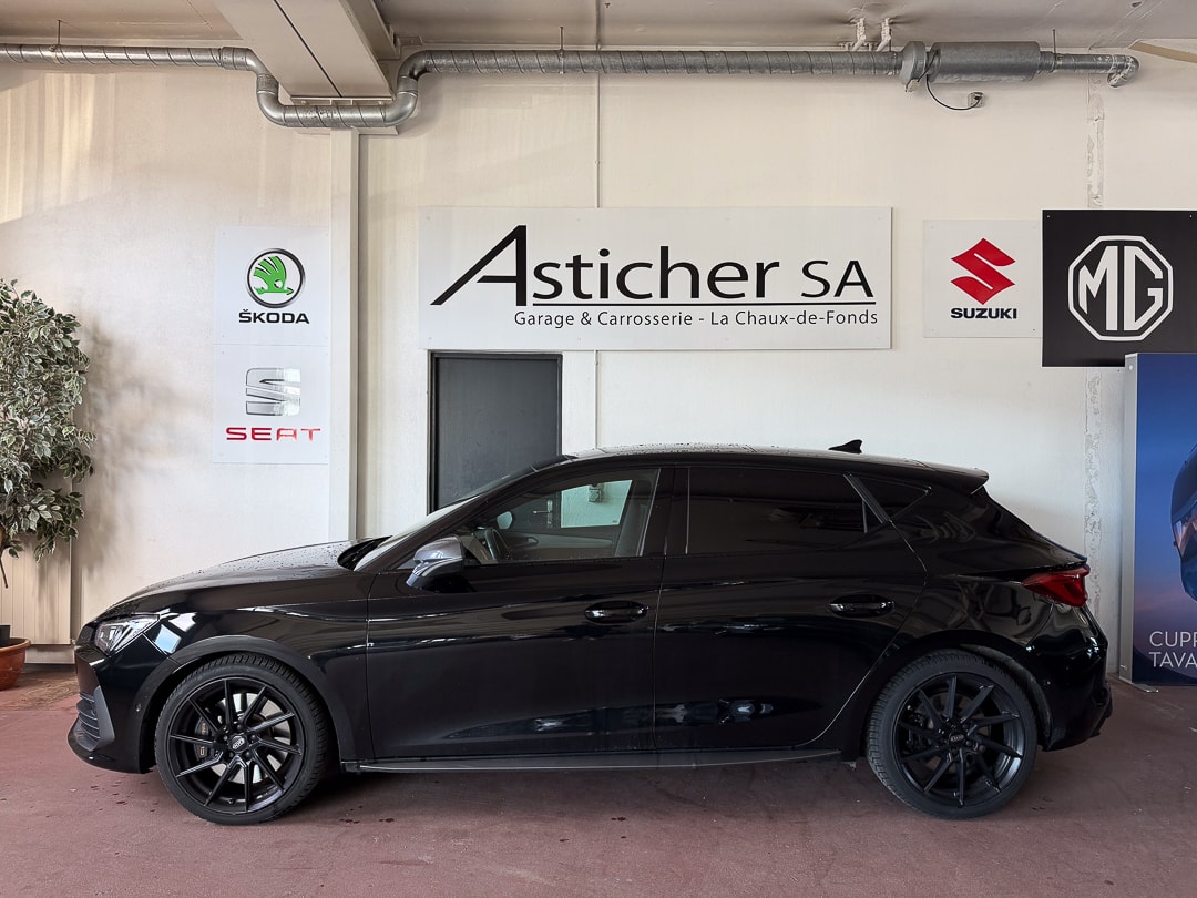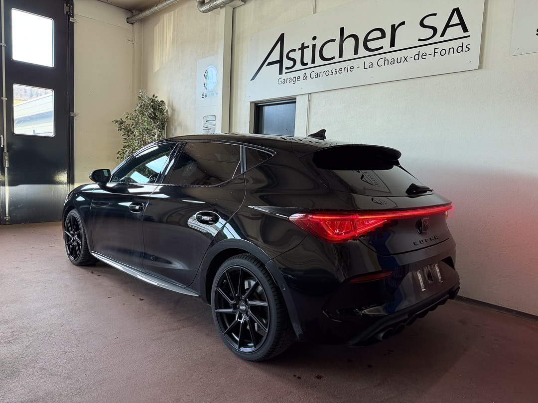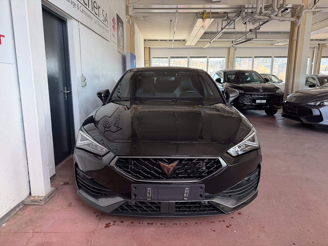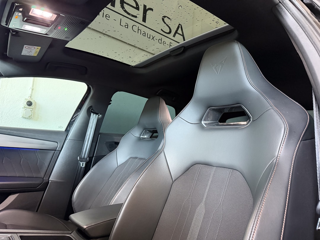 ABS, EBV elektronische Bremskraft-verteilung Abgedunkelte Scheiben ab B-Säule hinten Airbag: Airbag Beifahrer deaktivierbar Airbag: Airbag Fahrer und Beifahrer Airbag: Kopfairbags vorne und hinten Airbag: Seitenairbags für Fahrer und Beifahrer Ancrage de siège enfant ISOFIX (sièges arrières ext.) Assist: Einparkhilfe hinten Assist: Elektronische Parkbremse mit Auto Hold Funktion Assist: Multifunktionskamera Assist: Multikollisionsbremse Assist: PreCrash Sicherheitssystem Assist: Tiredness detection (détecteur de fatigue) Assist: Traction Control (TCS), désactivable Aussenspiegel elektrisch einstell-, beheiz- und einklappbar mit Beifahrerabsenkfunktion Baguettes décoratives cerclant les fenêtres latérales en noir brillant CUPRA Drive Profile avec "driving experience button"Comfort, Sport, CUPRA, Individual Capteur de pluie et lumière Capteurs de stationnement Midnight Black Ceintures de sécurité automatiques à trois points à toutes les places Clima: Climatronic 3 zones Contrôle du port de ceinture de sécurité pour tous le sièges Décor: Éléments décoratifs en copper ESC avec EBA, DSR et système de contrôle de pression des pneus Elektrische Fensterheber vorne und hinten mit Komfortschaltung und Einklemmschutz Etriers de freins l'avant et à l'arrière en noir Garantie: 2 Jahre ohne Kilometerbegrenzung (ab 1. Inv.) Gasoline Particule Filter Getriebe: 7-Gang-Sequentielle-Getriebe mit Automatikfunktion Heckscheiben-Wisch-/Waschanlage mit Intervall Lackierung: Uni-Lackierung Licht: Drittes Bremslicht Licht: Durchgehende Full LED-Heckleuchten Licht: LED-Heckleuchten mit dynamischem Blinklicht Licht: LED-Nebelscheinwerfer mit Cornering-Funktion Licht: LED-Scheinwerfer für Abblend- und Fernlicht Licht: Leuchtweitenregulierung Lumière: Fonction Coming Leaving Home Media: 12" Infotainment (MIB3) Media: 2 USB C Anschlüsse hinten und vorne Media: CUPRA Navigationssystem Media: DAB+ (Digital Audio Broadcasting) Media: Kartenmaterial ''Europa'' Media: Mobiltelefon Freisprechanlage Bluetooth Mittelarmlehne vorne und hinten Mèdias: CUPRA Connect Online Infotainment pour navigation Mèdias: CUPRA Connect Remote & Access pour navigation Mèdias: CUPRA Connect Safety & Services pour le systeme de navigation Pare-chocs sportif avec diffuseur arrière en couleur carrosserie Pollenfilter (Staubfilter) Porte-documents sous le siège du chauffeur avant Pyrotechnische Gurtstraffer und Gurtkraftbegrenzer Roues: Jantes en alu 8J x 19", "EXCLUSIVE" 30/1 (235/35 R19) Roues: Roue de secours peu encombrante Räder: Reifendruck-Kontrollanzeige Rétroviseur intérieur anti-éblouissement Rétroviseurs extérieurs avec clignotants à LED Rétroviseurs extérieurs en Cosmo Grey, poignées de porte dans la couleur de la carrosserie Servolenkung mit geschwindigkeitsabhängiger Lenkkraftunterstützung Sitze: Geteilt abklappbare Rücksitzlehne 1/3 - 2/3 Sitze: Kindersitzverankerung ISOFIX hinten Sitze: Vordersitze höhenverstellbar Sièges: 2 appuie-têtes réglables à lavant et 3 à larrière Sièges: Porte-documents sous le siège du chauffeur avant Sièges: Sièges baquets CUPRA Sport en "Sharp textile black" Stopp - Start- und Rekuperationssystem Suspension: Blocage du différentiel de l'essieu avant Systeme d'échappement sport avec 4 sorties d'échappement Système de commencement et de fermeture KESSY Tapis de sol avant et arrière Volant: Volant multifonction chauffant en cuir avec palettes de changement de vitesse Wegfahrsperre elektronisch Zentralverriegelung mit Funkfernbedienung, 2 Funkschlüssel masquer soleil conducteur et passager Éclairage de l'habitacle LED avec Eclairage d'ambiance Smart Wraparound "Multicolor"