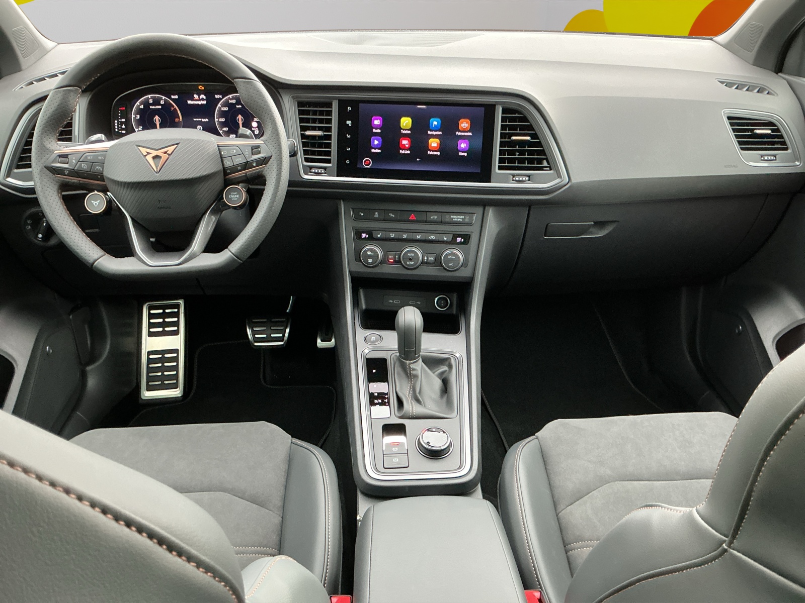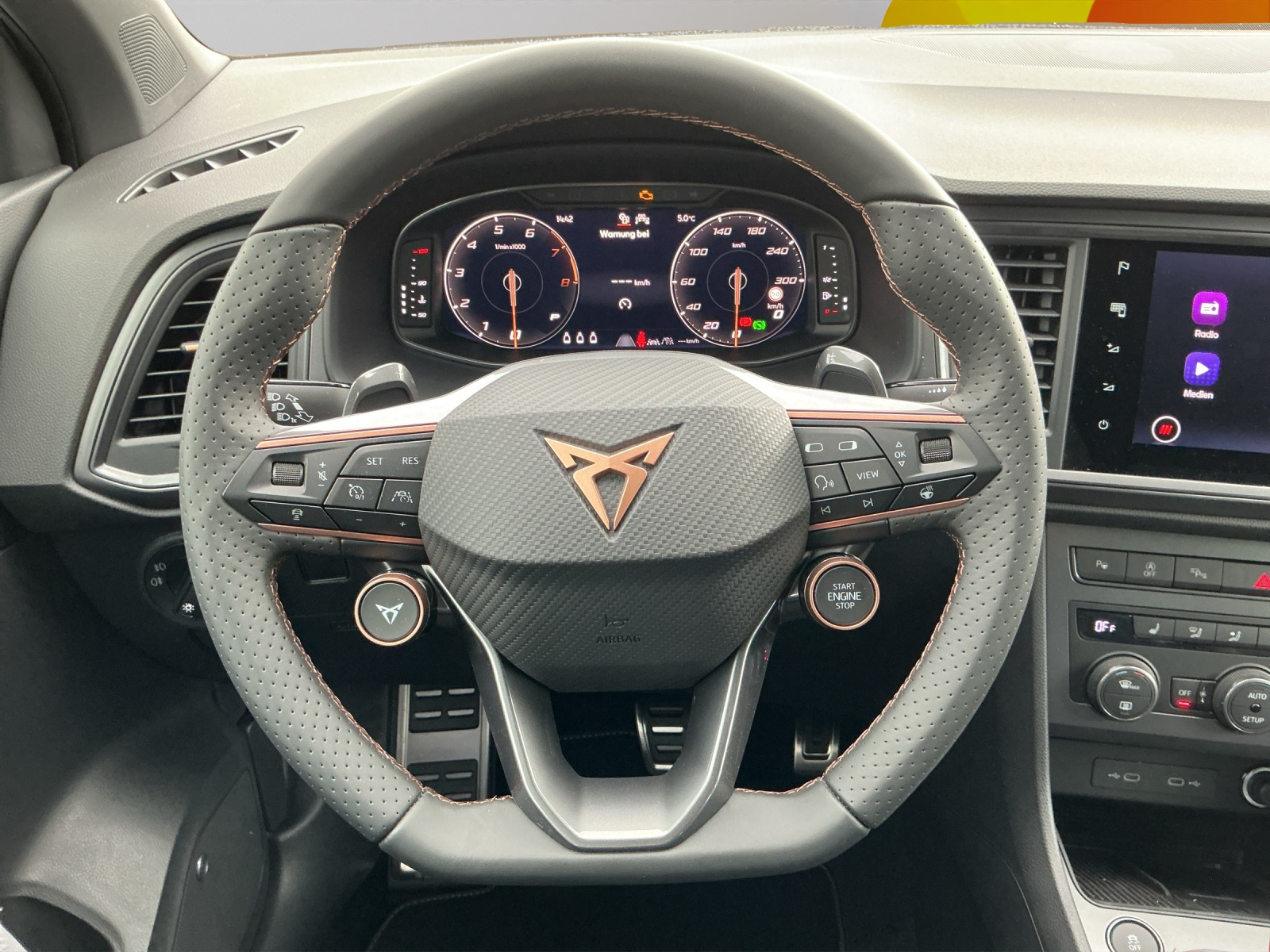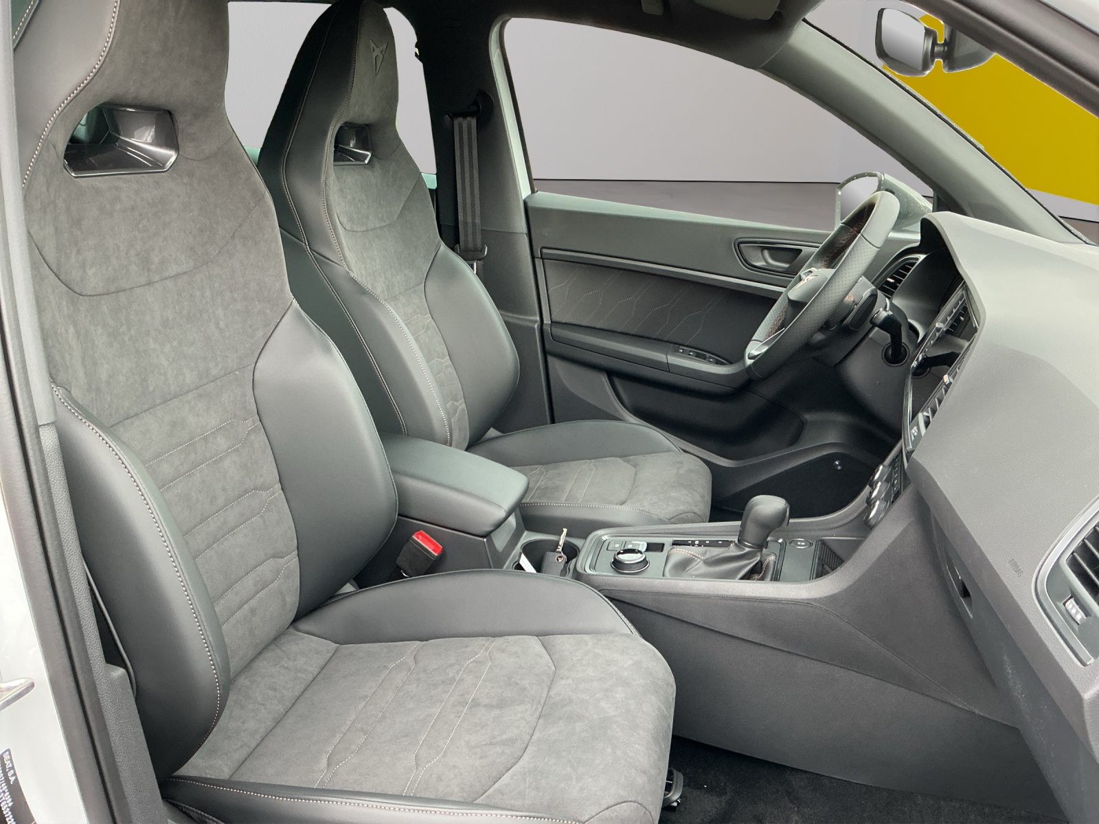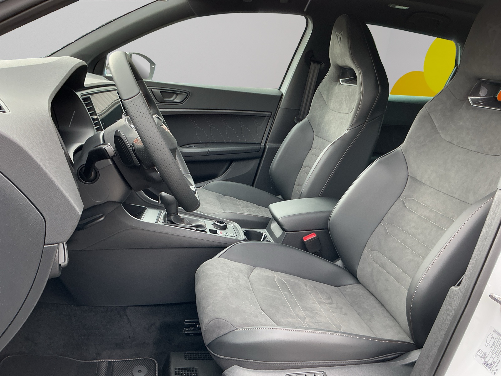 Serienausstattung ABS, EBV elektronische Bremskraft-verteilung Abgedunkelte Scheiben ab B-Säule hinten Airbag: Airbag Beifahrer deaktivierbar Airbag: Airbag Fahrer und Beifahrer Airbag: Knieairbag auf der Fahrerseite Airbag: Kopfairbags vorne und hinten Airbag: Seitenairbags für Fahrer und Beifahrer Assist: Aufmerksamkeits- und Müdigkeitserkennung (ADA) Assist: Einparkhilfe vorne und hinten mit optischer Anzeige Assist: Elektronische Parkbremse mit Auto Hold Funktion Assist: Lane assist (Spurhalteassistent) Assist: Multifunktionskamera Assist: Multikollisionsbremse Assist: Parklenkassistent Assist: Regen-/Lichtsensor Assist: Top View Camera (Rundumblick) Aussenspiegel elektrisch einstell-, beheiz- und einklappbar Aussenspiegel mit Beifahrerspiegelabsenkung Aussenspiegel mit LED-Umfeldbeleuchtung Aussenspiegel und Türgriffe in Wagenfarbe Automatisch abblendender Innenrückspiegel Beleuchtete Sonnenblende links mit abdeckbarem Spiegel und Lasche, rechts mit abdeckbarem Spiegel CUPRA Drive Profile mit "driving experience button" Comfort, Sport, CUPRA, Individual, Snow, Offroad Dekor: Dekorblenden in Grau glänzend Dekor: Türverkleidung mit Ambient light Dreipunkt-Automatiksicherheitsgurte auf allen Plätzen ESC mit EBA, DSR, XDS und Reifendruckkontrolle Einstiegsleisten in Aluminium Elektrische Fensterheber vorne und hinten mit Komfortschaltung und Einklemmschutz Fahrwerk: Adaptive Fahrwerksregelung DCC Fahrwerk: Progressivlenkung Fussmatten vorne und hinten Garantie: Cupra 12 Jahre Gewährleistung gegen Karosserie-Durchrostung Garantie: Cupra 3 Jahre Lack-Gewährleistung Garantie: Cupra Hersteller-Garantieverlängerung für das 3., 4. und 5. Jahr / max.100000 km Heckscheiben-Wisch-/Waschanlage mit Intervall Klima: 2-Zonen Climatronic Lackierung: Uni-Lackierung Lenkrad: Beheizbares Ledermultifunktionslenkrad mit Schaltwippen Licht: Coming-home-Funktion Licht: Drittes Bremslicht Licht: LED-Heckleuchten mit dynamischem Blinklicht Licht: LED-Nebelscheinwerfer mit Cornering-Funktion Licht: LED-Scheinwerfer für Abblend- und Fernlicht Licht: Leuchtweitenregulierung dynamisch Licht: Nebelschlussleuchte Media: 2 USB C Anschlüsse hinten und vorne Media: 9.2" 3D Infotainment (MIB3) Media: CUPRA Connect Online Infotainment für Navigationssystem Media: CUPRA Connect Remote & Access für Navigationssystem Media: CUPRA Connect Safety & Services für Navigationssystem Media: CUPRA Connectivity Box Media: CUPRA FullLink für Navigationssystem Media: CUPRA Navigationssystem Media: DAB+ (Digital Audio Broadcasting) Media: Kartenmaterial ''Europa'' Media: Mobiltelefon Freisprechanlage Bluetooth Paket: Fahrerassistenzpaket M für Navigationssystem Pyrotechnische Gurtstraffer und Gurtkraftbegrenzer Radlaufblenden in Wagenfarbe Räder: Alufelgen 8J x 19", "EXCLUSIVE"in Sport Black Matt Räder: Reifenreparatur-Set (Tire Fit) Schlüsselloses Schliess- und Startsystem (KESSY) Servolenkung mit geschwindigkeitsabhängiger Lenkkraftunterstützung Sitze: 2 verstellbare Kopfstützen vorne und 3 hinten Sitze: CUPRA Sportschalensitze in Dinamica "Black" Sitze: Easy Backseat Release (Rücksitzentriegelung im Kofferraum) Sitze: Geteilt abklappbare Rücksitzlehne 1/3 - 2/3 Sitze: Kindersitzverankerung ISOFIX hinten Sitze: Mittelarmlehne hinten Sitze: Mittelarmlehne vorne Sitze: Vordersitze höhenverstellbar mit Lendenwirbelstütze Sportabgasanlage mit 4-fach Endrohr Stopp - Start- und Rekuperationssystem Wegfahrsperre elektronisch Zentralverriegelung mit Funkfernbedienung, 2 Funkschlüssel